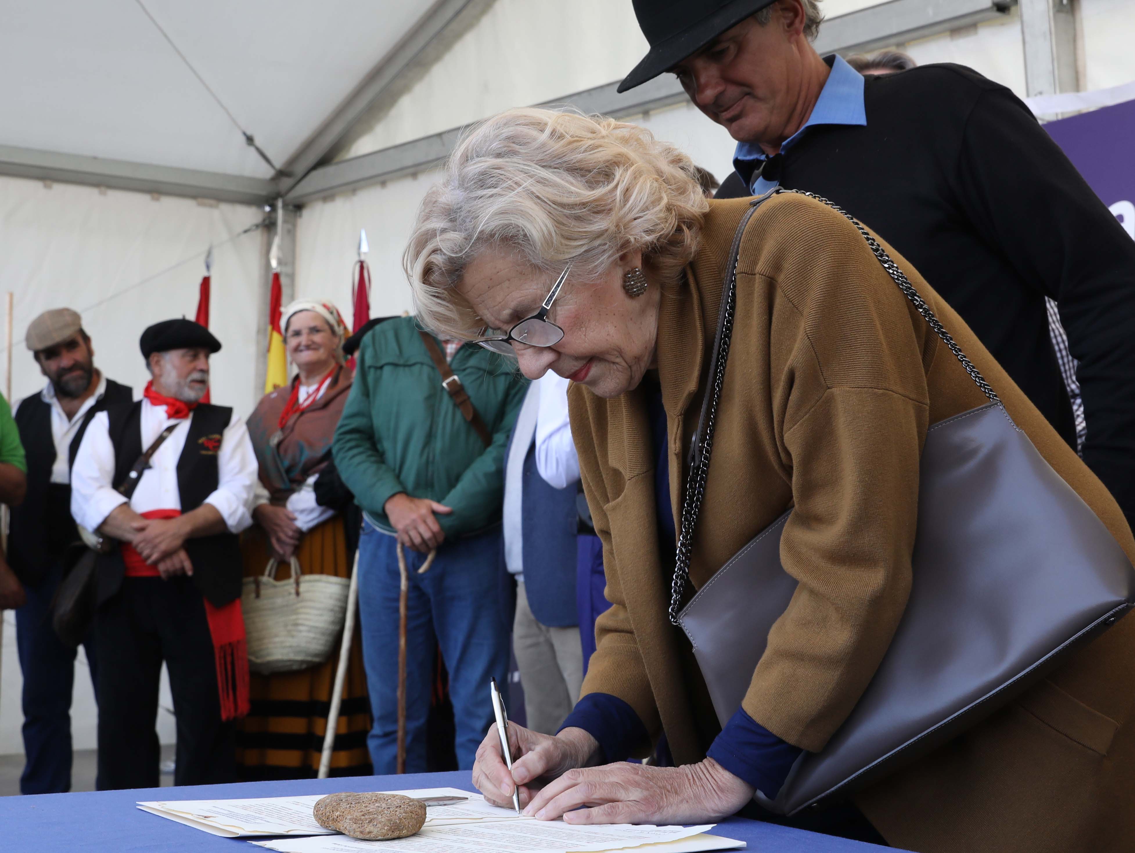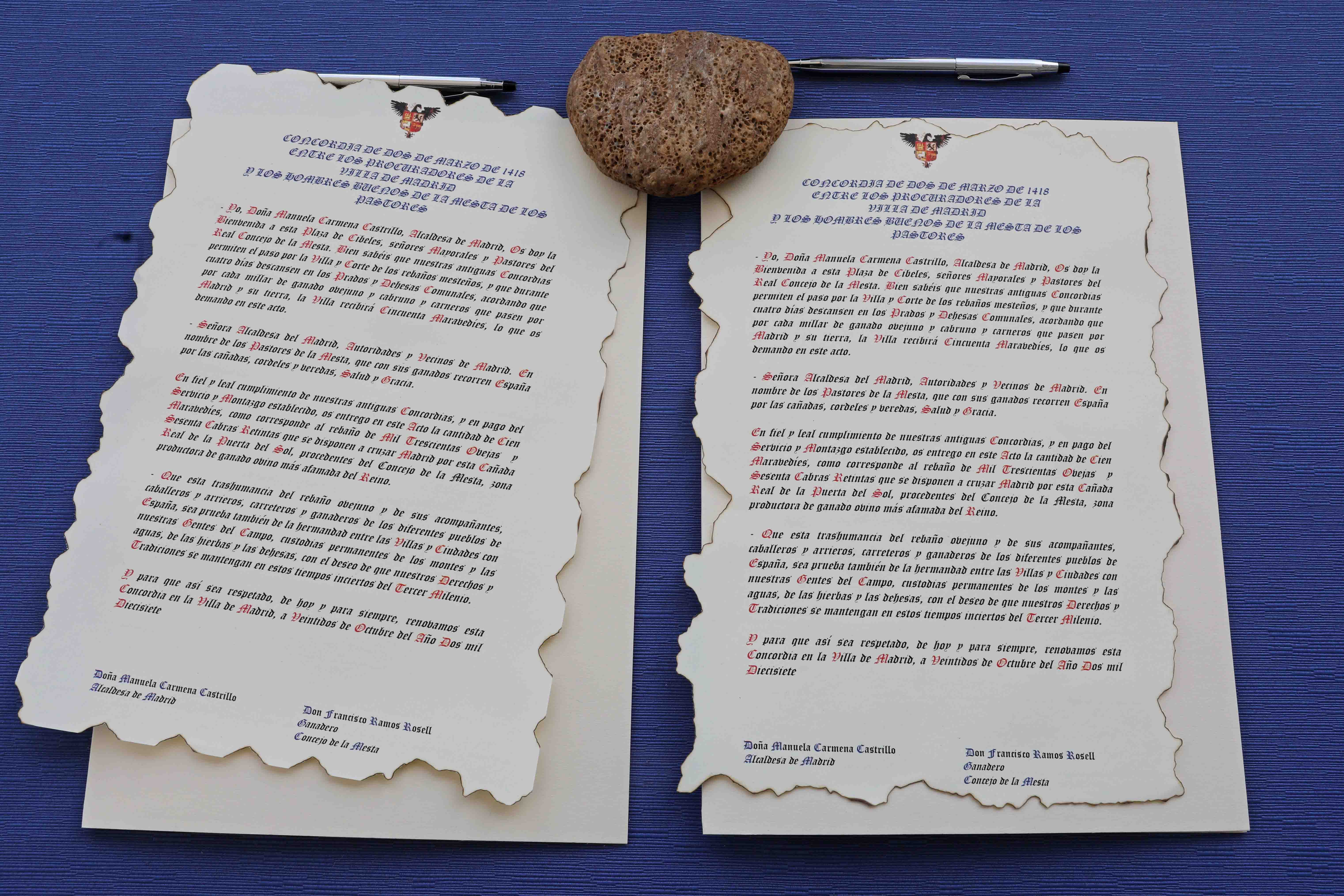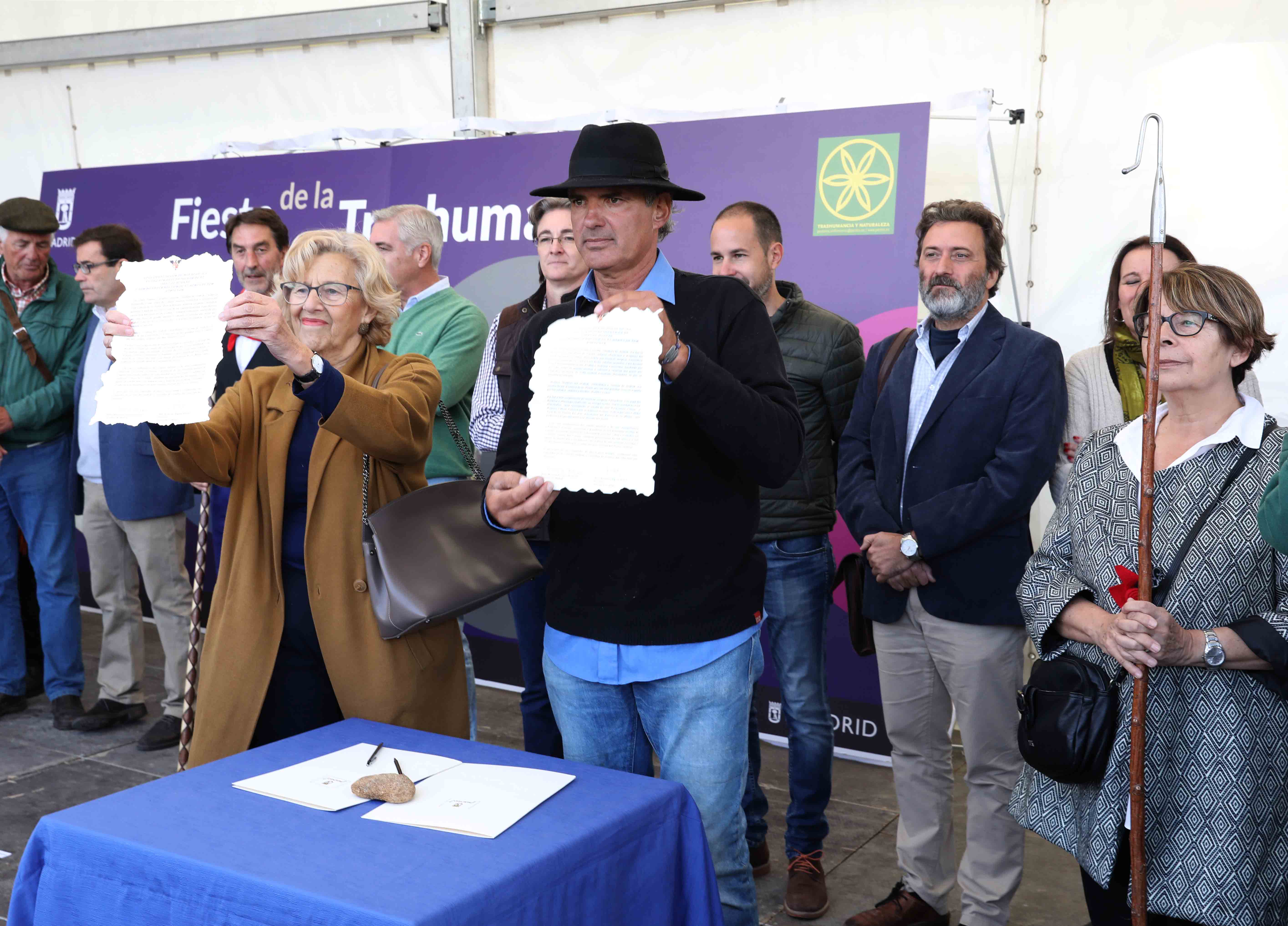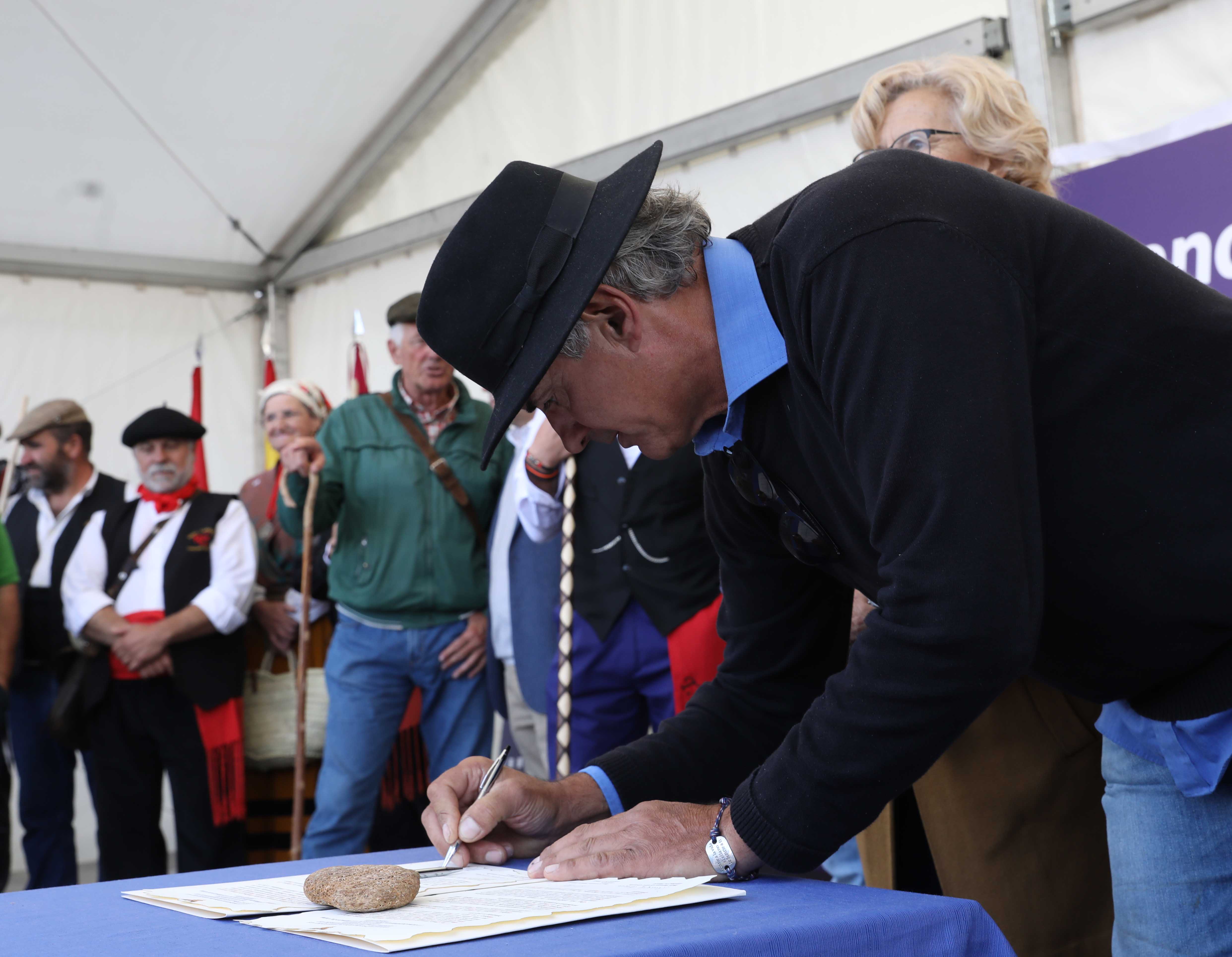 La alcaldesa, Manuela Carmena, ha dado la bienvenida a los pastores, acompañados por los mayorales, rabadanes y ganaderos, y ha recibido el pago de los “50 maravedís al millar” estipulados por la Concordia de 1418 entre los Hombres Buenos de la Mesta y los Procuradores del Concejo de la Villa. La rúbrica un año más de esa Concordia. Junto a ellos han estado presentes, entre otros, la primera teniente de alcalde, Marta Higueras; el tercer teniente de alcalde, Mauricio Valiente, y la delegada de Medio Ambiente y Movilidad, Inés Sabanés, además de representantes de la Comunidad de Madrid y del Ministerio de Agricultura, así como de los pastores y ganaderos.