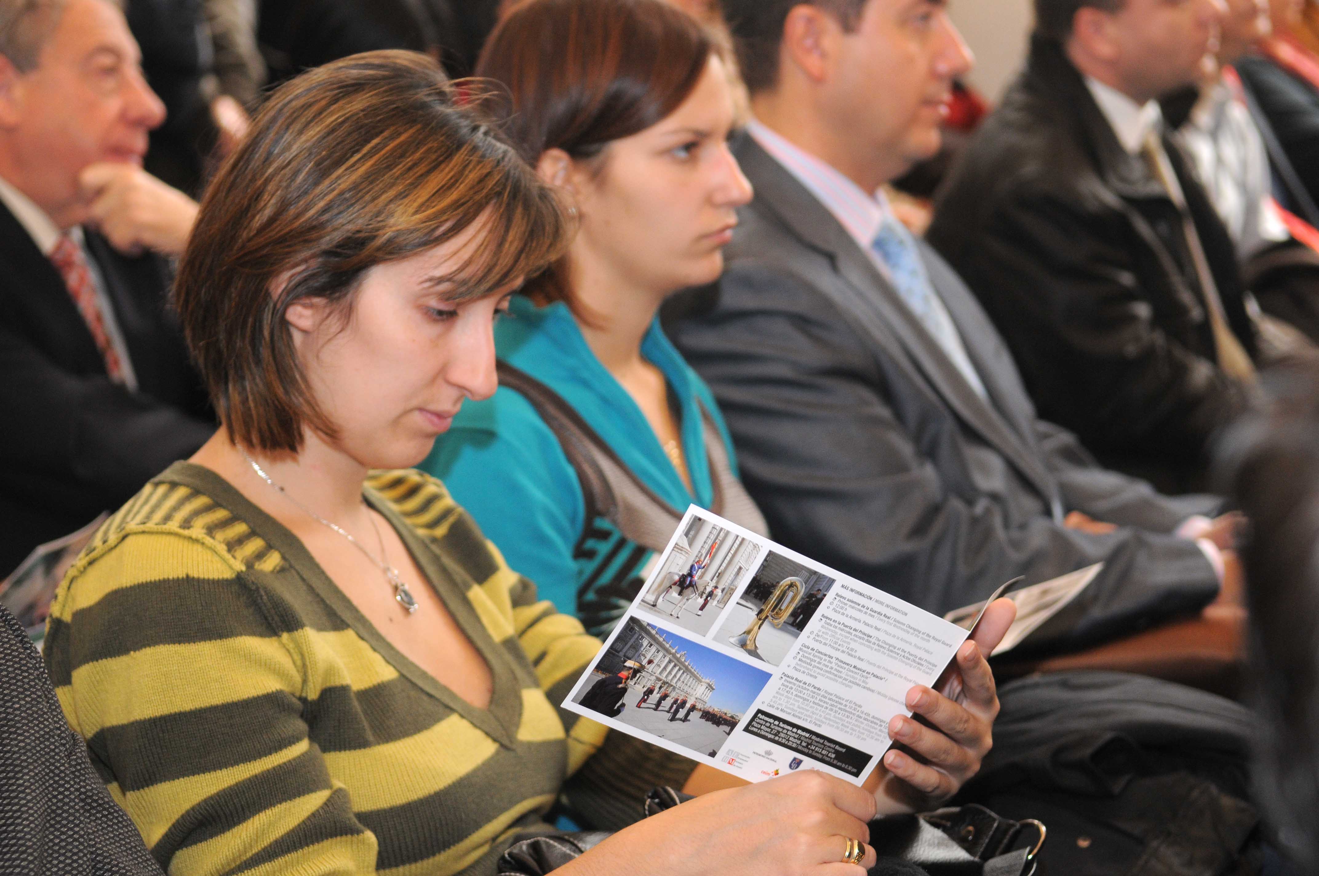 El delegado de Economía, Miguel Ángel Villanueva, ha presentado hoy el nuevo producto turístico Madrid y la Guardia Real. En la imagen 2 aparece acompañado del presidente de Patrimonio Nacional, Yago Pico de Coaña, y del Jefe del Cuarto Militar del Rey, Carlos Felipe Victoria de Ayala. En la imagen 3, una mujer lee el díptico editado por el Patronato de Turismo