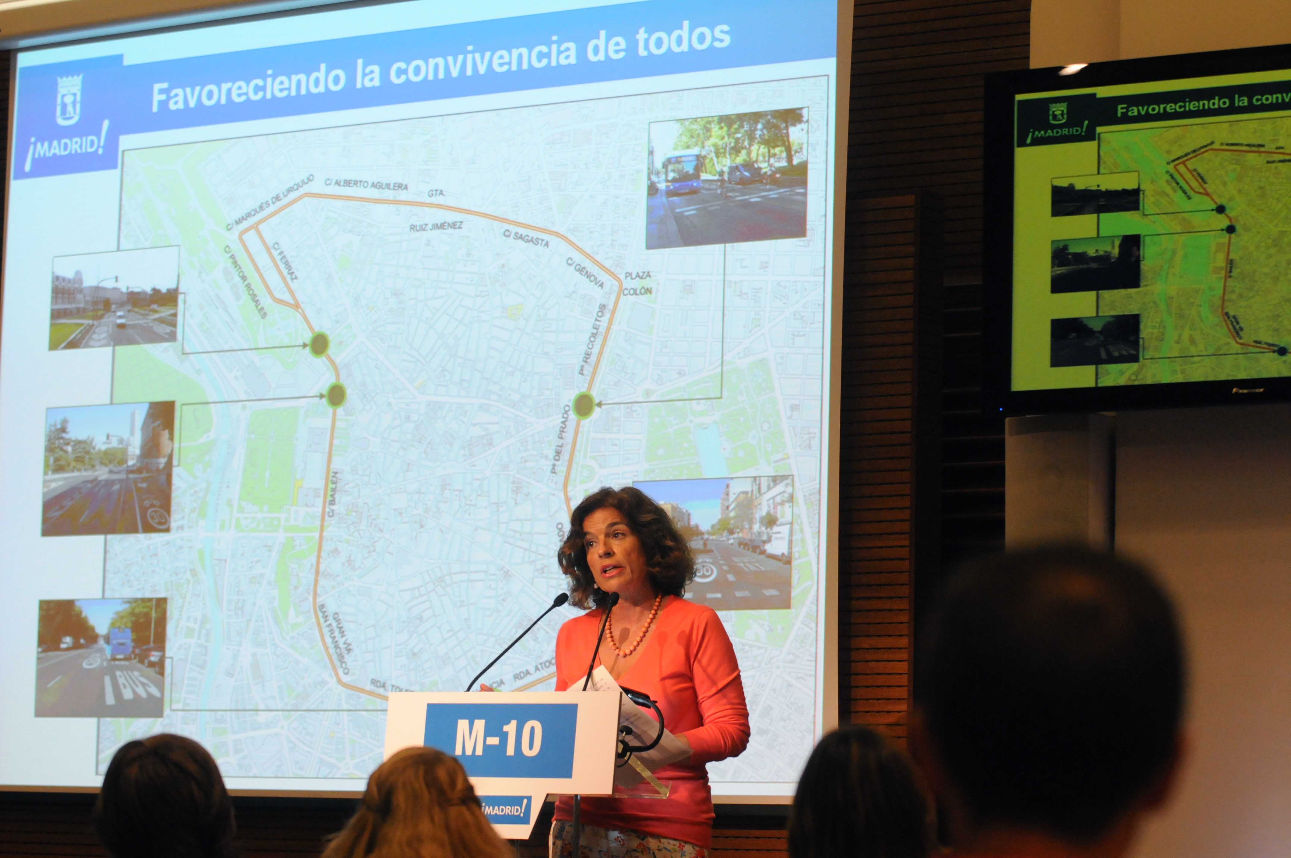 La alcaldesa de Madrid, Ana Botella, ha presentado la nueva M-10, un proyecto que hará más sostenible la movilidad en la ciudad antes de final de año. Con un coste inferior a los 500.000 euros y una mínima obra, la M-10 tendrá 10,3 kilómetros de ciclo-carril, 9,8 kilómetros de carril bus y 67 líneas adelantadas de detención en los semáforos para motos y bicis. Estará formada por el eje de las rondas y bulevares. Botella ha estado acompañada por el delegado de Medio Ambiente y Movilidad, Diego Sanjuanbenito.