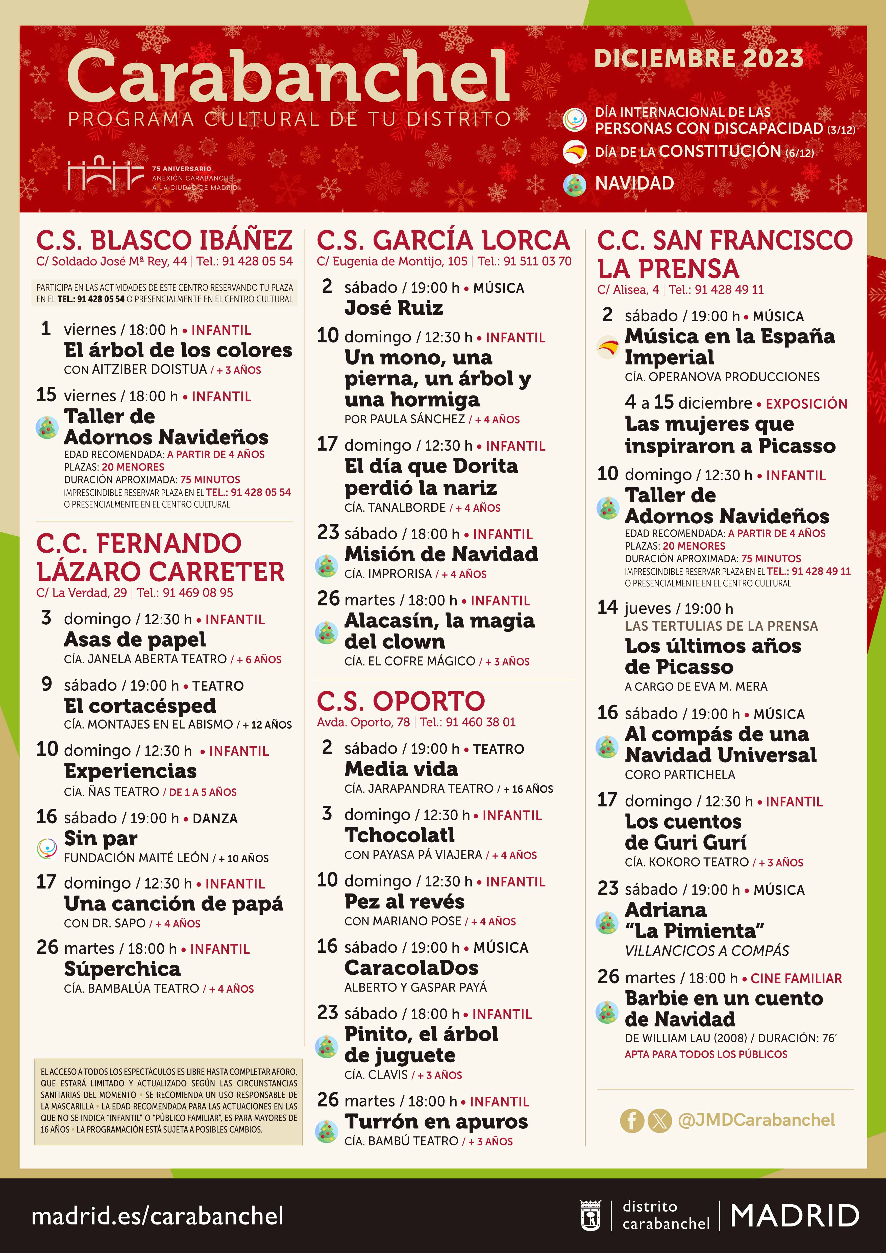 Teatro, cine y música coral completan la programación más navideña del San Francisco-La Prensa con ‘Los cuentos de Guri Gurí’ de la compañía Kokoro (domingo 17, a las 12:30 h), la proyección de ‘Barbie en un cuento de Navidad’ (martes 26 a las 18:00 h), corales con Partichela en ‘Al compás de una Navidad universal’ (sábado 16 a las 19:00 h) y ‘Villancicos al compás’ de Adriana La Pimienta (sábado 23 a las 19:00 h).