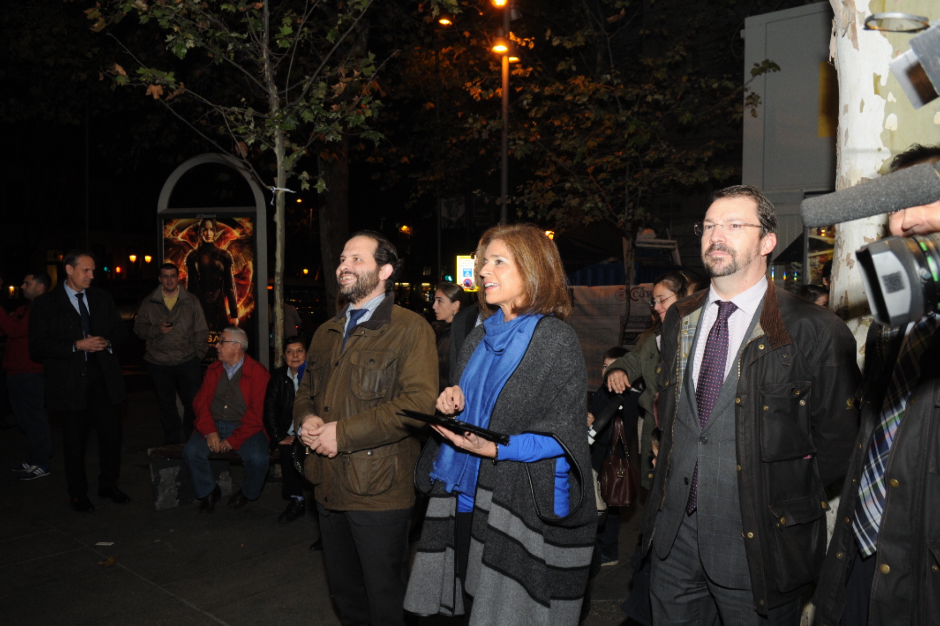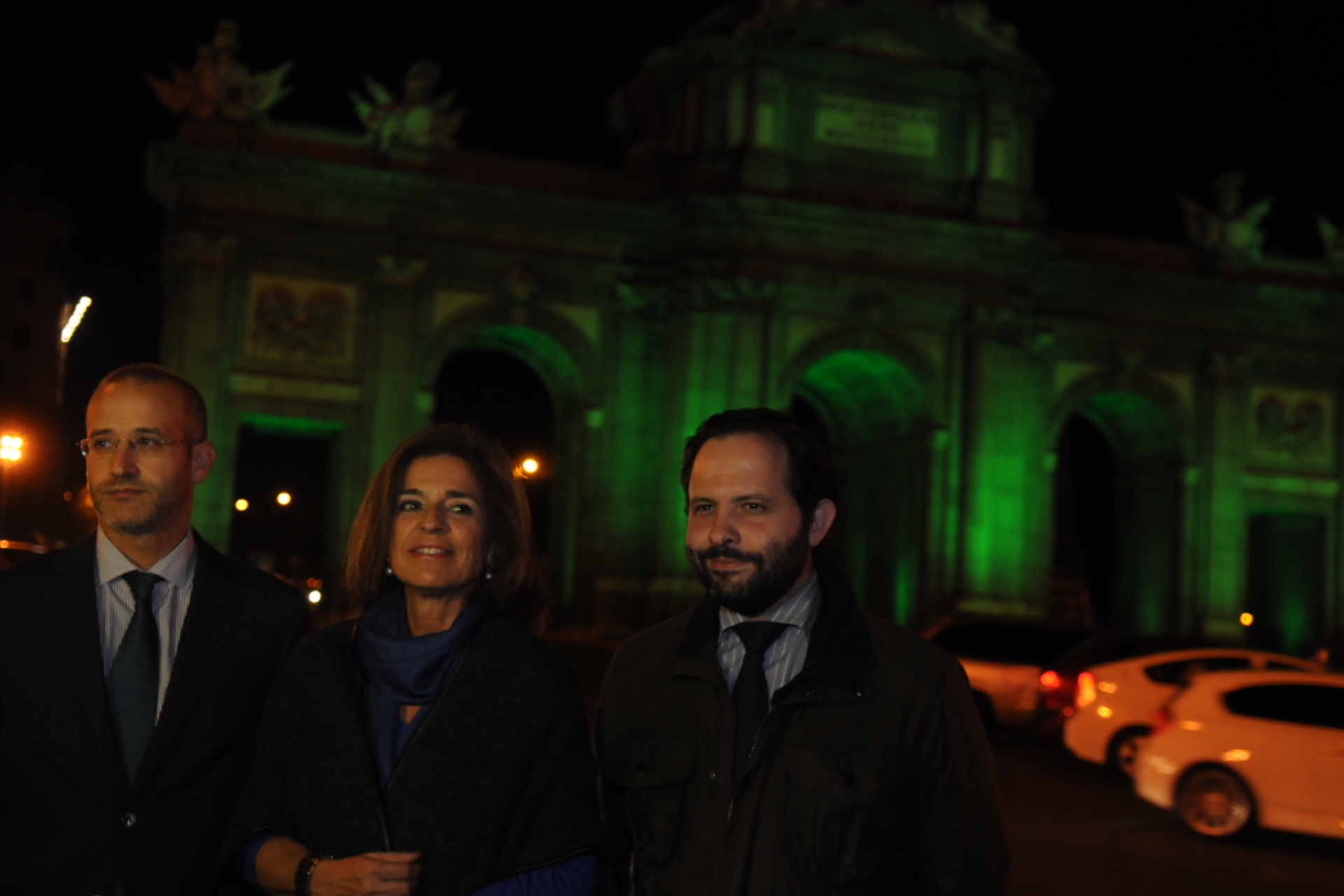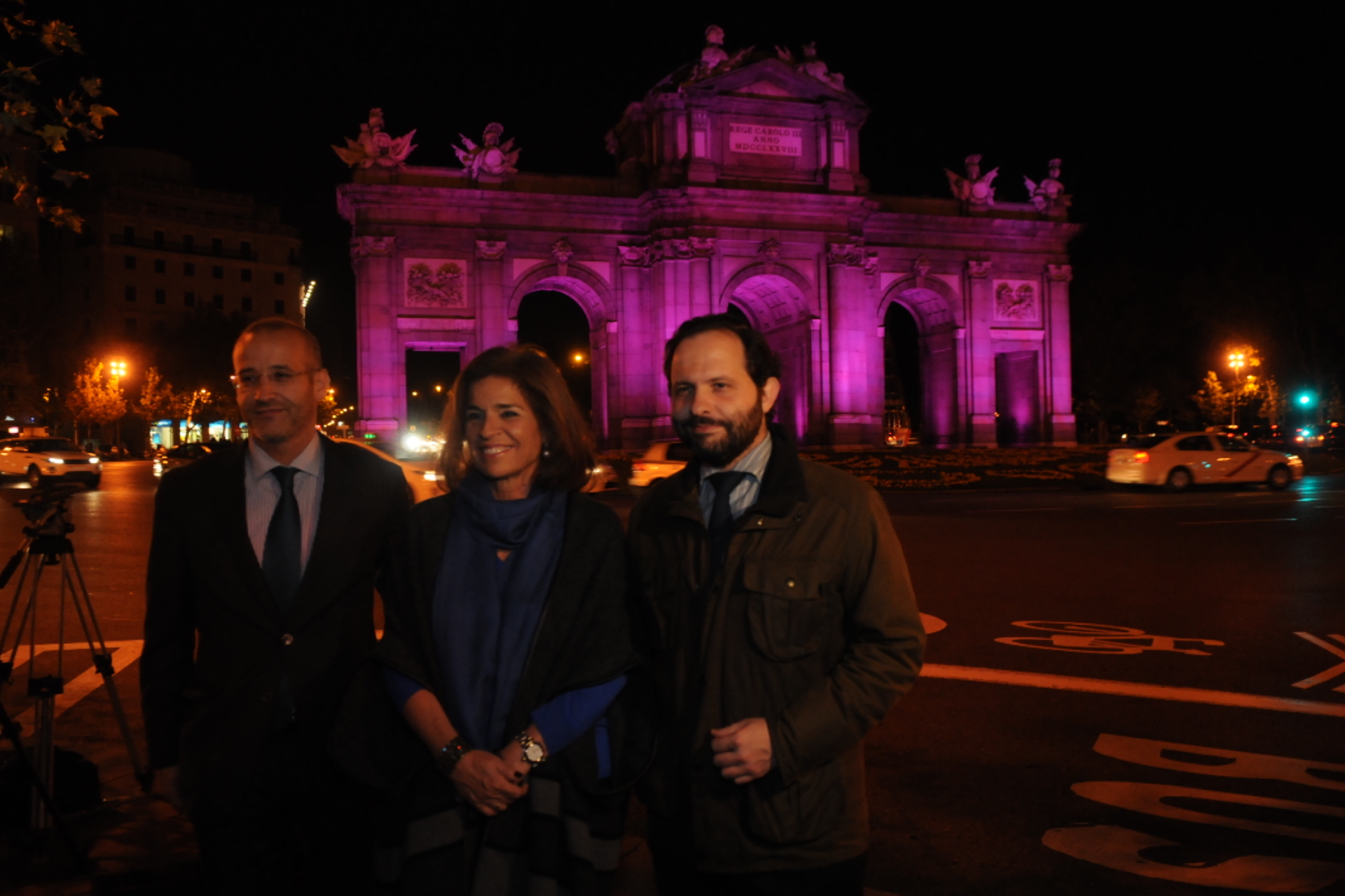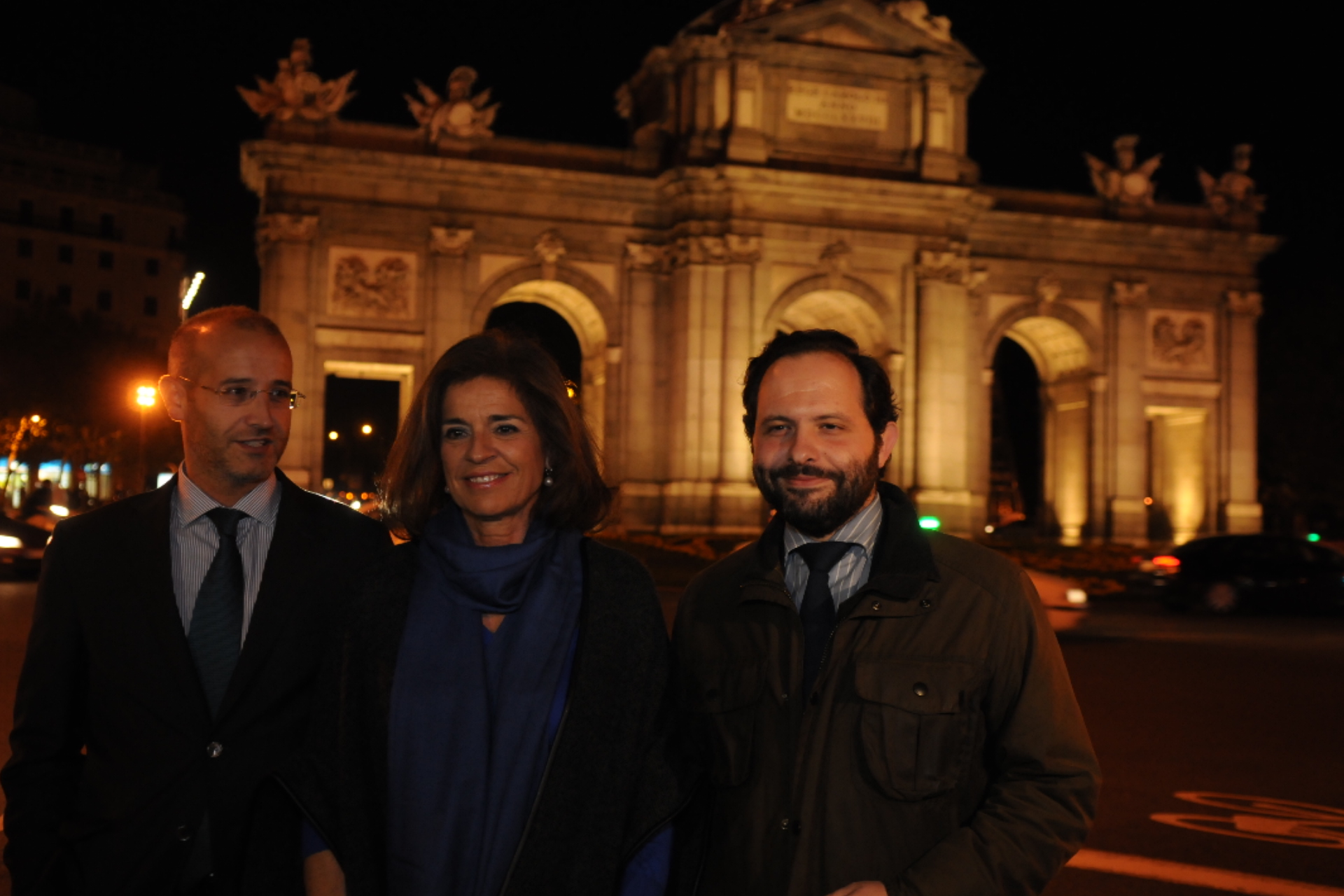 Ana Botella ha asistido hoy al encendido de la nueva iluminación ornamental de la Puerta de Alcalá, que es más eficiente y duradera.