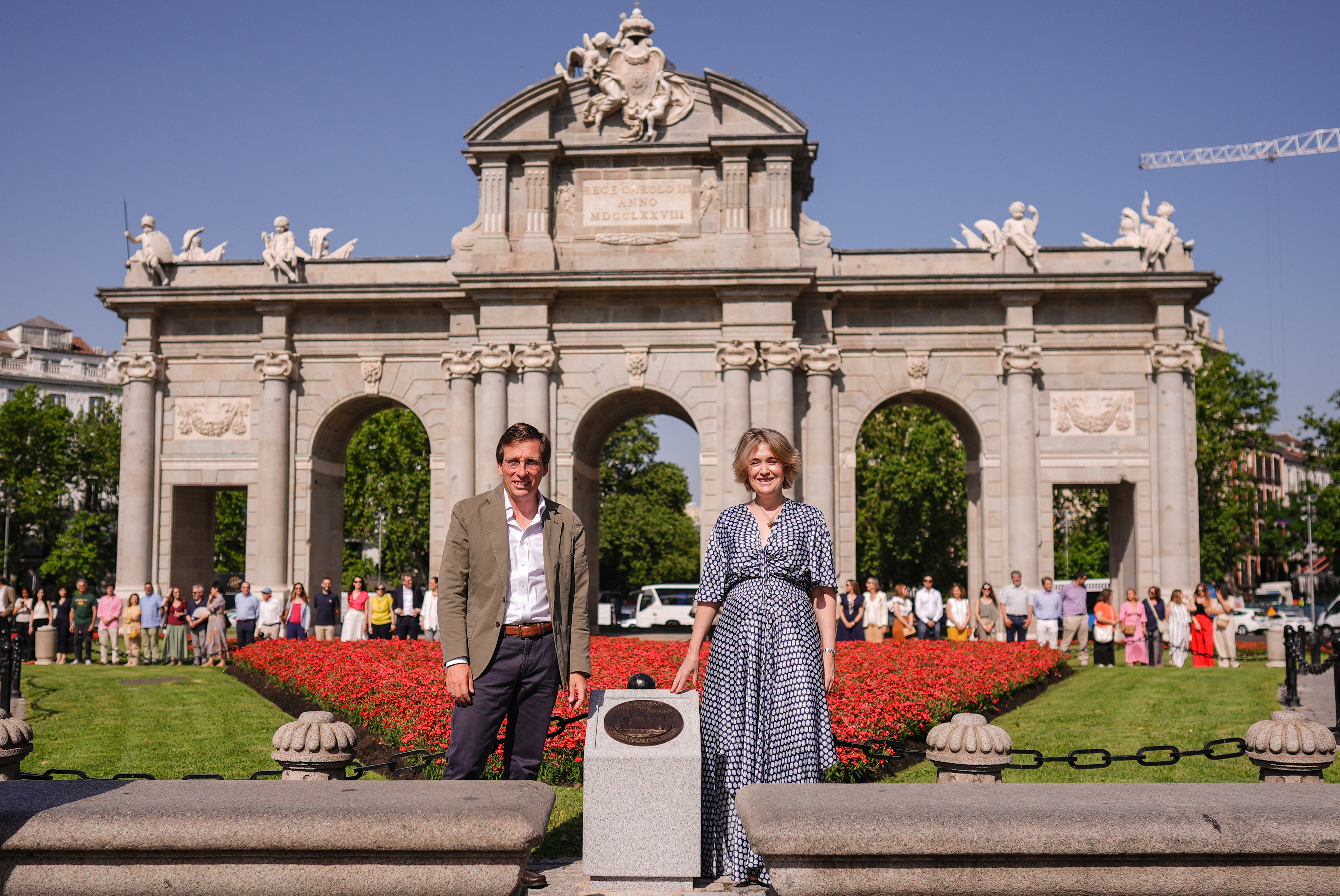 El alcalde de Madrid, José Luis Martínez-Almeida, acompañado por la delegada de Cultura, Turismo y Deporte, Marta Rivera de la Cruz, y las concejalas de Retiro, Andrea Levy, y Salamanca, Cayetana Hernández de la Riva, ha descubierto esta mañana la placa que conmemora la concesión del European Heritage Award/Europa Nostra Award a la restauración de la Puerta de Alcalá, un reconocimiento otorgado por la Comisión Europea y Europa Nostra y considerado el máximo galardón europeo en materia de patrimonio cultural.