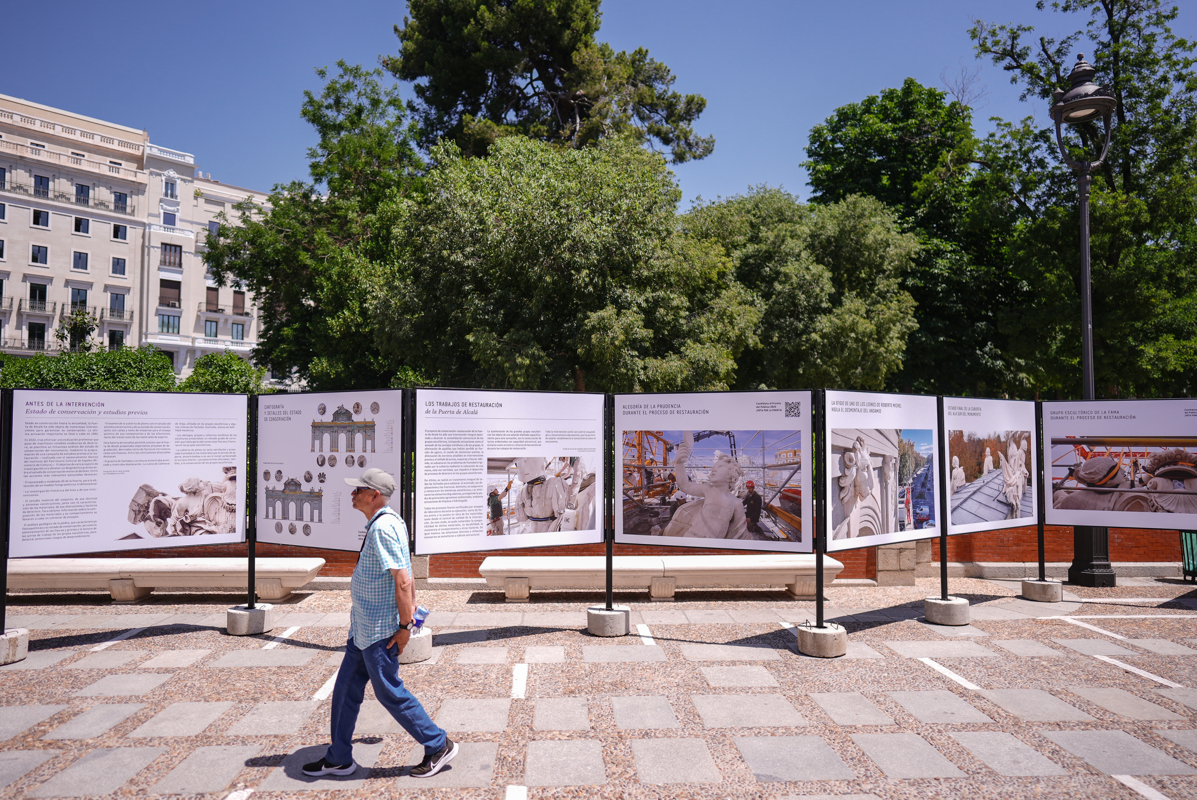 - La exposición instalada junto a la Puerta de Alcalá, que se podrá visitar hasta el 15 de septiembre, muestra la historia del monumento, su estado de conservación previo y el proceso de restauración