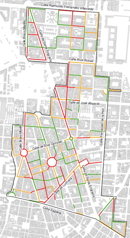 El proyecto aprobado hoy mantiene el ámbito espacial inicial, delimitado por las siguientes calles Bravo Murillo, Bretón de los Herreros, Carranza, Donoso Cortés, Espronceda, Fernández de la Hoz, García de Paredes, Génova, José Abascal, Santísima Trinidad, Magallanes, Modesto Lafuente, Monte Esquinza, Orfilia, Ponzano, Raimundo Fernández Villaverde, Ríos Rosas, Sagasta, San Bernardo, Santa Engracia, Zurbano, Zurbarán y las glorietas de Bilbao, Ruiz Jiménez, General Álvarez de Castro y la plaza de Alonso Martínez.