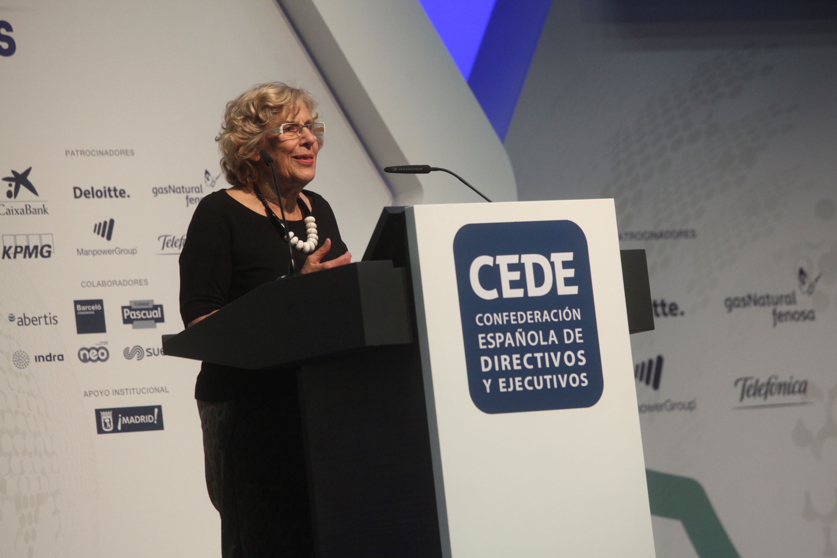 La alcaldesa de Madrid, Manuela Carmena, participó ayer en el acto de clausura del Congreso de Directivos de la Confederación Española de Directivos y Ejecutivos (CEDE) que se celebró en IFEMA ante cerca de 1.100 dirigentes españoles y donde numerosos líderes políticos, sociales y empresariales han reflexionado ante los directivos españoles sobre cómo afrontar la evolución de las nuevas tecnologías de la información y la comunicación, que provoca una aceleración constante del cambio y de la situación actual.