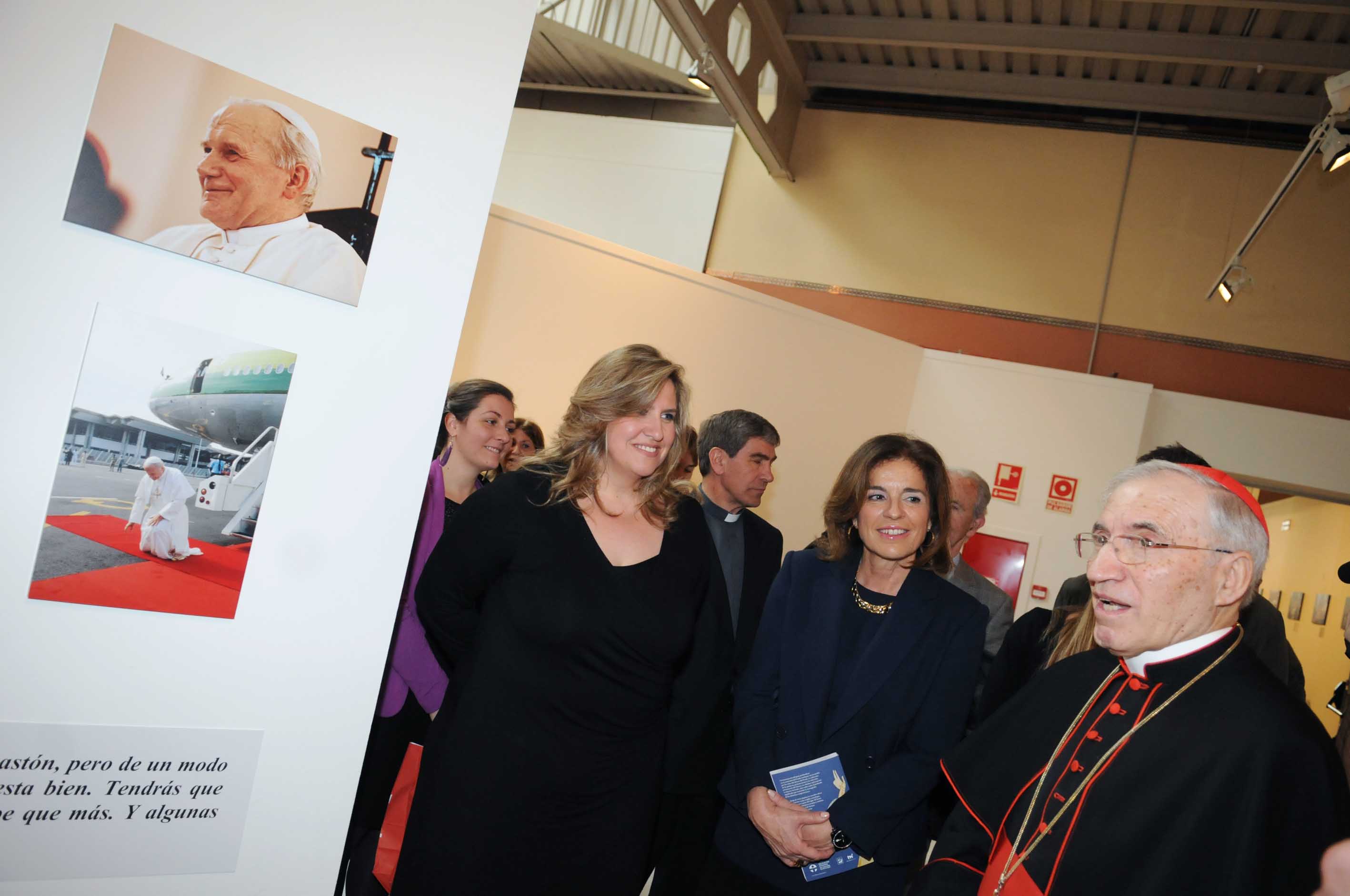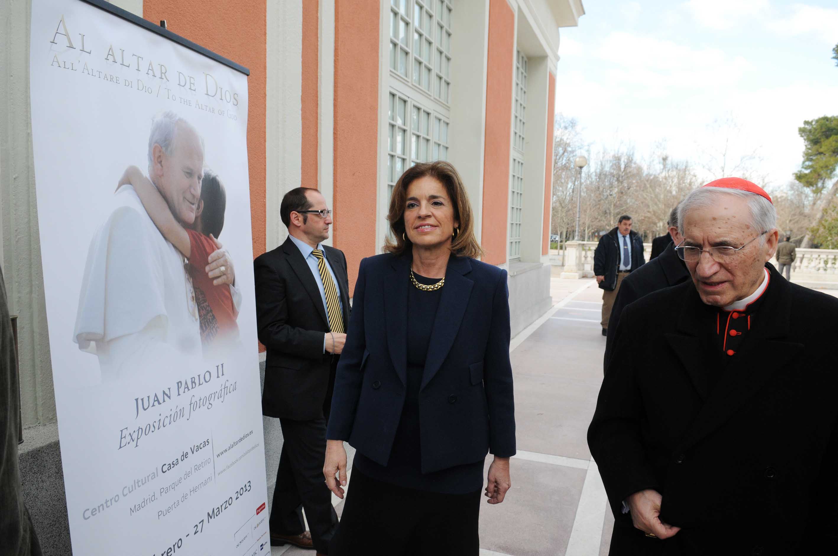 La alcaldesa, Ana Botella, acompañada por el cardenal arzobispo de Madrid, Antonio María Rouco Varela, y la presidenta del distrito de Retiro, Ana Román, ha inaugurado hoy la exposición Al Altar de Dios, dedicada al Papa Juan Pablo II. La Casa de Vacas del Retiro acoge esta muestra fotográfica, "que capta el magnetismo" de Juan Pablo II, en palabras de Ana Botella.