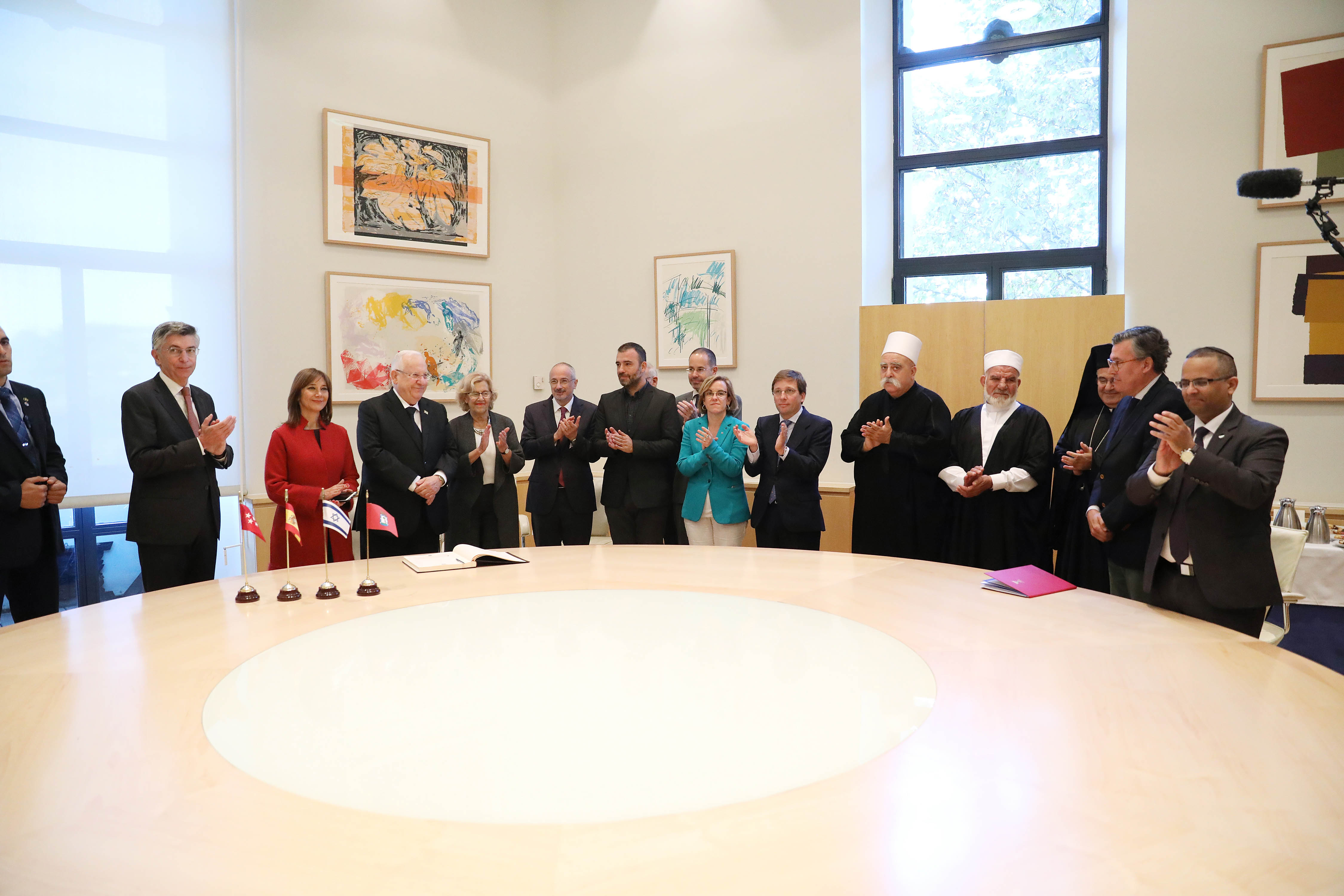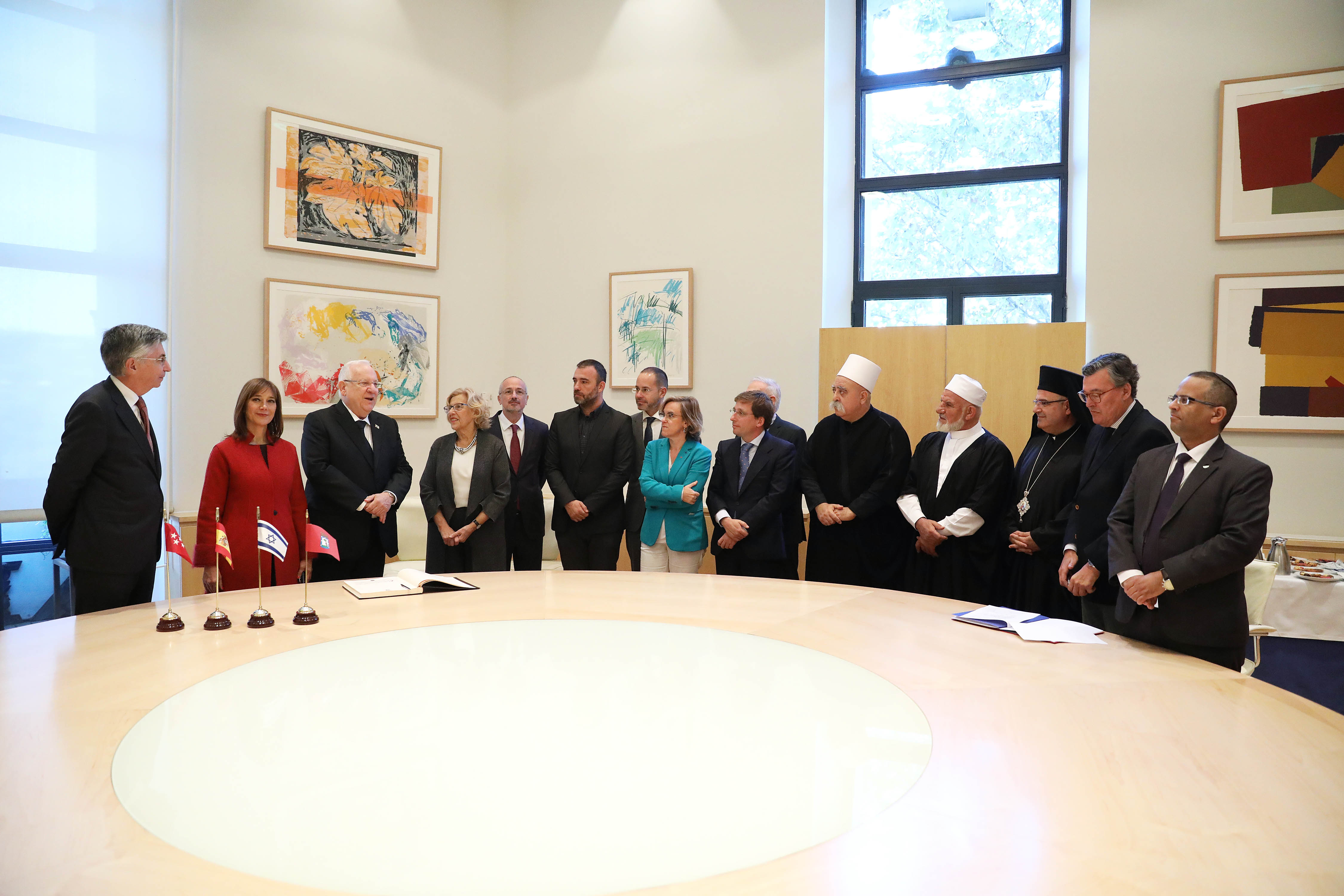El presidente israelí ha presentado a la alcaldesa a los representantes de las tres grandes religiones implantadas en Israel que le acompañaban, mientras que Carmena ha hecho lo propio con los concejales de los cuatro grupos municipales: Ignacio Murgui; segundo teniente de alcalde; José Luis Martínez Almeida, portavoz del PP; Purificación Causapié, portavoz del PSOE, y Bosco Labrado, en nombre de Ciudadanos.