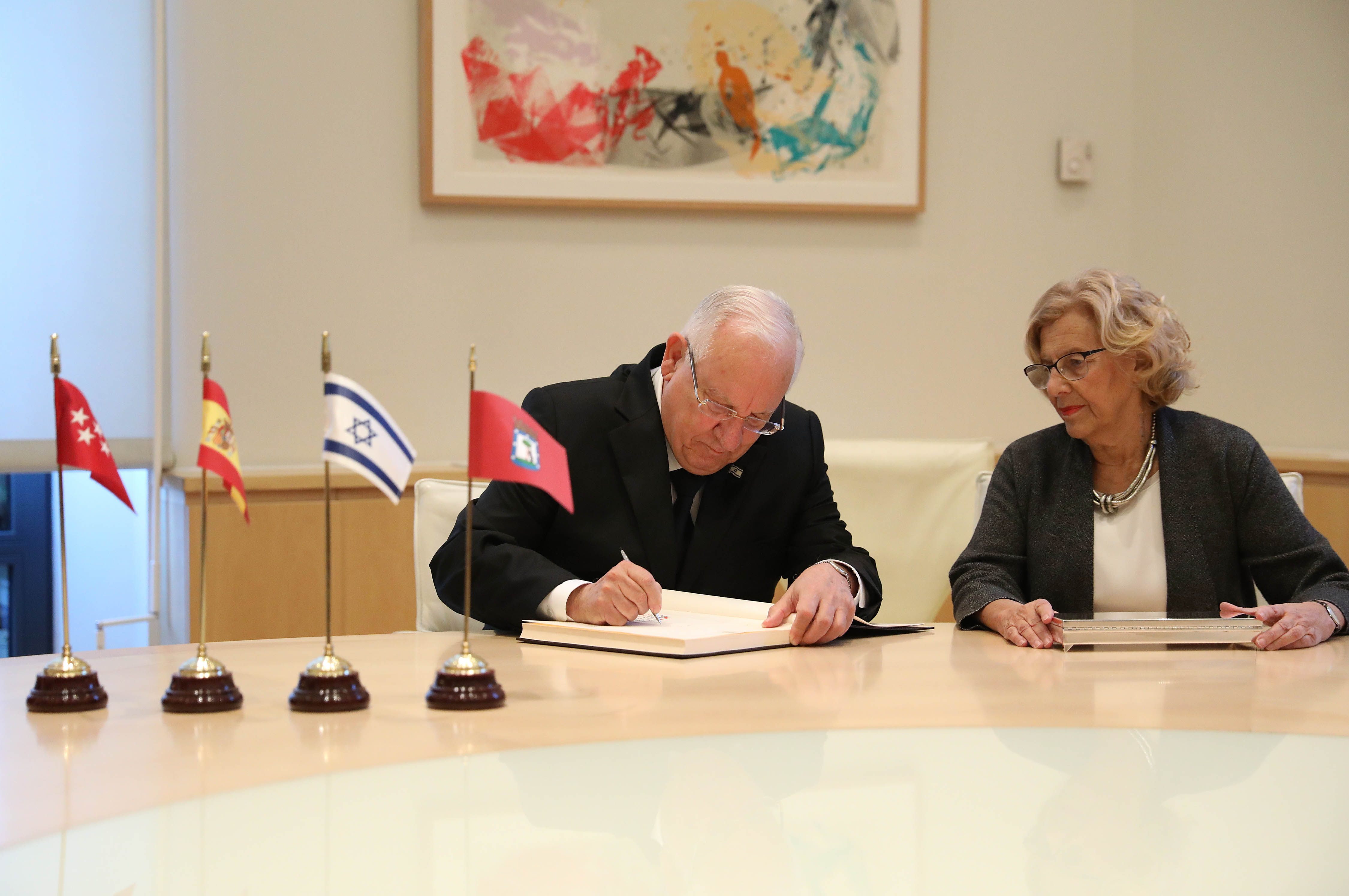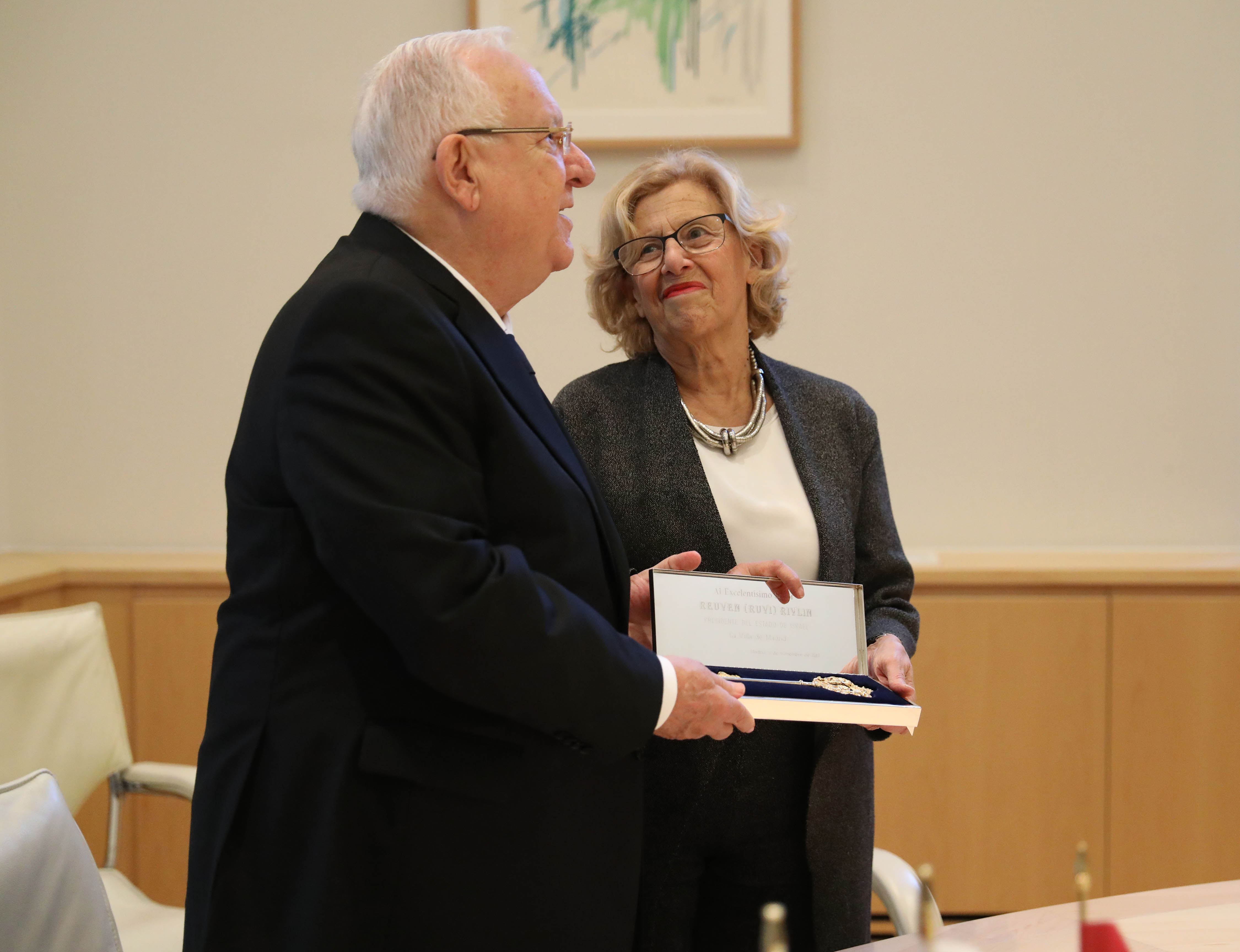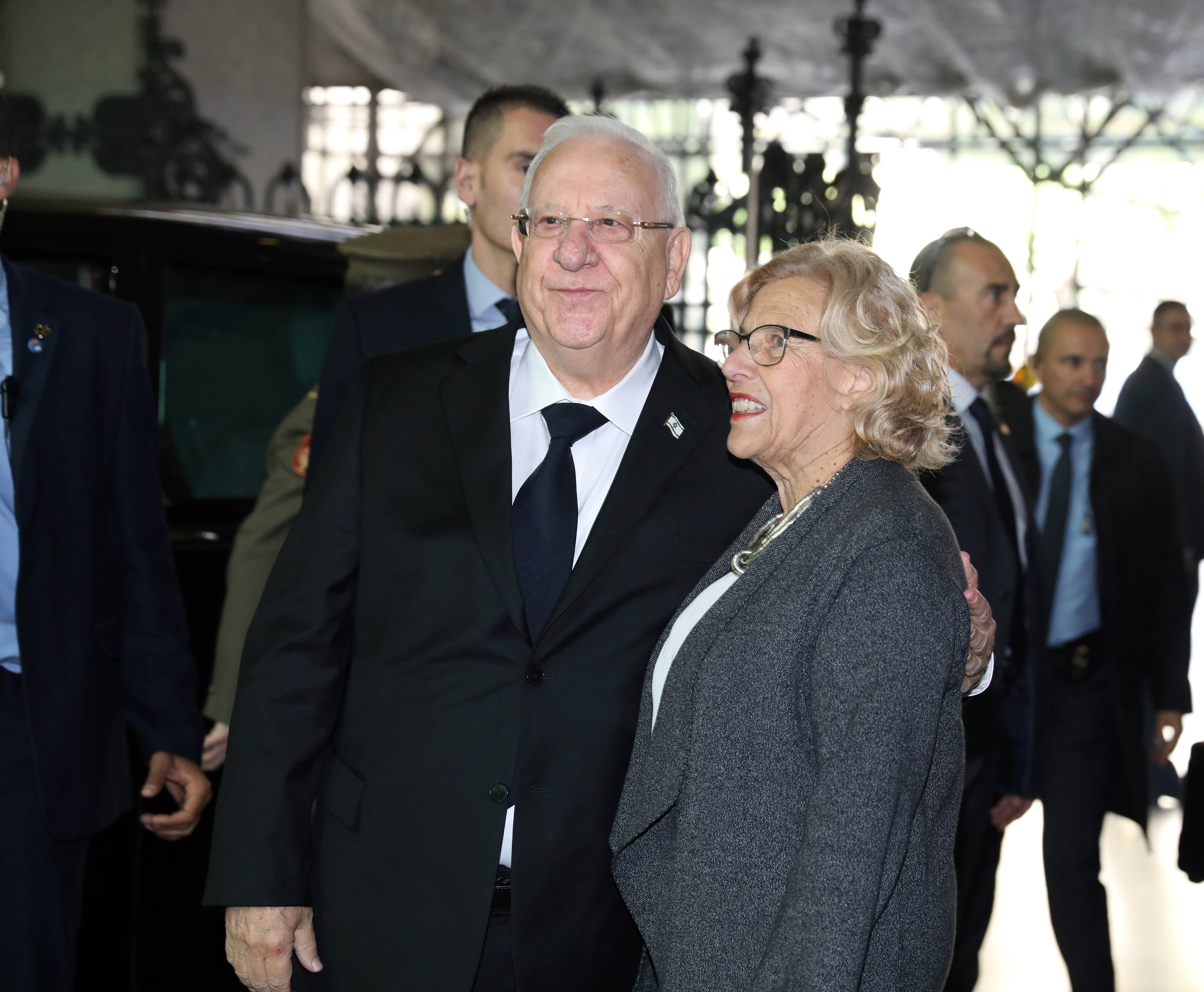La alcaldesa de Madrid, Manuela Carmena, ha recibido esta mañana en el palacio de Cibeles al presidente de Israel, Reuven Rivlin, al que ha entregado la Llave de Oro de la ciudad, según establece el Reglamento de Protocolo y Ceremonial para aquellos mandatarios que visitan la capital en viaje de Estado.