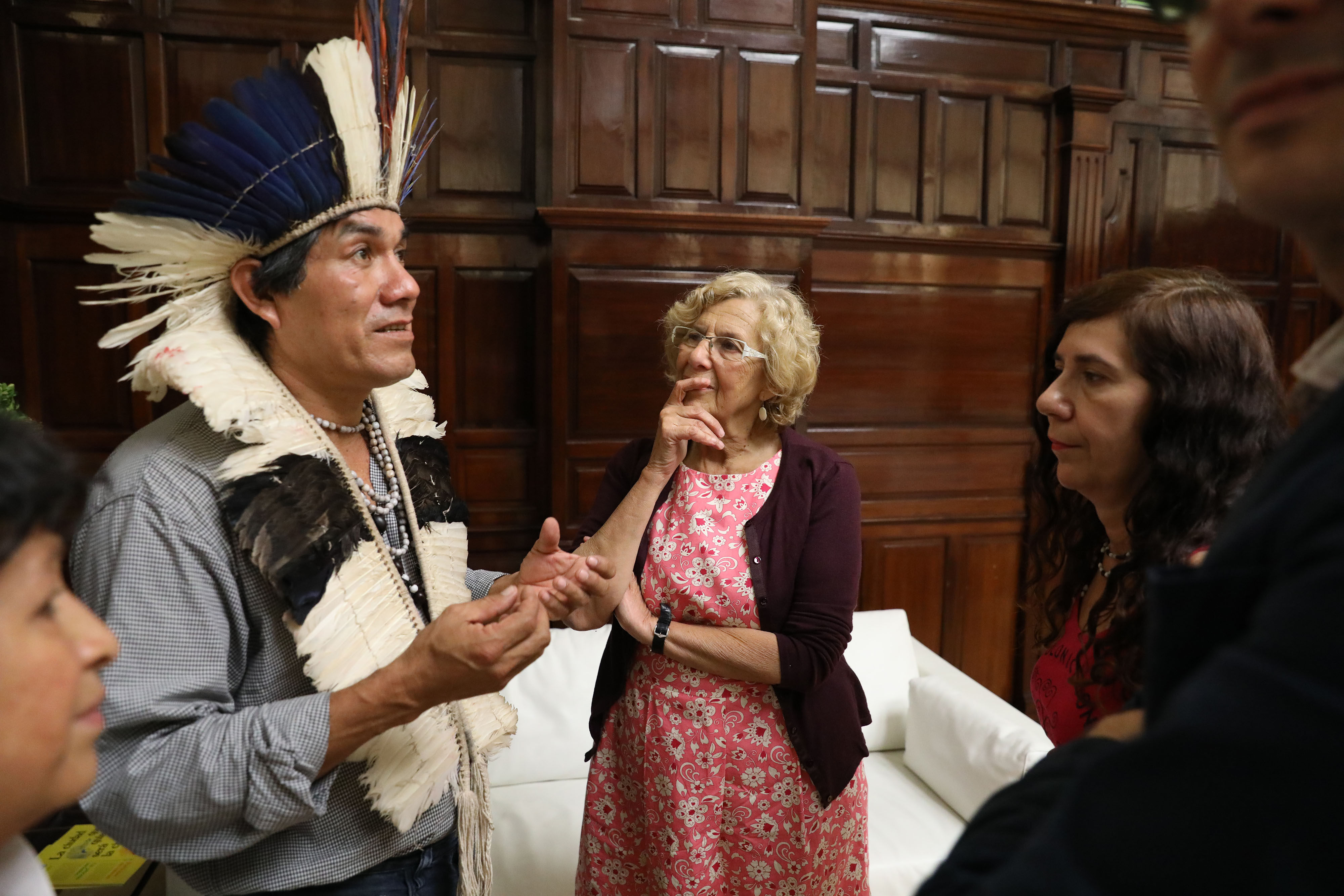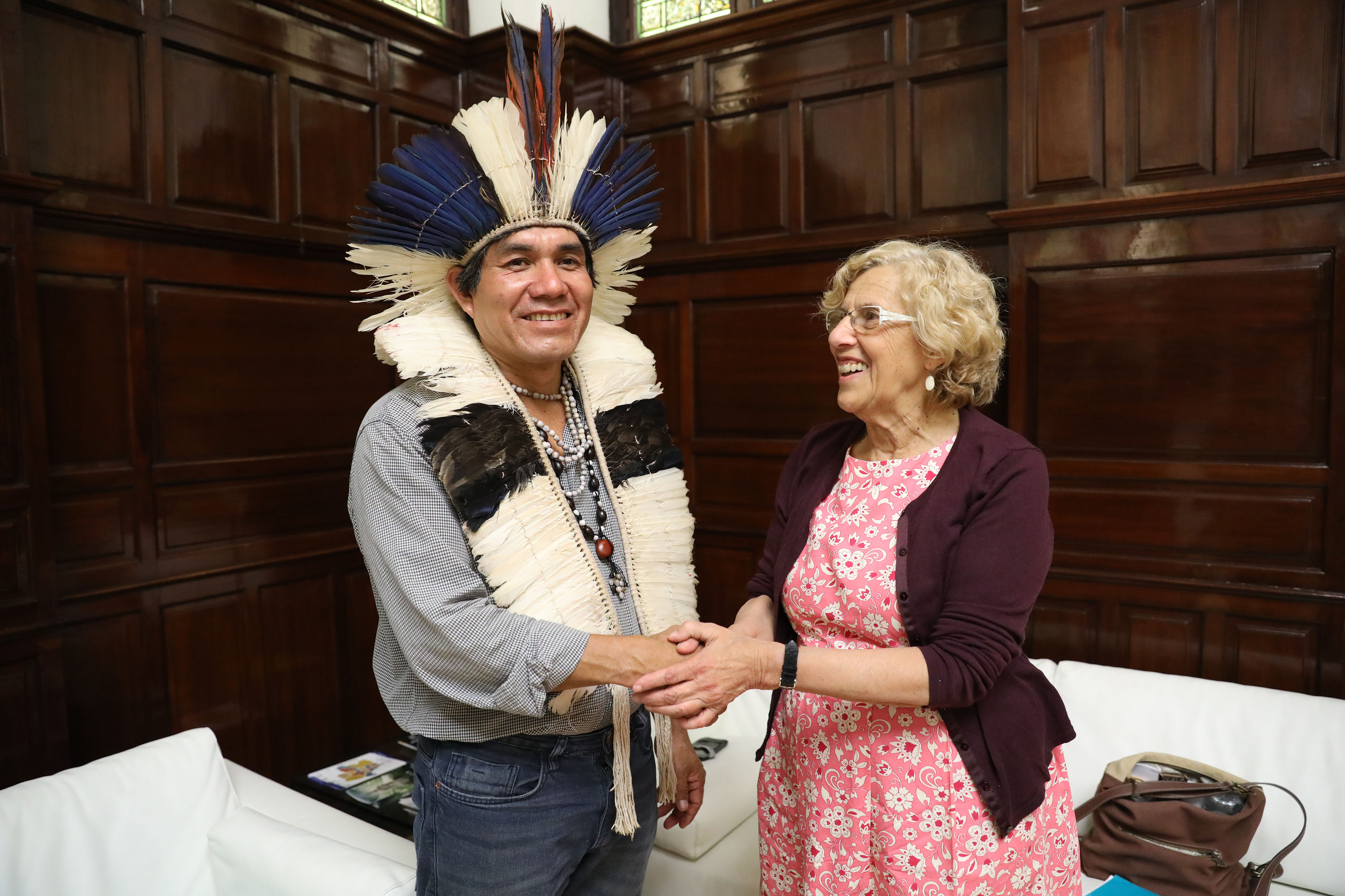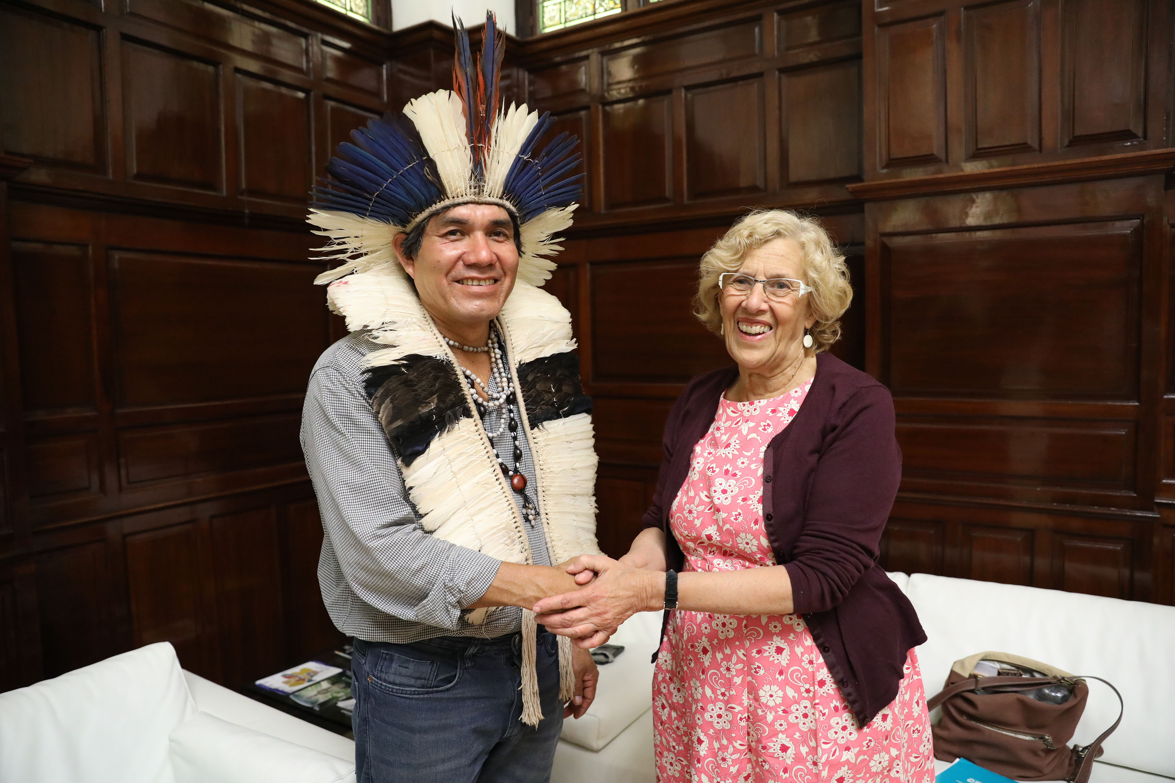 La alcaldesa de Madrid, Manuela Carmena, ha recibido en su despacho del palacio de Cibeles a Ladio Veron, representante de miles de indígenas de la etnia guaraní Kaiowá del Estado de Mato Grosso do Sul, una de las mayores de Brasil. Veron lleva dos meses de gira por Europa en busca de apoyo contra lo que él denuncia como el exterminio de los indios por parte del Estado y de los latifundistas que lideran la producción mundial de soja, etanol y ganado. “Haremos todo lo que podamos para lograr el reconocimiento de los derechos del pueblo guaraní y sus justas reclamaciones. Ojalá dentro de unos años nos encontremos con que la situación ha mejorado y que el pueblo tiene lo que le corresponde”, expresó Carmena. /