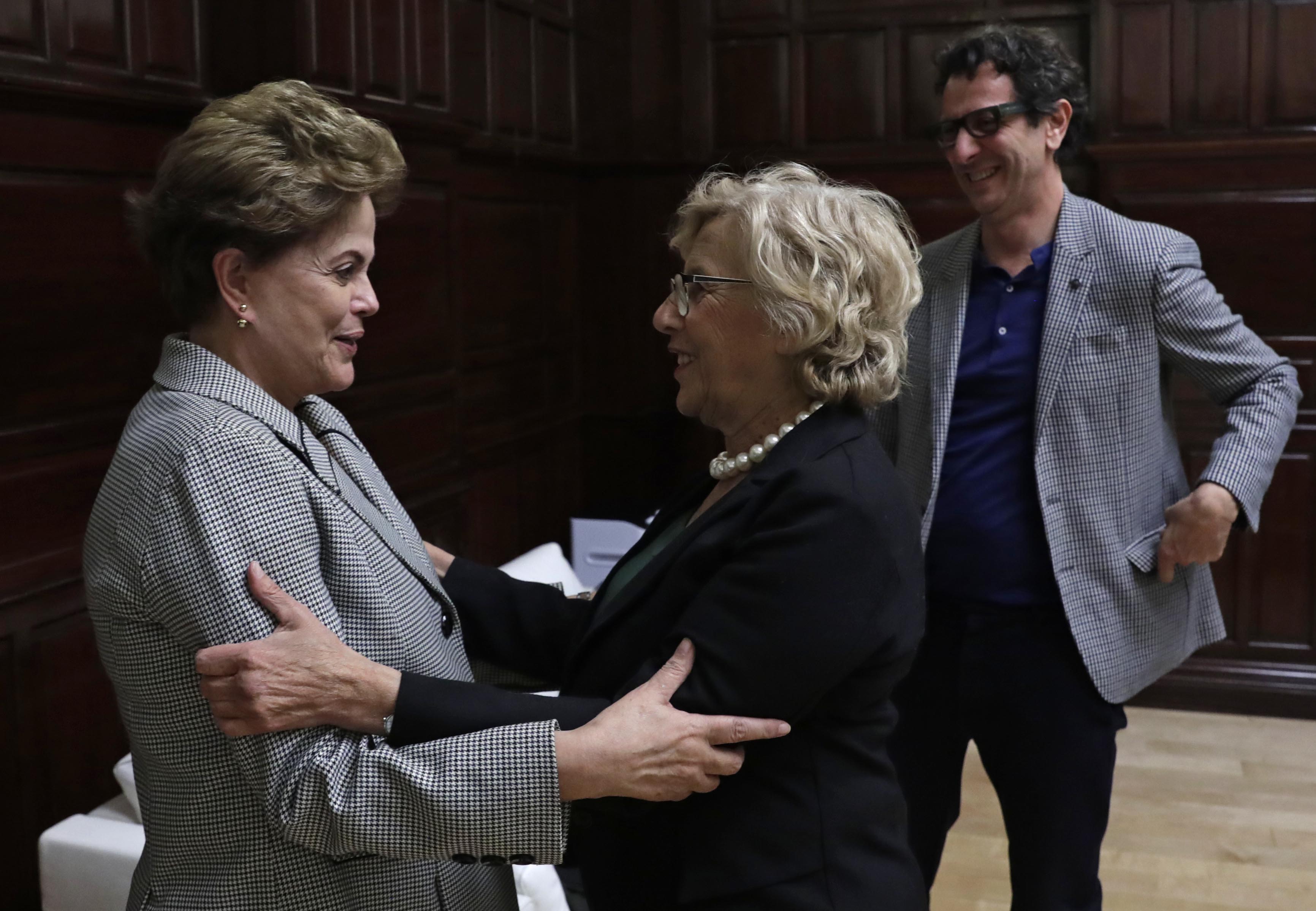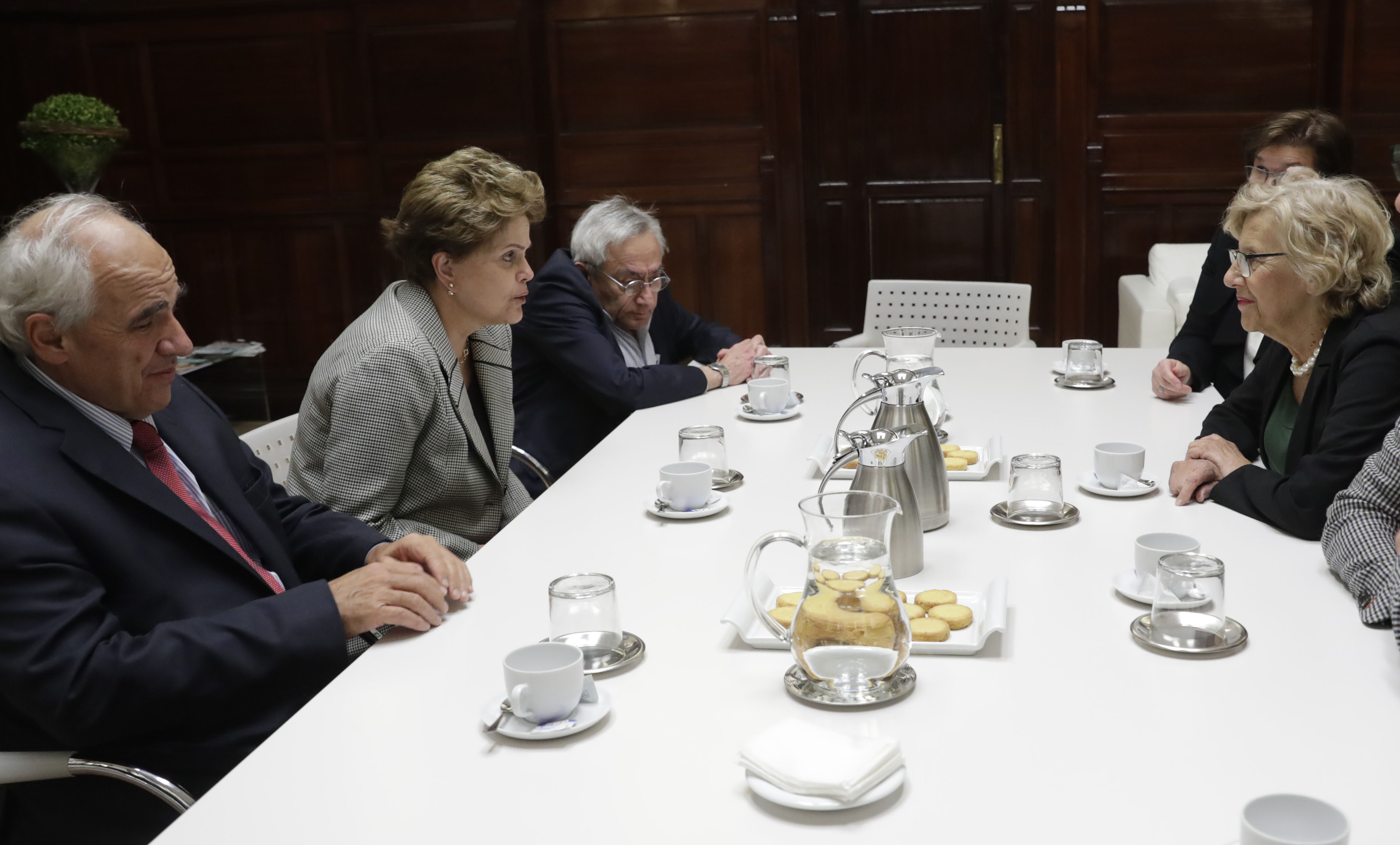 La alcaldesa de Madrid, Manuela Carmena, se ha reunido en la tarde de hoy, miércoles, en el palacio de Cibeles con Dilma Rousseff, expresidenta de Brasil, y Ernesto Samper, expresidente de Colombia, antes de que ambos exmandatarios participasen en una conferencia sobre ‘Los derechos humanos en América Latina: Brasil y Colombia’, organizada por la Facultad de Ciencias Políticas y Sociología de la Universidad Complutense de Madrid en el marco del Seminario Permanente sobre América Latina.