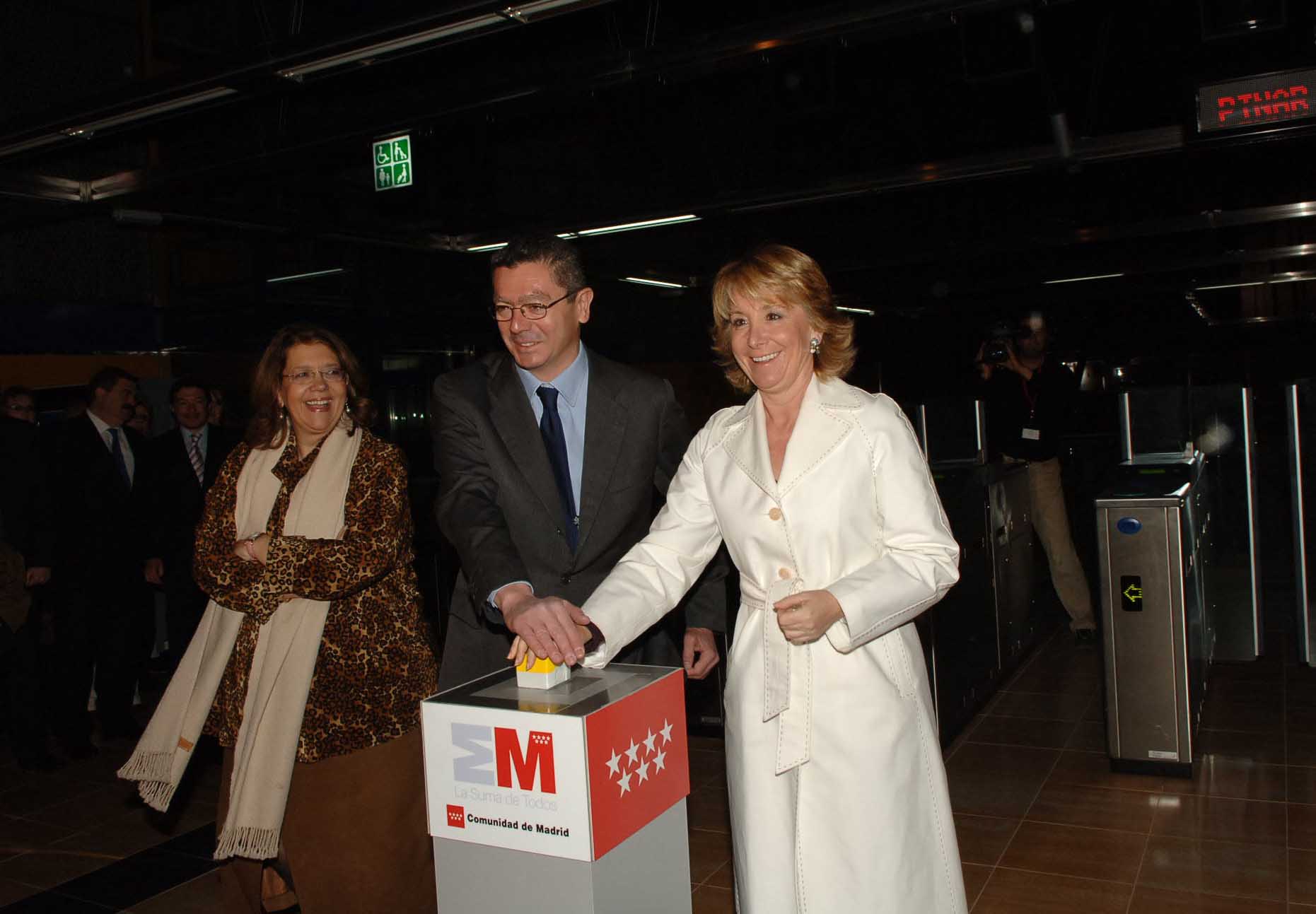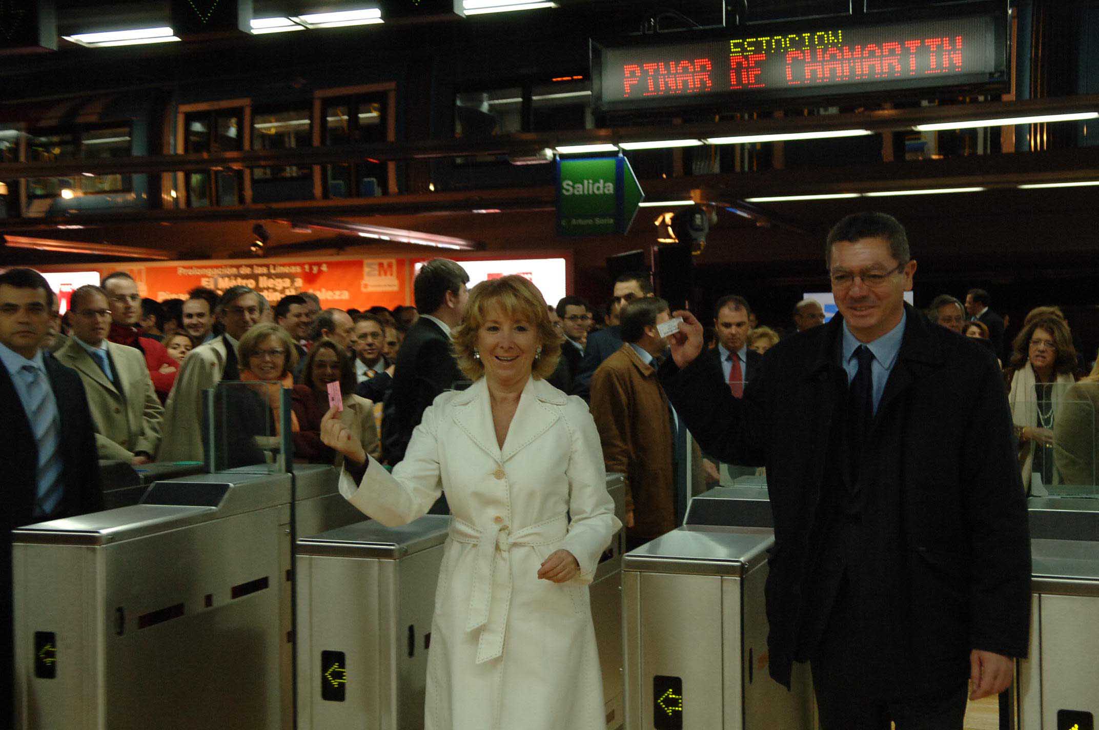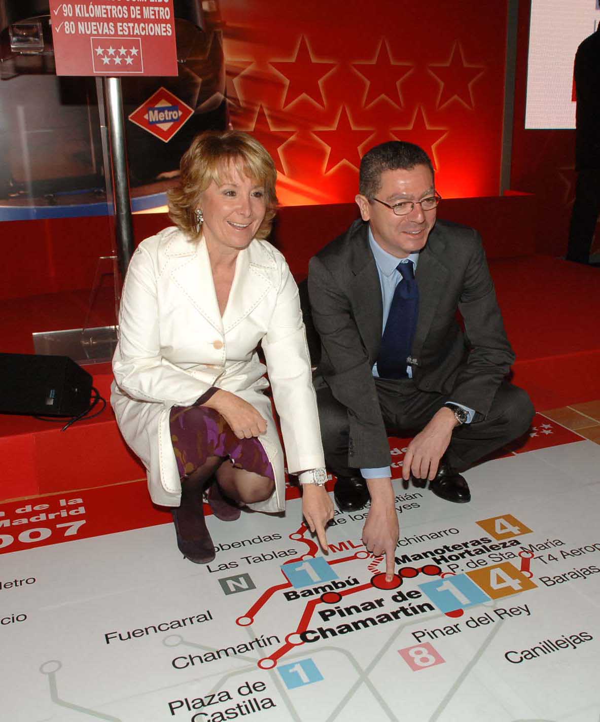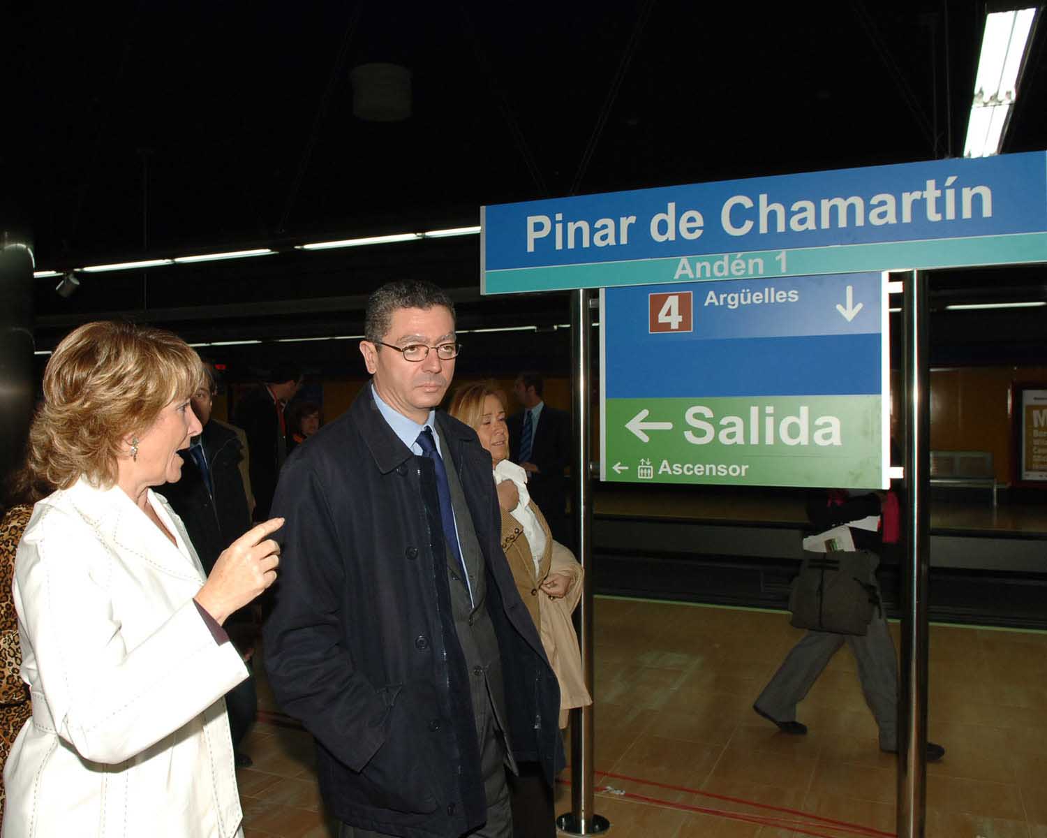 La presidenta regional, Esperanza Aguirre, y el alcalde de la Ciudad de Madrid, Alberto Ruiz-Gallardón, durante la inauguración de la prolongación de las líneas 1 y 4 de Metro y del intercambiador de Pinar de Chamartín./
