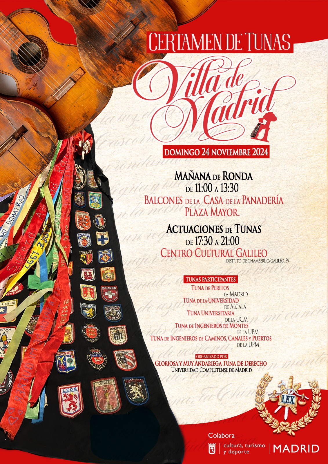 La iniciativa, en colaboración con la asociación Gloriosa y Muy Andariega Tuna de Derecho de la Universidad Complutense de Madrid, se desarrollará en dos actos: uno, por la mañana (11:00 h), que englobará pasacalles y ronda, en el que las tunas participantes desfilarán, sucesivamente, desde la Plaza de la Villa hasta el balcón de la Casa de la Panadería de la Plaza Mayor, donde realizarán la ronda; y ya por la tarde (17:30 h), cada tuna participante interpretará su repertorio y ofrecerá un espectáculo al público desde el escenario del Centro Cultural Galileo, en el distrito de Chamberí.
