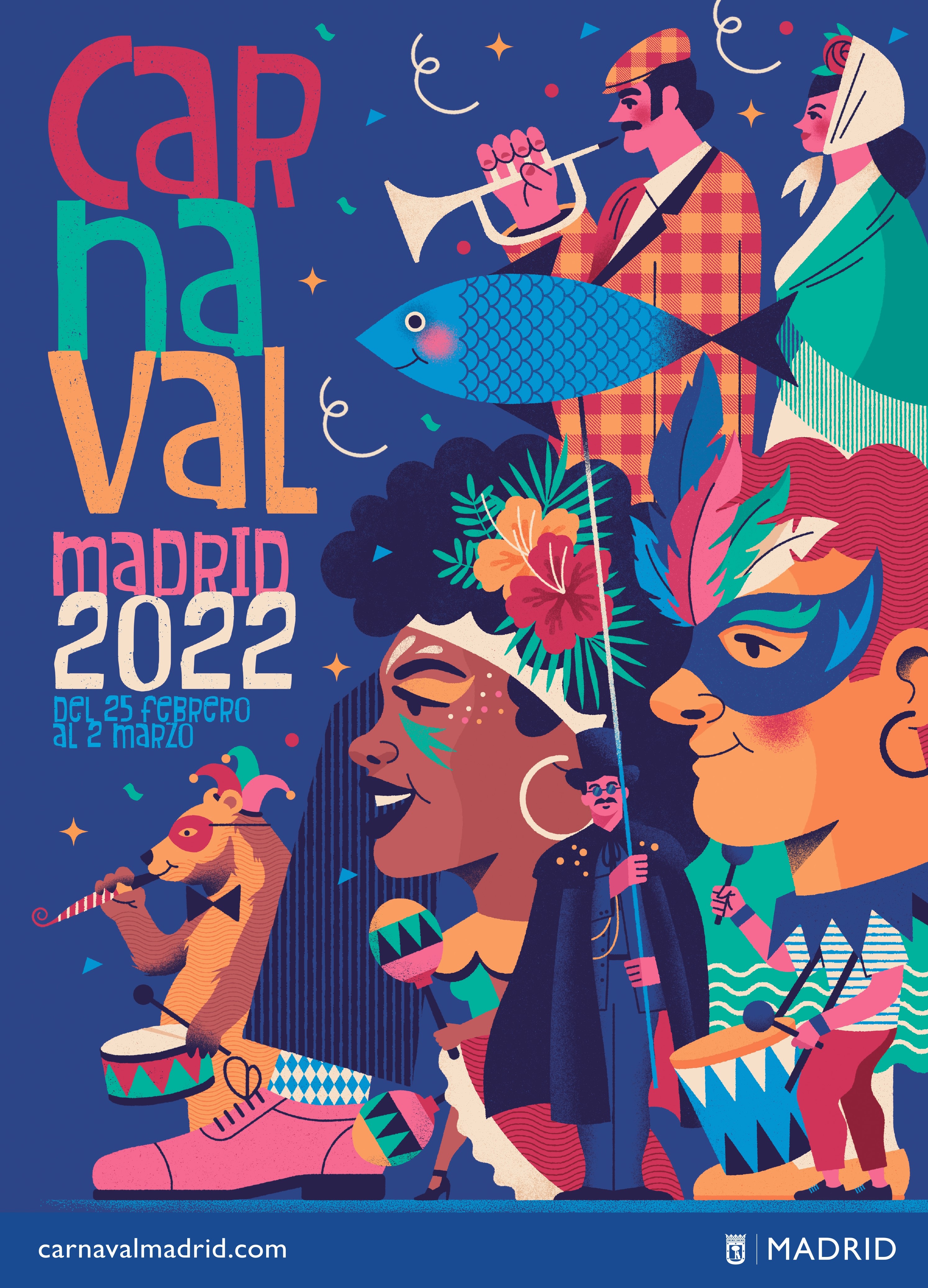 Madrid vuelve a dar la bienvenida al carnaval. El Área de Cultura, Turismo y Deporte recupera esta fiesta popular en toda su esencia, con conciertos, exhibiciones y actividades que traerán música y color a la ciudad y que tendrá a Matadero Madrid como epicentro. La artista Soleá Morente será la encargada de la lectura del pregón de las Fiestas de Carnaval 2022, que vuelven a Madrid con una programación renovada, diversa y plural tras un año sin poder celebrarse a causa de la pandemia. El cartel de 2022 ha sido ilustrado por Daniel Diosdado, con una propuesta alegre y llena de vida.