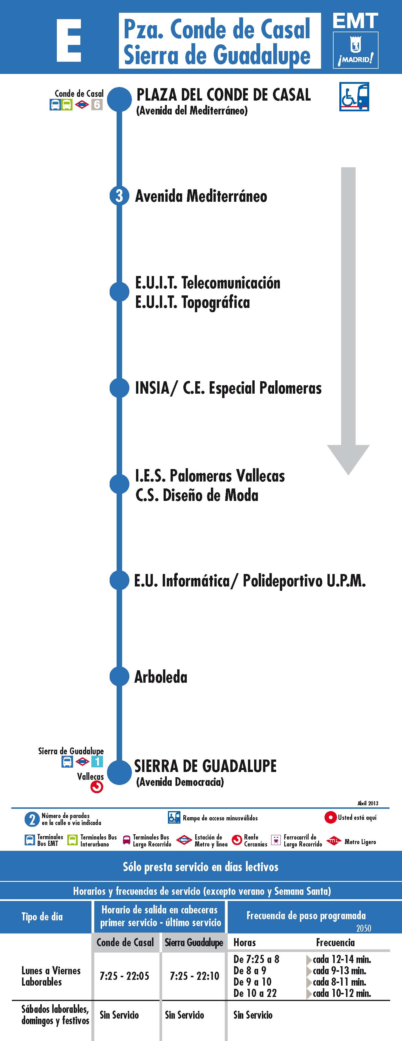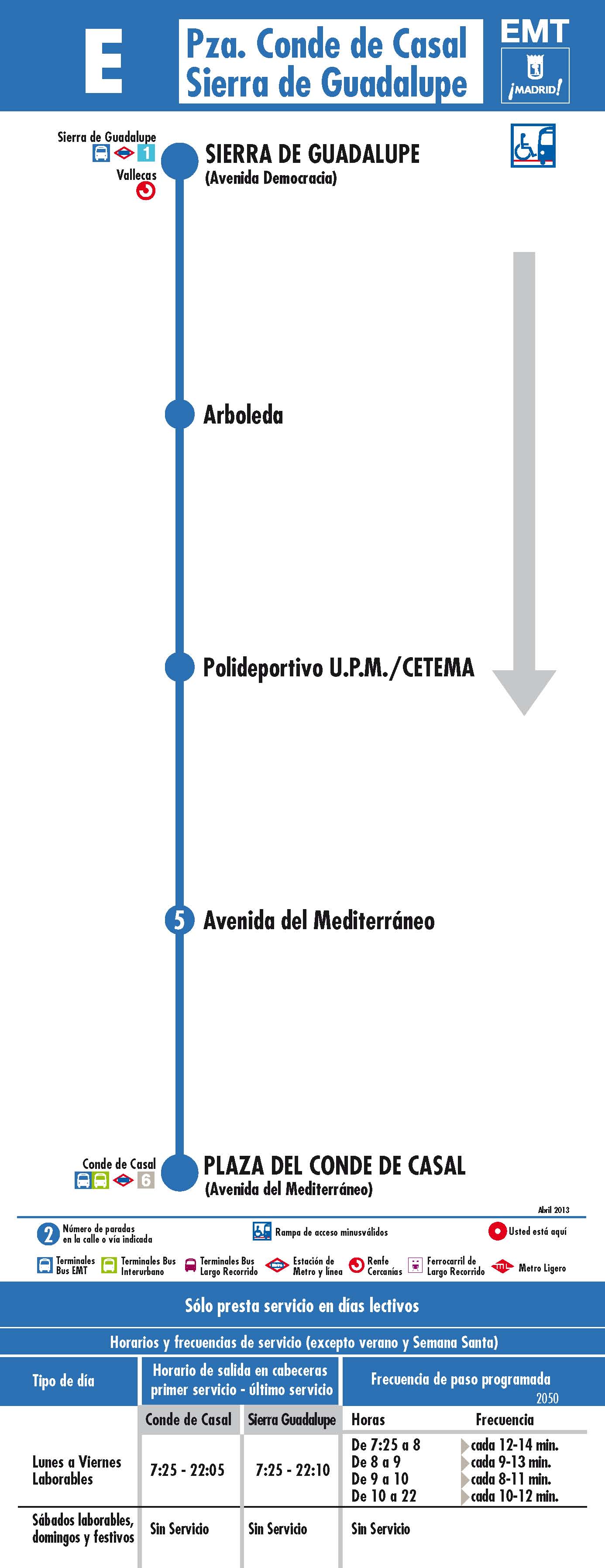 A partir del lunes 13 de mayo, la Empresa Municipal de Transportes de Madrid (EMT) modifica la denominación de la línea universitaria E ("Conde de Casal - Politécnico de Vallecas"), que pasa a llamarse "Conde de Casal - Sierra de Guadalupe".