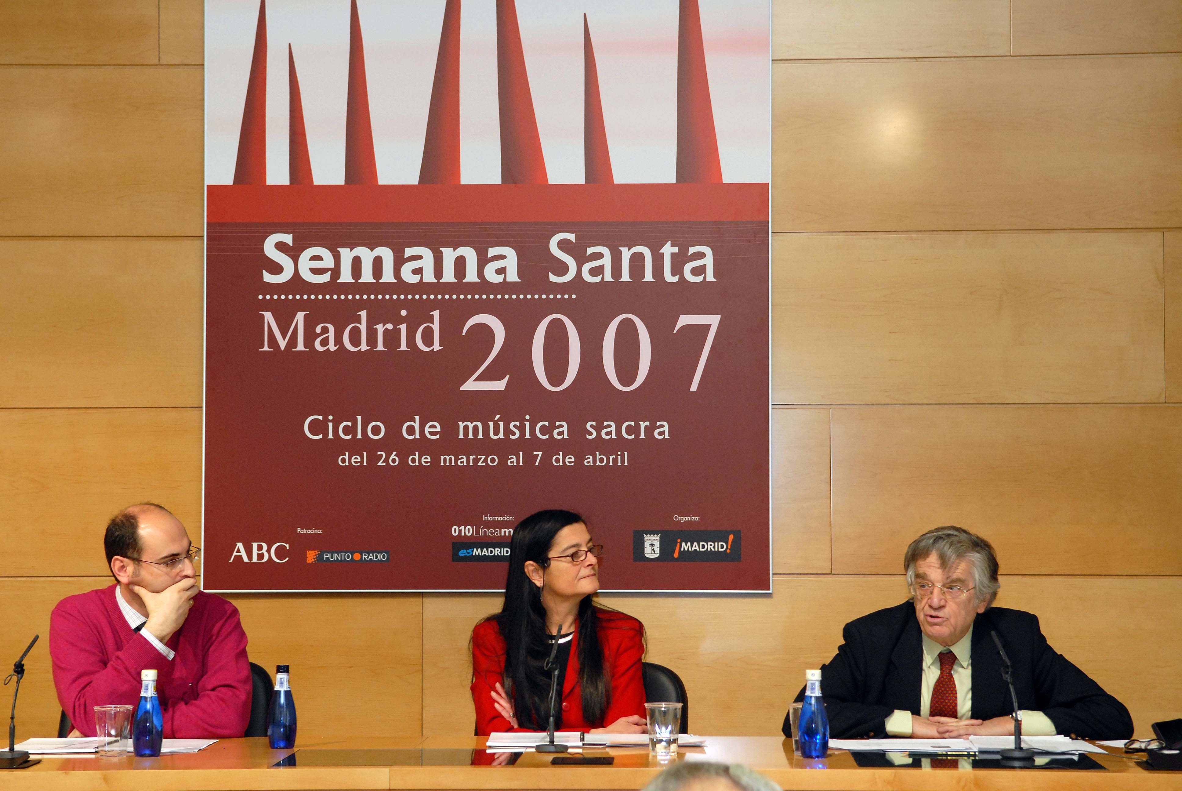 La concejala de Las Artes, Alicia Moreno, acompañada por el director general de Actividades Culturales, Manuel Lagos, y por el consejero técnico de Las Artes, Andrés Ruiz Tarazona, ha presentado hoy el programa de conciertos organizado por Las Artes con motivo de la Semana Santa 2007, que se desarrollará entre el 26 de marzo y el 8 de abril. La programación se organiza, principalmente, en torno a tres ciclos que tendrán a la música sacra como principal protagonista: Réquiem, Voces para la liturgia y Música para la Pasión.