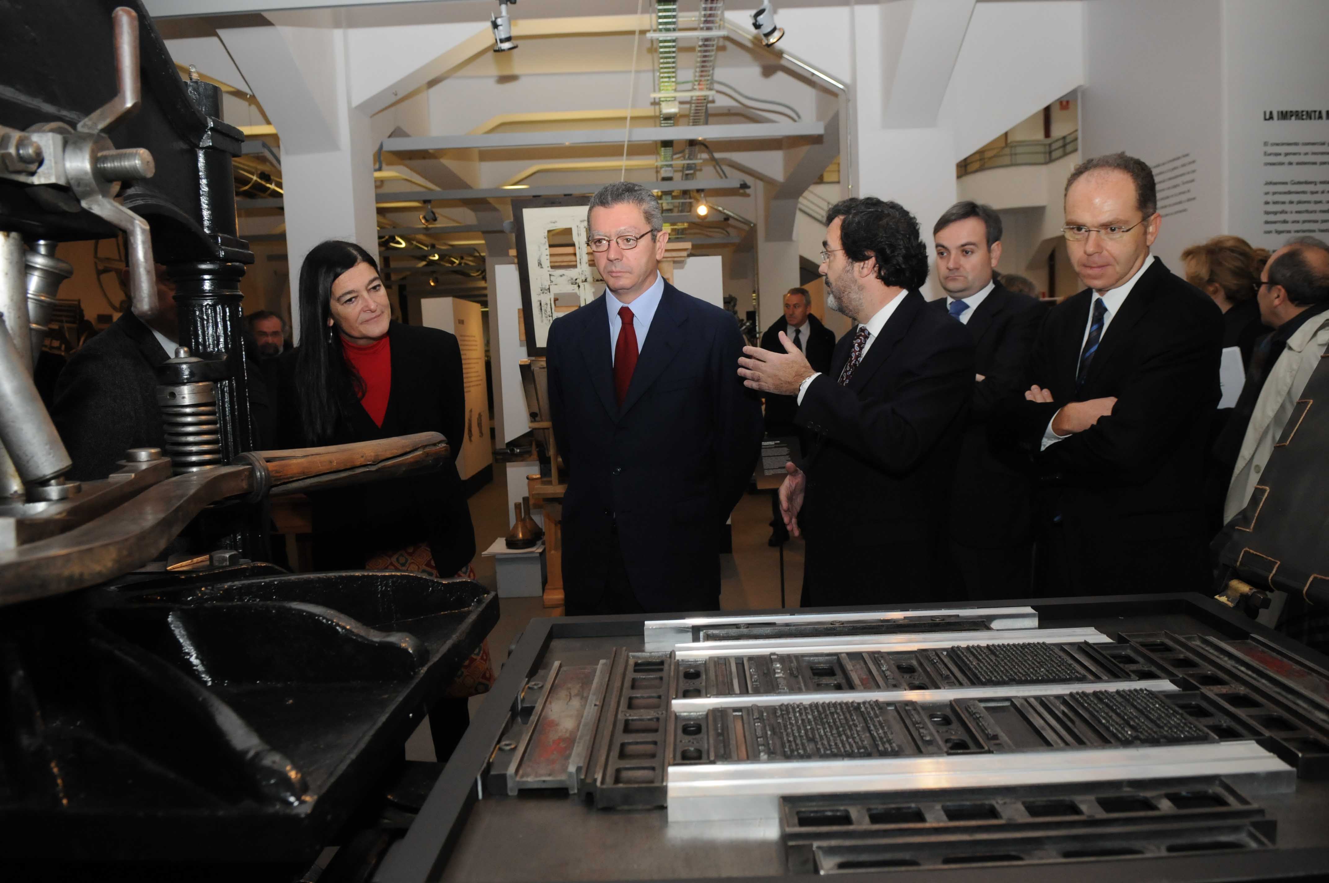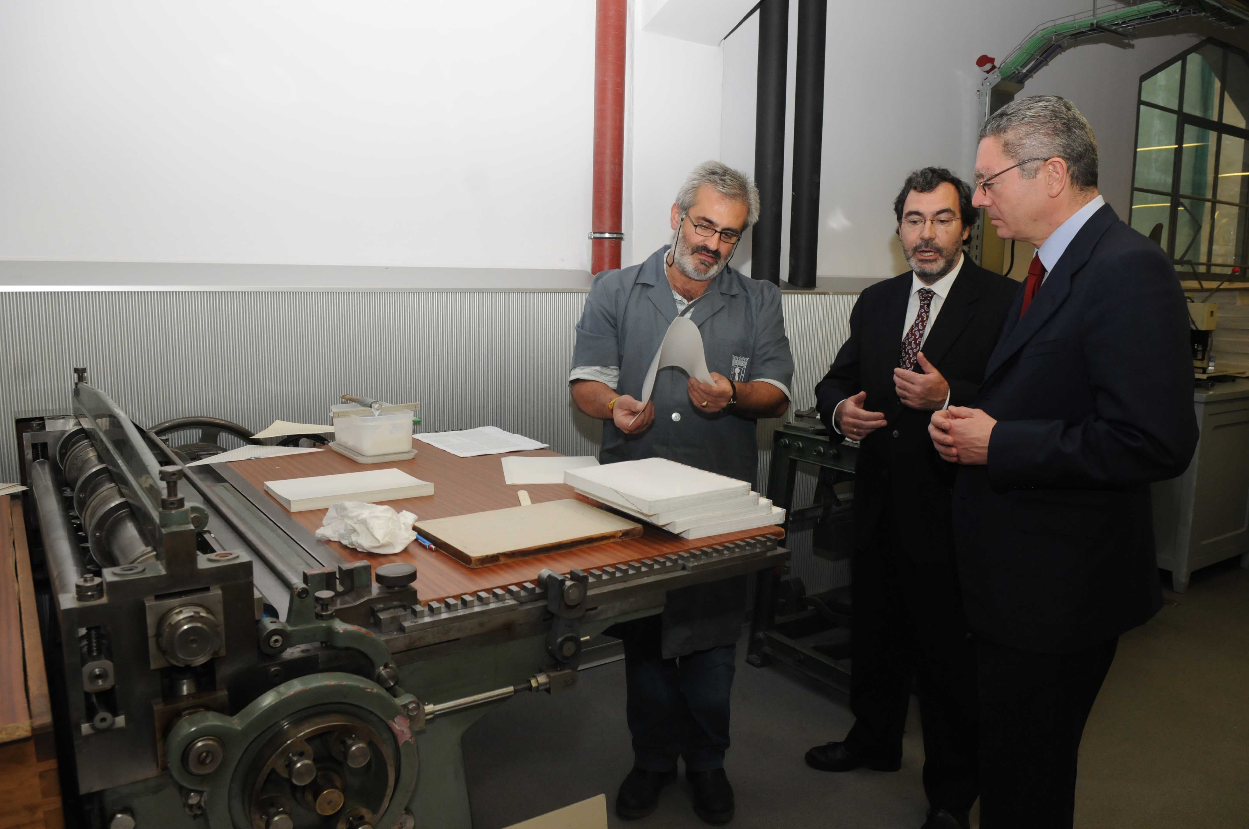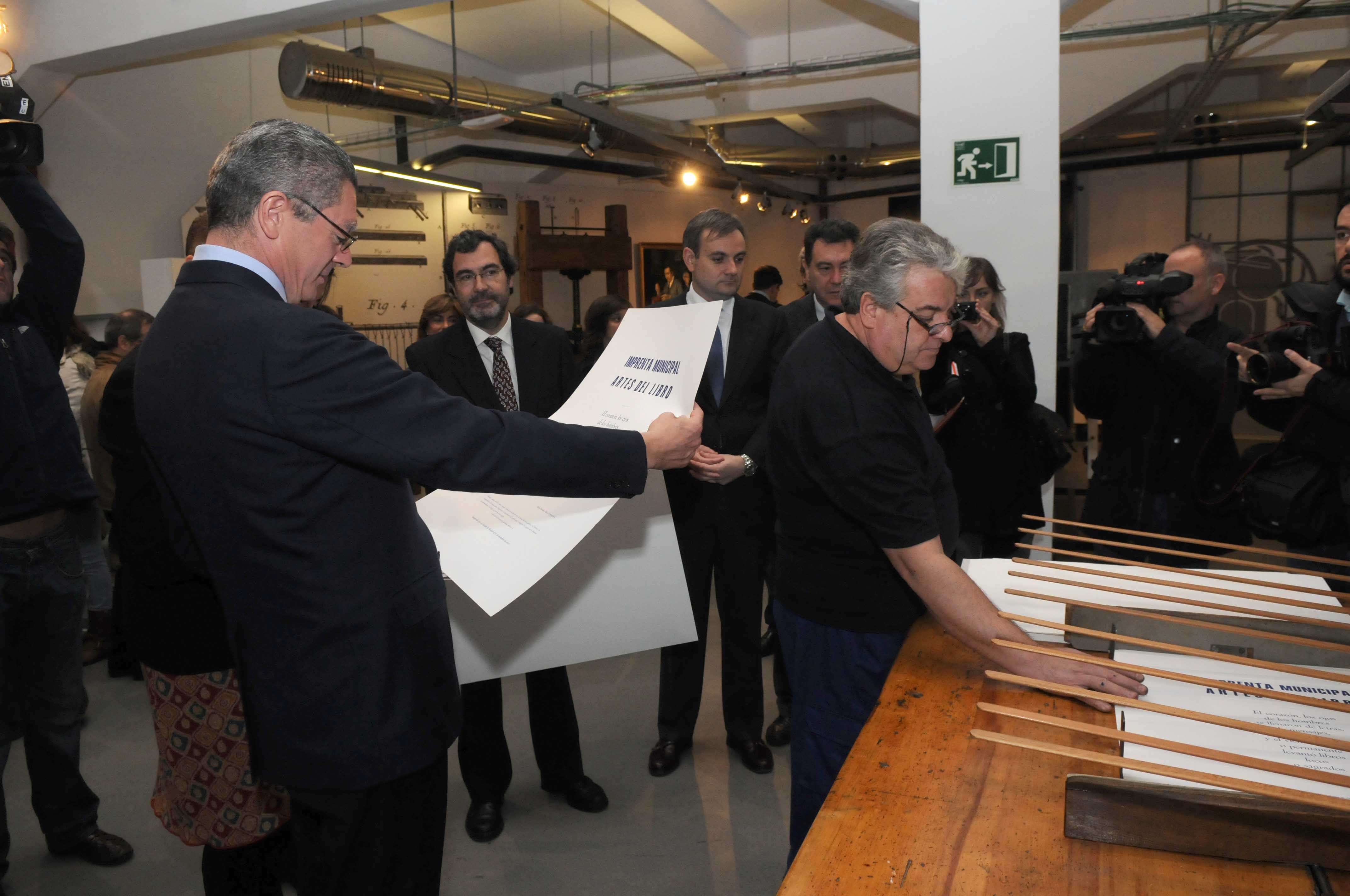 El alcalde de Madrid, Alberto Ruiz-Gallardón, acompañado por la delegada de las Artes, Alicia Moreno, y el concejal de Centro, Enrique Núñez, ha visitado la Imprenta Municipal - Artes del Libro, un centro dedicado al libro artesanal.