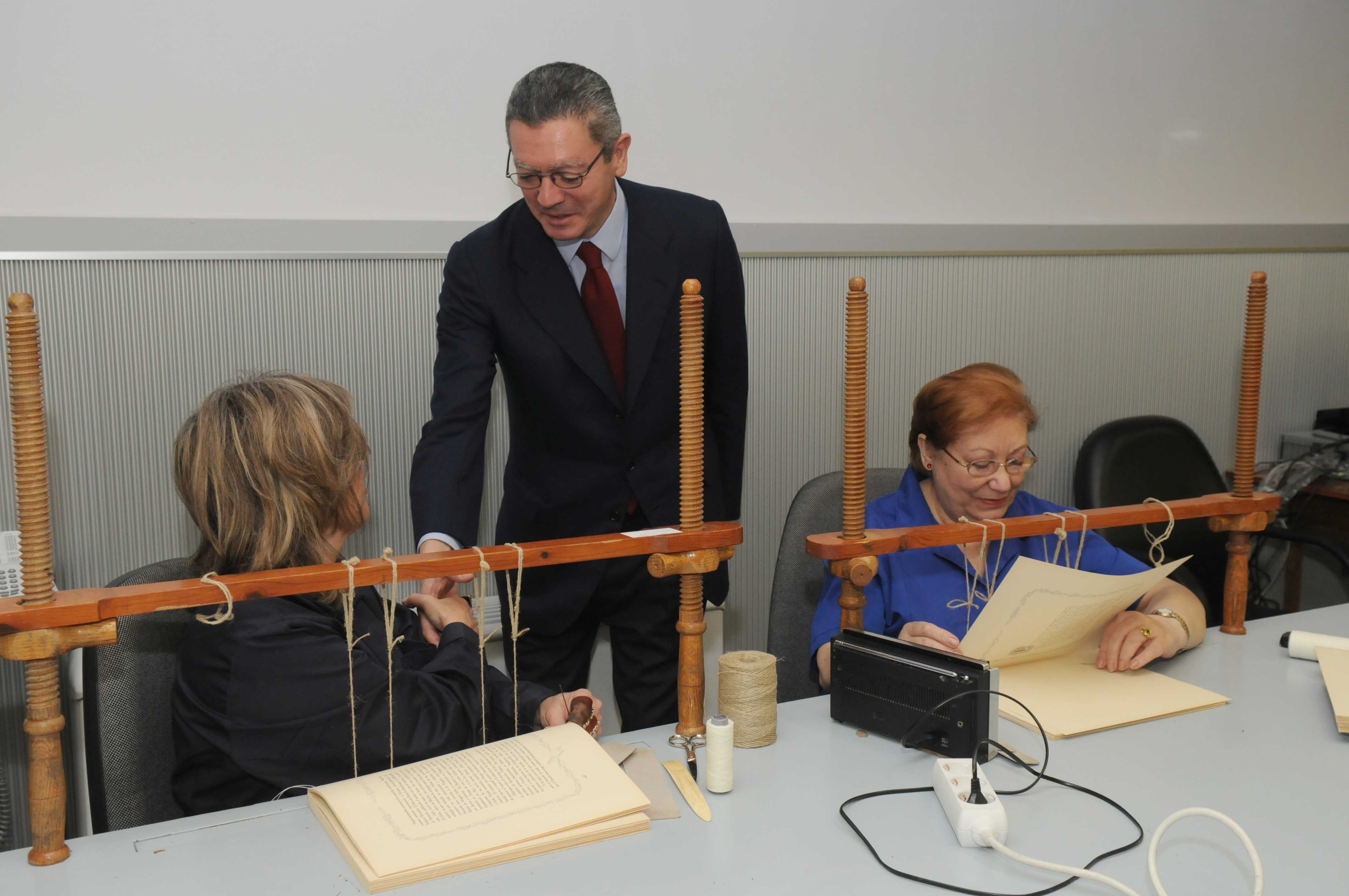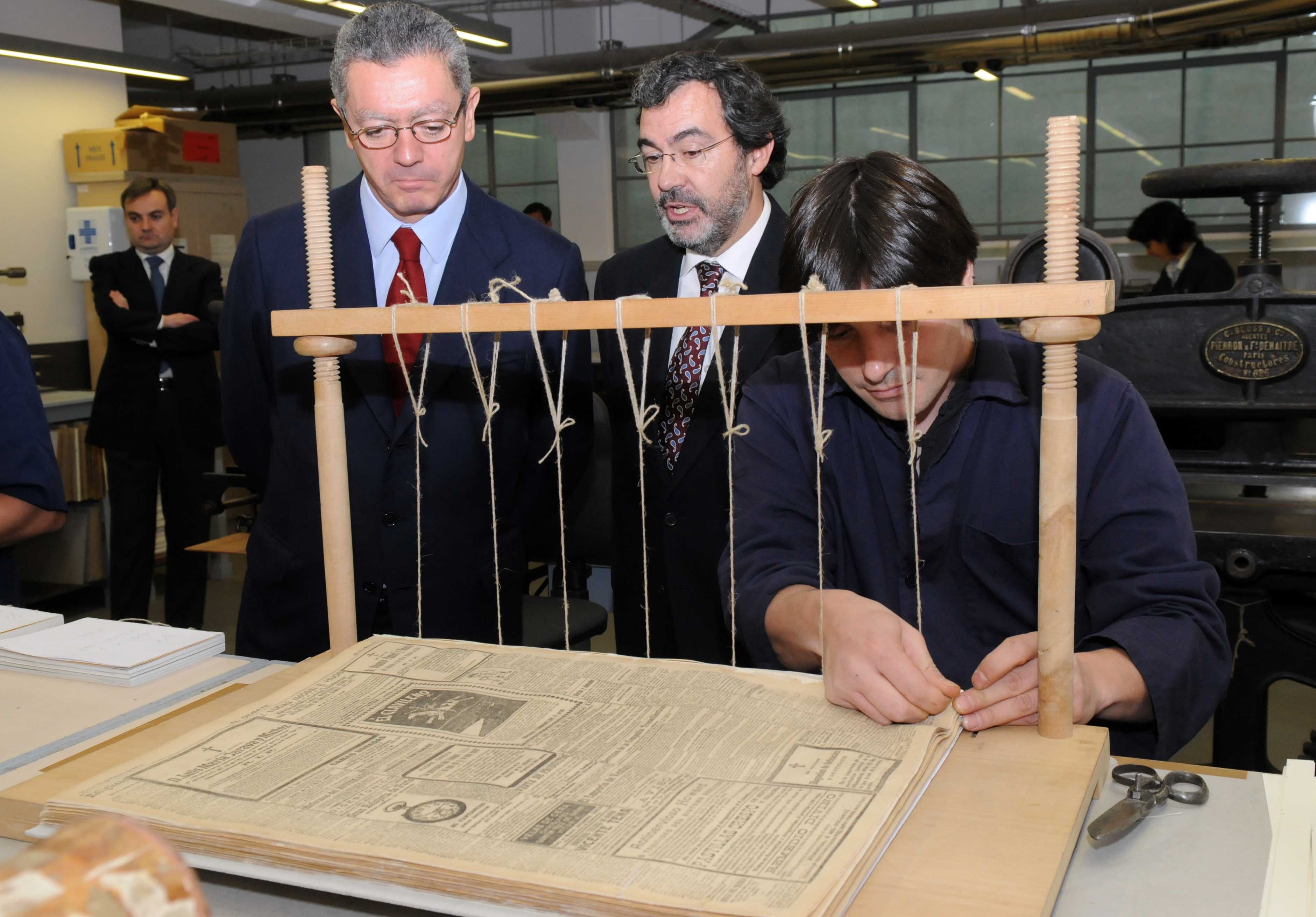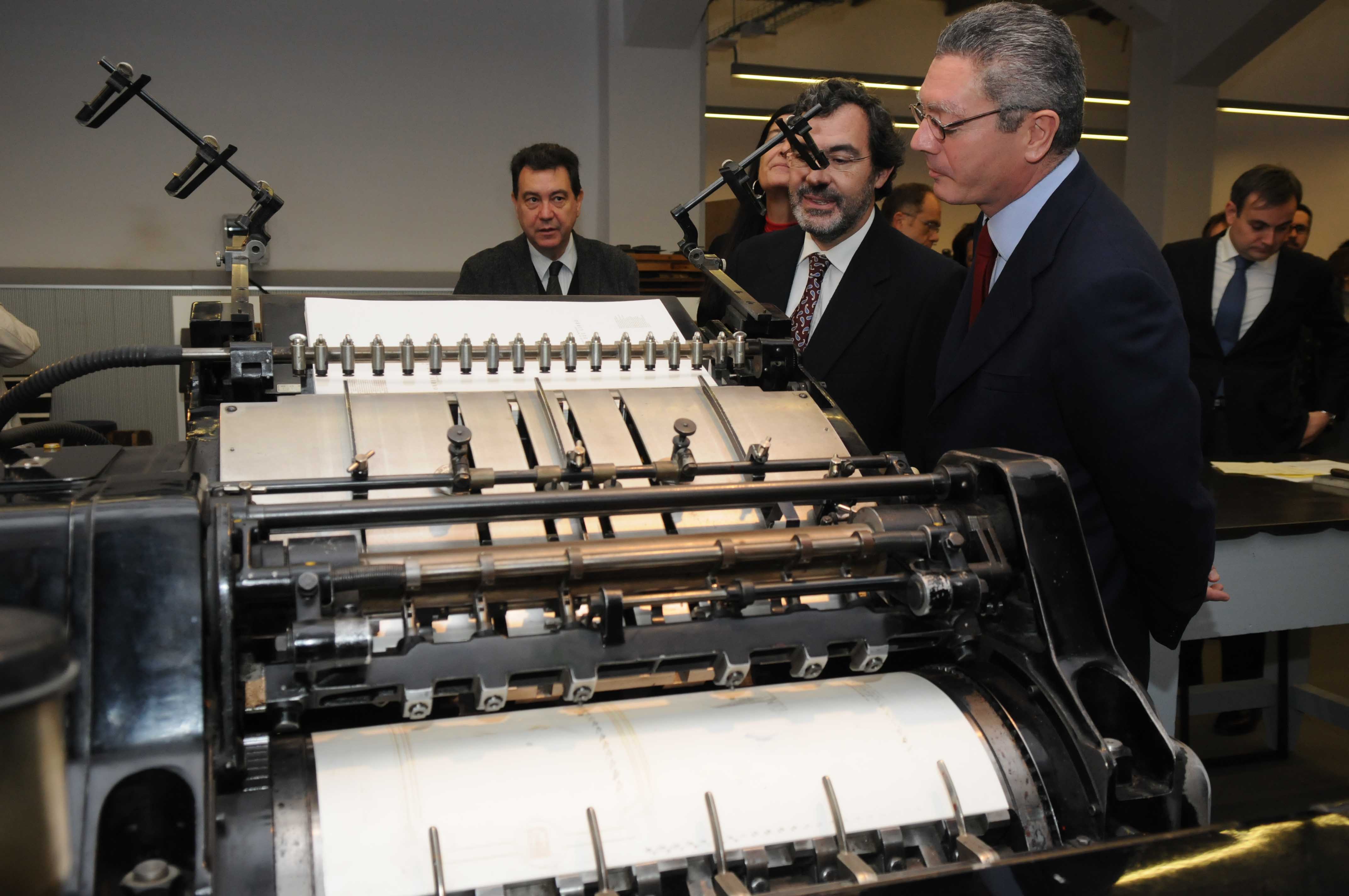 El alcalde de Madrid, Alberto Ruiz-Gallardón, acompañado por la delegada de las Artes, Alicia Moreno, y el concejal de Centro, Enrique Núñez, ha visitado la Imprenta Municipal - Artes del Libro, un centro dedicado al libro artesanal.
