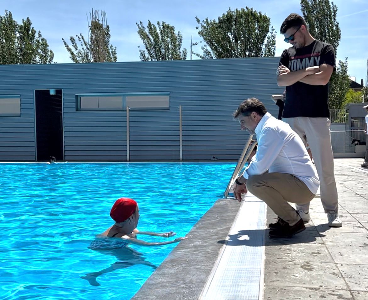 El distrito de Barajas ha celebrado hoy una jornada lúdica en la nueva piscina municipal de verano, en la que se ha podido disfrutar de música, exhibiciones deportivas y muestras artísticas. El momento principal ha sido la inauguración del mural titulado Remanso, cuya placa explicativa ha descubierto el concejal del distrito, Juan Peña. En ella, se incluye la frase: “Cuando una corriente de agua se hace más lenta, hablamos de remanso. El verano es el remanso del calendario. El tiempo afloja la velocidad y los días transcurren en calma”.