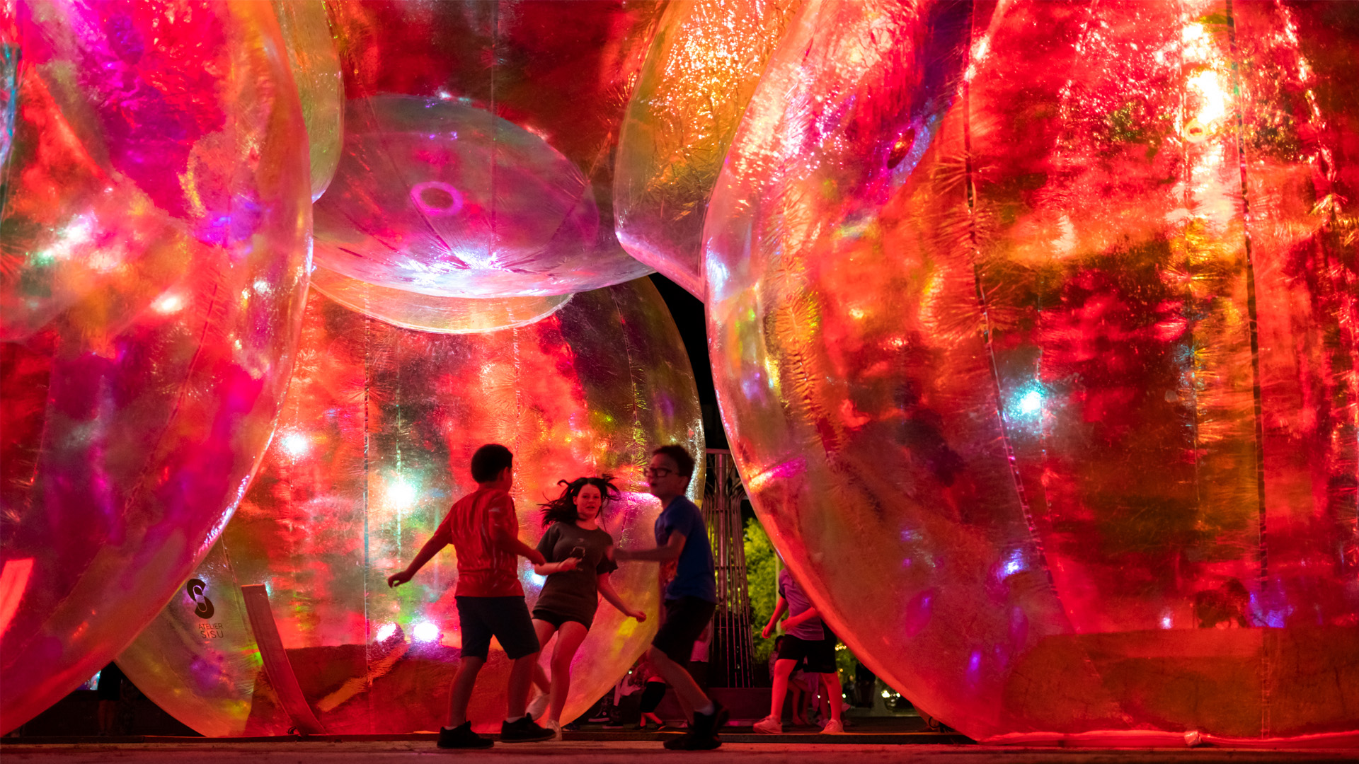 Por la noche, la instalación cambia y las proyecciones de luz rebotan dentro de la capa reflectante de las esferas creando una experiencia completamente nueva para que cada espectador explore.