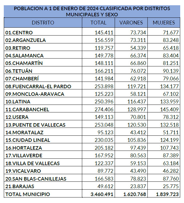 En lo referente a los distritos, Carabanchel (274.406), Fuencarral-El Pardo (253.898), Puente de Vallecas (253.048) y Latina (250.396) son los más poblados, acumulando casi el 30 % de la población municipal; mientras que Moratalaz (95.123), Vicálvaro (89.772) y Barajas (49.612) son los que cuentan con menor número de residentes.