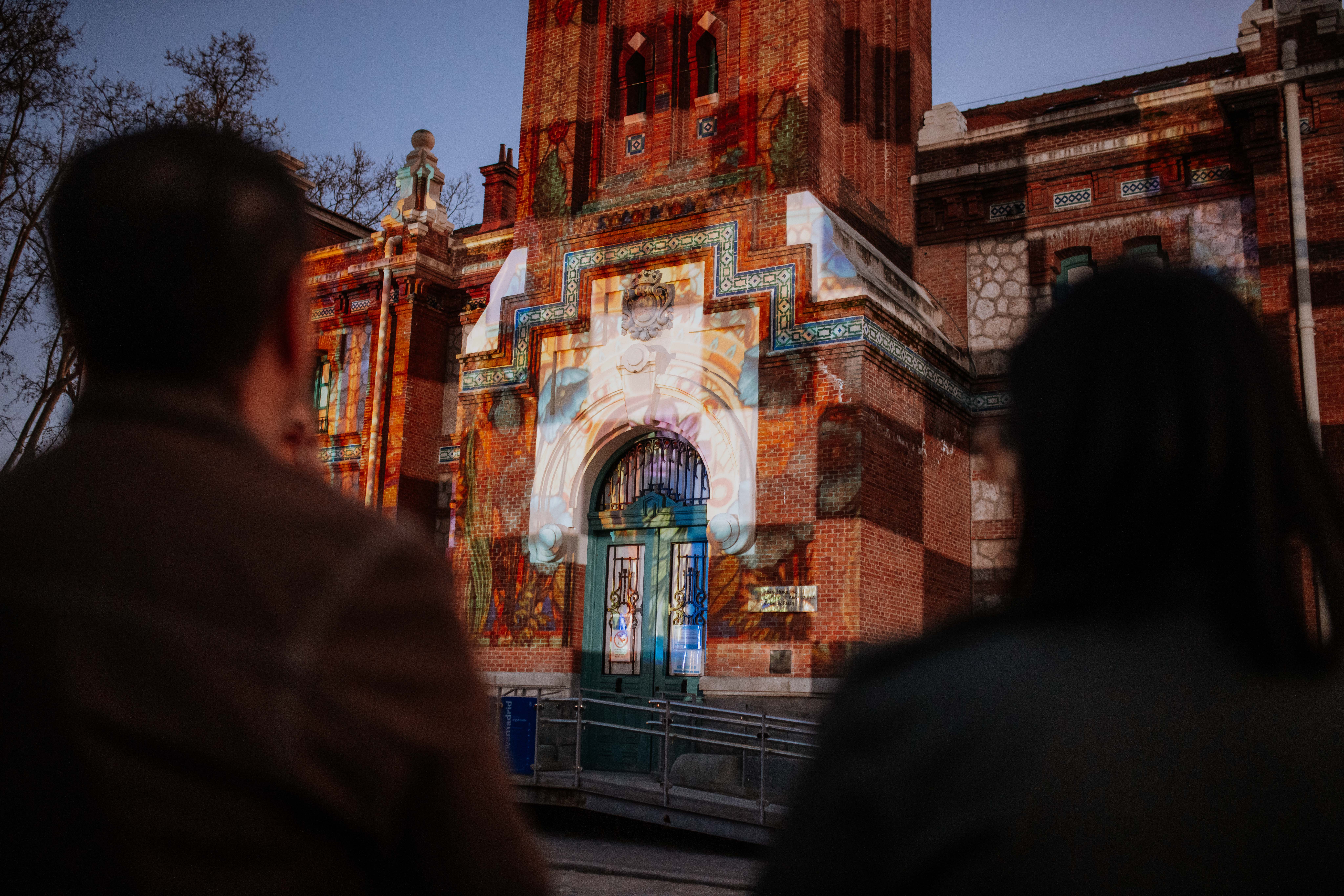 En el Complejo Cultural El Águila, la sorpresa llega de la mano de Studio Lemercier, una de las máximas referencias en creación contemporánea con luz. Codirigido por Joanie Lemercier y Juliette Bibasse, con sede en Bruselas, el estudio ha adaptado Blueprint especialmente para LuzMadrid 2026. Se trata de una creación que pone en perspectiva lo imprevisible de la naturaleza mientras transforma la fachada de este edificio neomudéjar. El audio parte de notas de contrabajo grabadas por Yair Elazar Glotman y procesadas con electrónica por James Ginzburg, en un diálogo entre su relato sensorial y la memoria industrial del complejo.