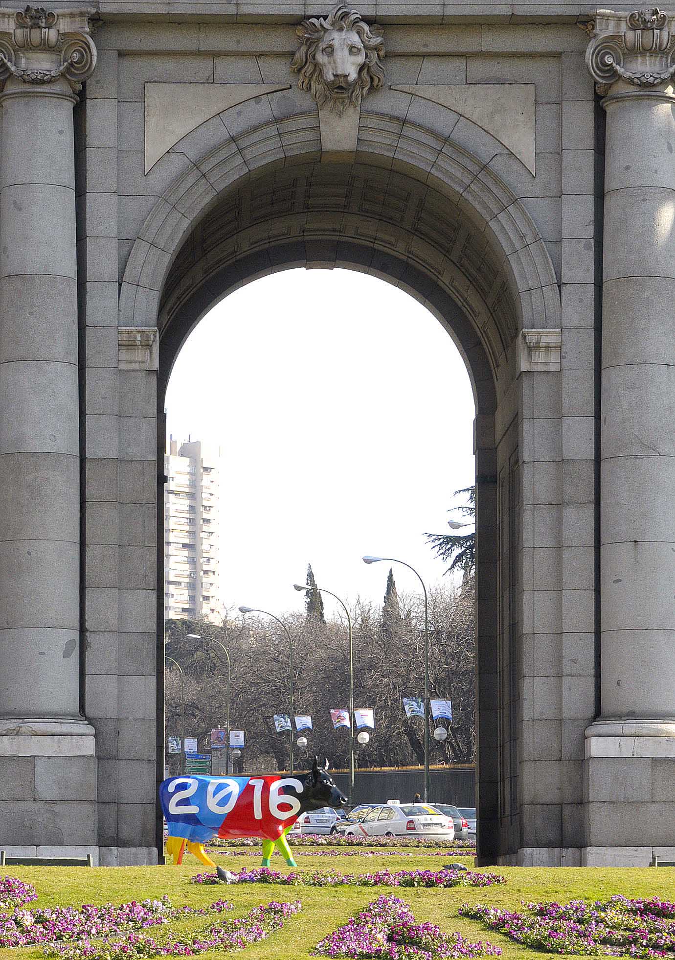 La vaca olímpica ‘pasta’ en la Puerta de Alcalá