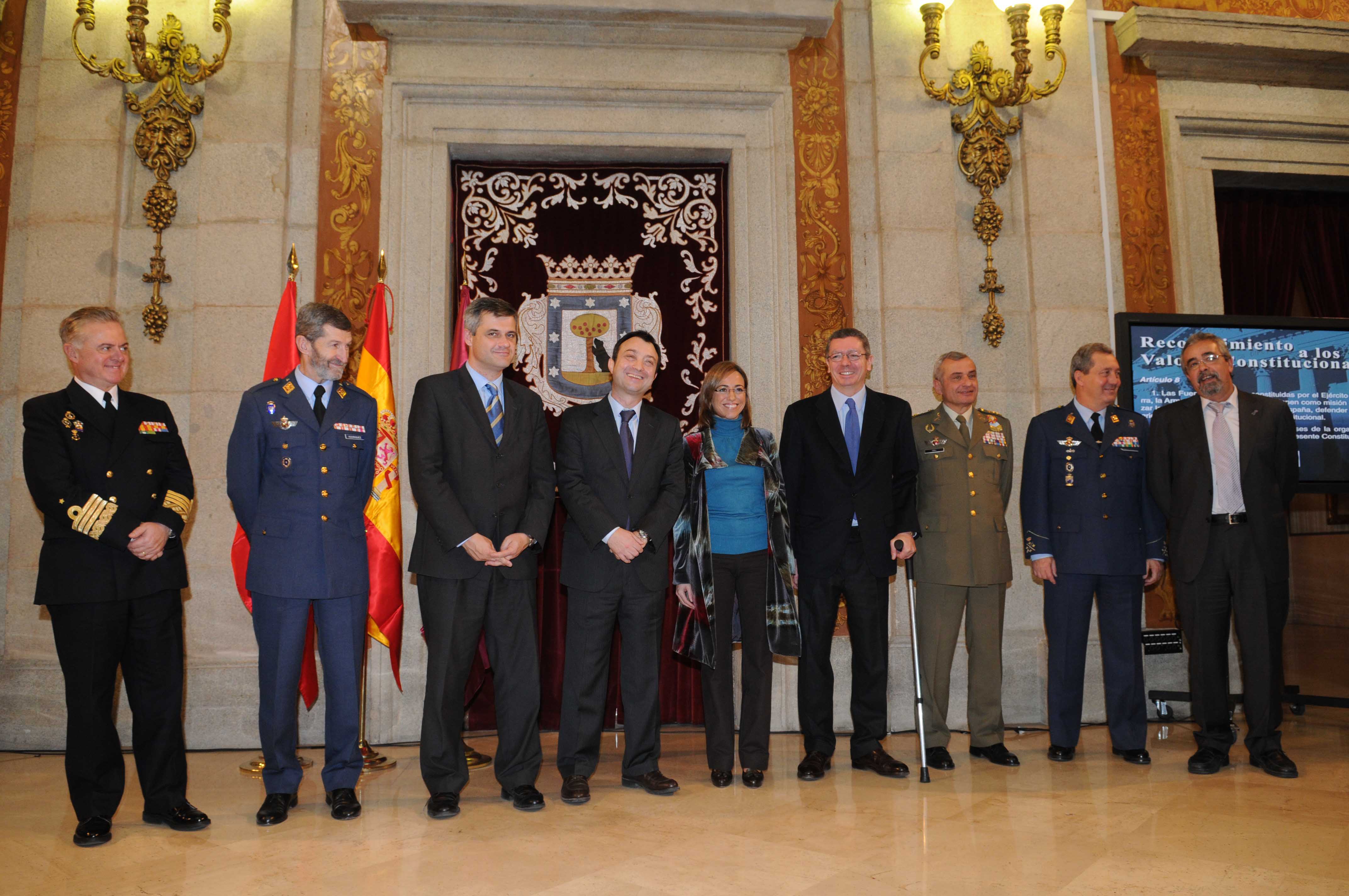 Las Fuerzas Armadas son garantía de libertad, justicia, pluralismo, igualdad y solidaridad, valores consagrados en la Constitución y que representan el mundo que los madrileños desean vivir. Por este motivo, la capital las distingue con el Reconocimiento a los Valores Constitucionales, que ha recogido hoy la ministra de Defensa, Carme Chacón, de manos del alcalde de la Ciudad de Madrid, Alberto Ruiz-Gallardón, coincidiendo con el trigésimo aniversario de la ratificación de la Carta Magna. Ruiz-Gallardón evocó el espíritu conciliador de la Constitución y lo contrapuso a la violencia que ha causado la muerte de Ignacio Uría.