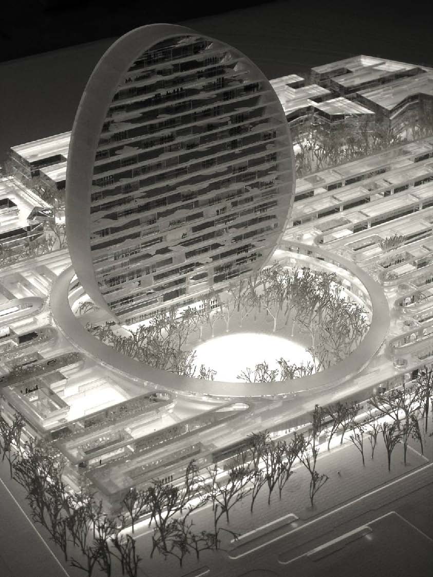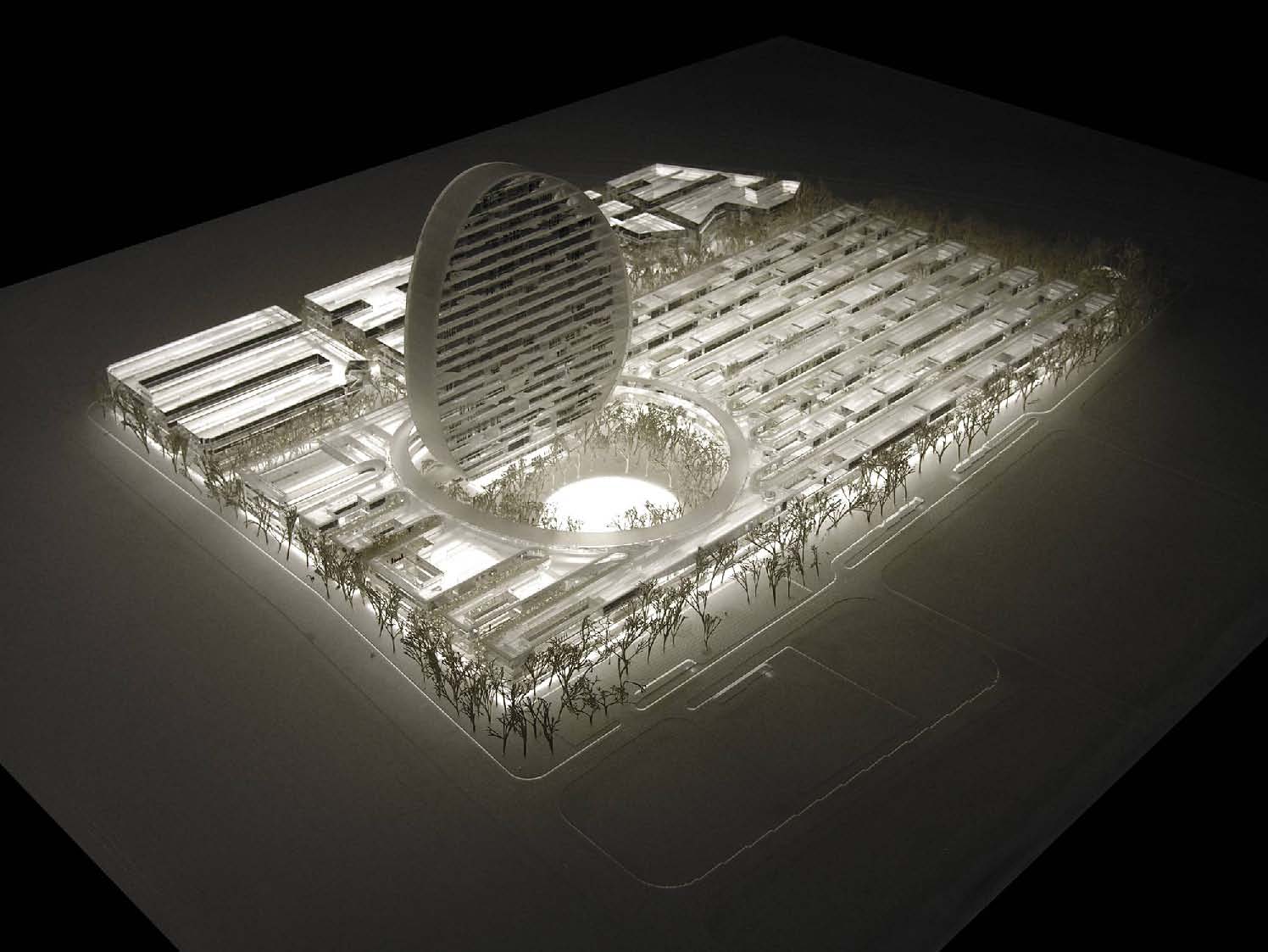 El nuevo complejo tendrá dos áreas bien definidas. Por una parte, se crea una alfombra de edificios que no superarán las tres plantas, separados por patios vegetales. Éstos desembocan en una plaza donde se levantará la gran torre singular de 22 plantas diseñada con exigentes criterios de sostenibilidad, ya que aspira a obtener la calificación medioambiental Leed (Líder de Energía y Diseño Ecológico).