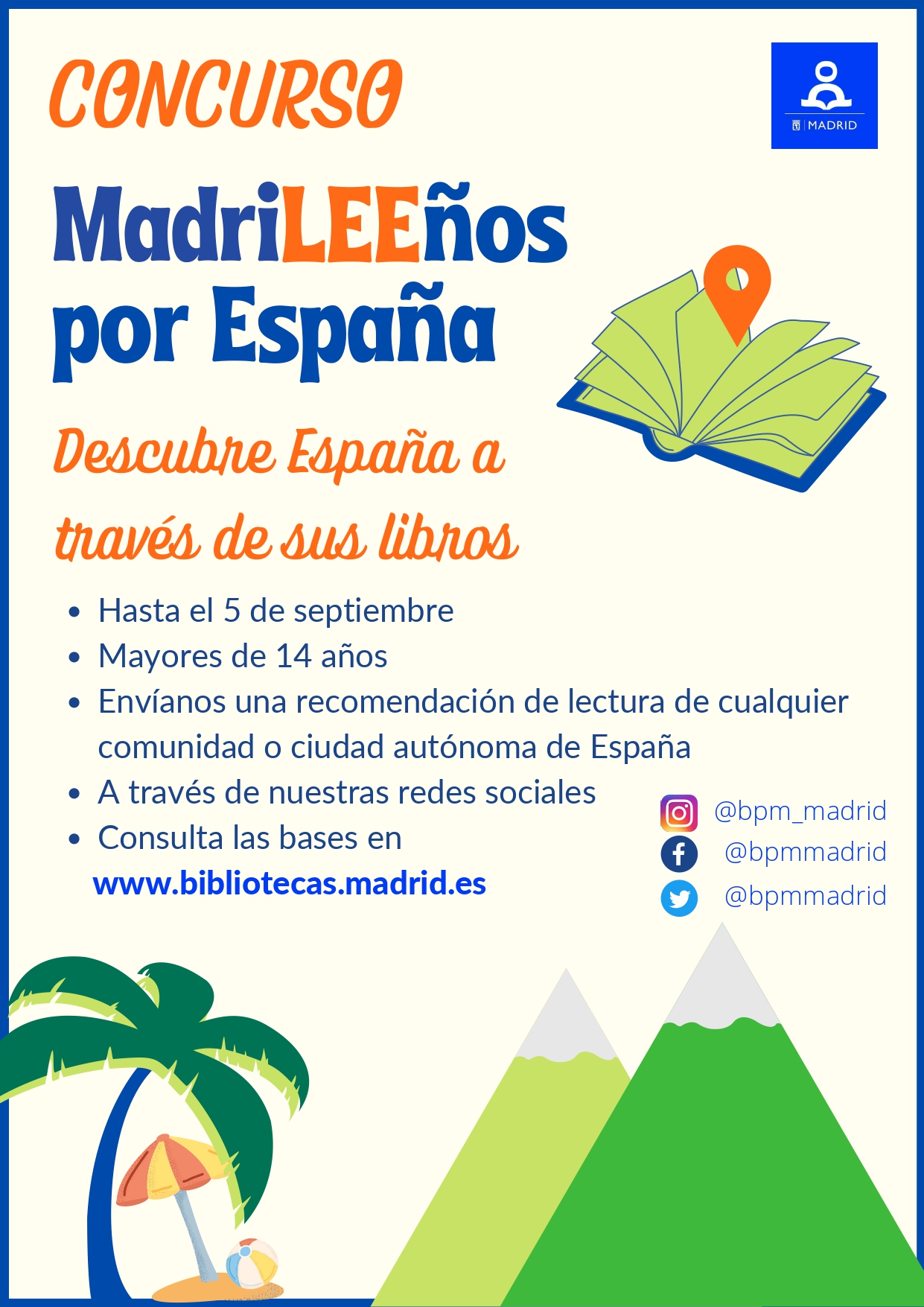 Las redes sociales de las bibliotecas públicas Instagram, Facebook y Twitter lanzarán a partir de este lunes, 5 de julio, un concurso cuyo propósito es tanto fomentar la lectura como el conocimiento de España. MadriLEEños por España es el nombre de este certamen que invita a descubrir el país través de los libros.