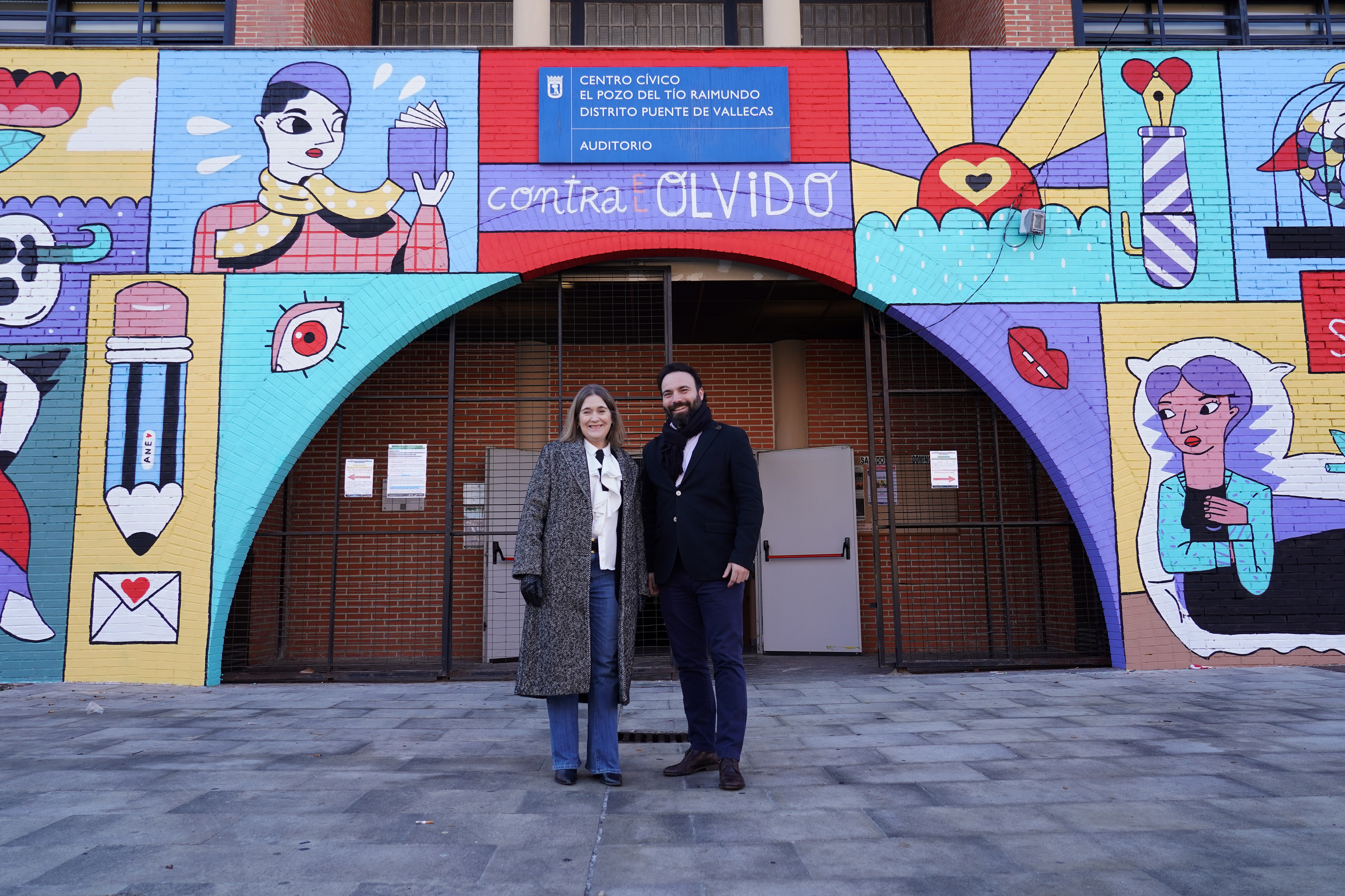 Seis bibliotecas públicas municipales lucirán en sus fachadas antes de que finalice 2023 los murales de arte urbano que forman parte de ‘Compartiendo muros’, un proyecto de creación colaborativa del Área de Cultura, Turismo y Deporte que persigue fomentar la lectura mediante intervenciones artísticas que mejoran el paisaje urbano en espacios de titularidad municipal. En la primera fase de esta segunda edición participan artistas y vecinos de Arganzuela, Fuencarral-El Pardo, Puente de Vallecas, Hortaleza, Vicálvaro y San Blas-Canillejas.
