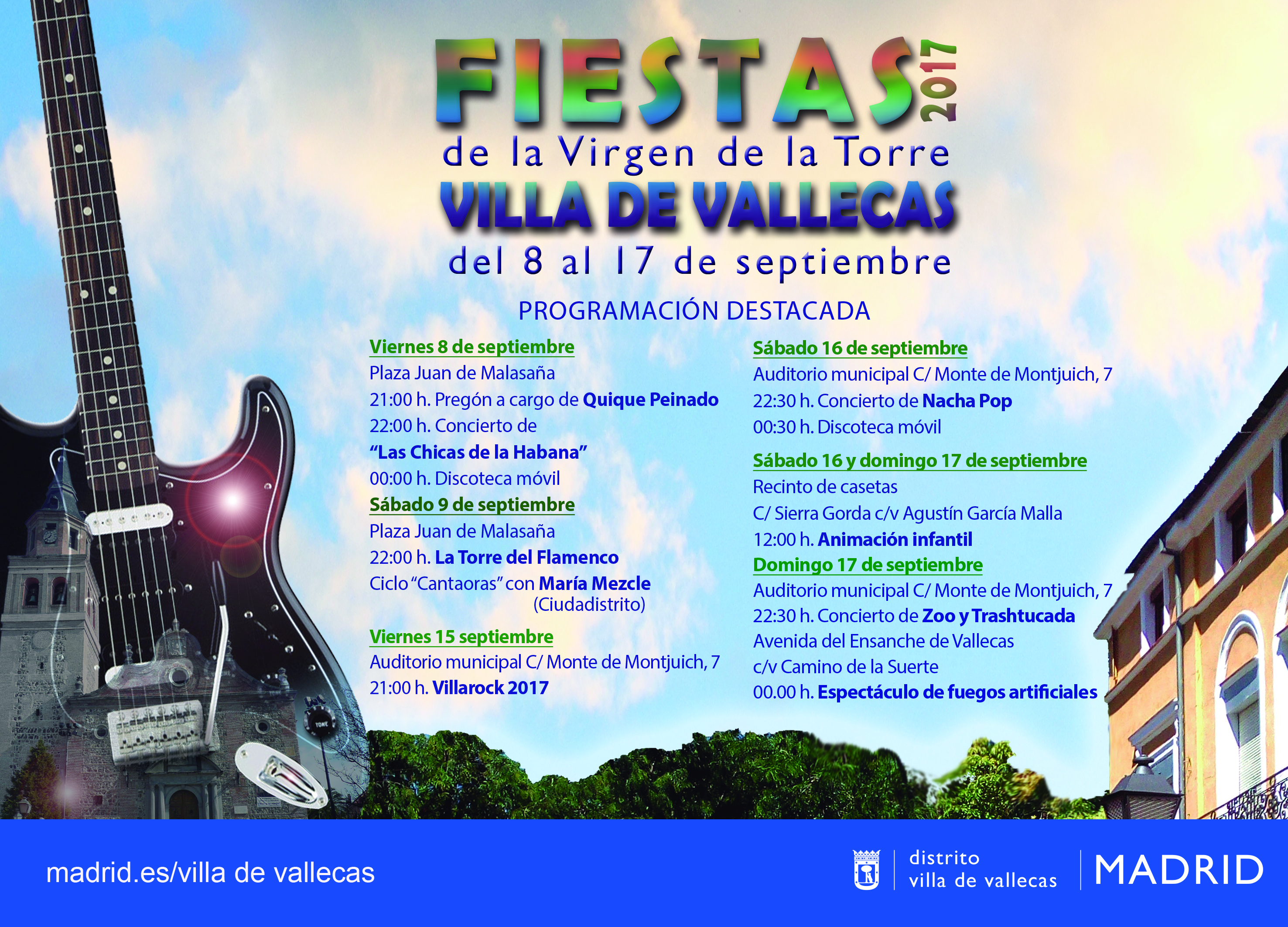 Desde la tarde del 7 de septiembre, todos los estilos y todas las manifestaciones musicales acompañarán a los vecinos y vecinas de Villa de Vallecas, que celebrarán sus fiestas del distrito hasta el próximo 17 de septiembre. Los sonidos populares arrancarán el programa oficial de las Fiestas de la Virgen de la Torre, con exhibiciones de bailes castizos y batucadas, que tendrán lugar en la Plaza Juan de Malasaña.
