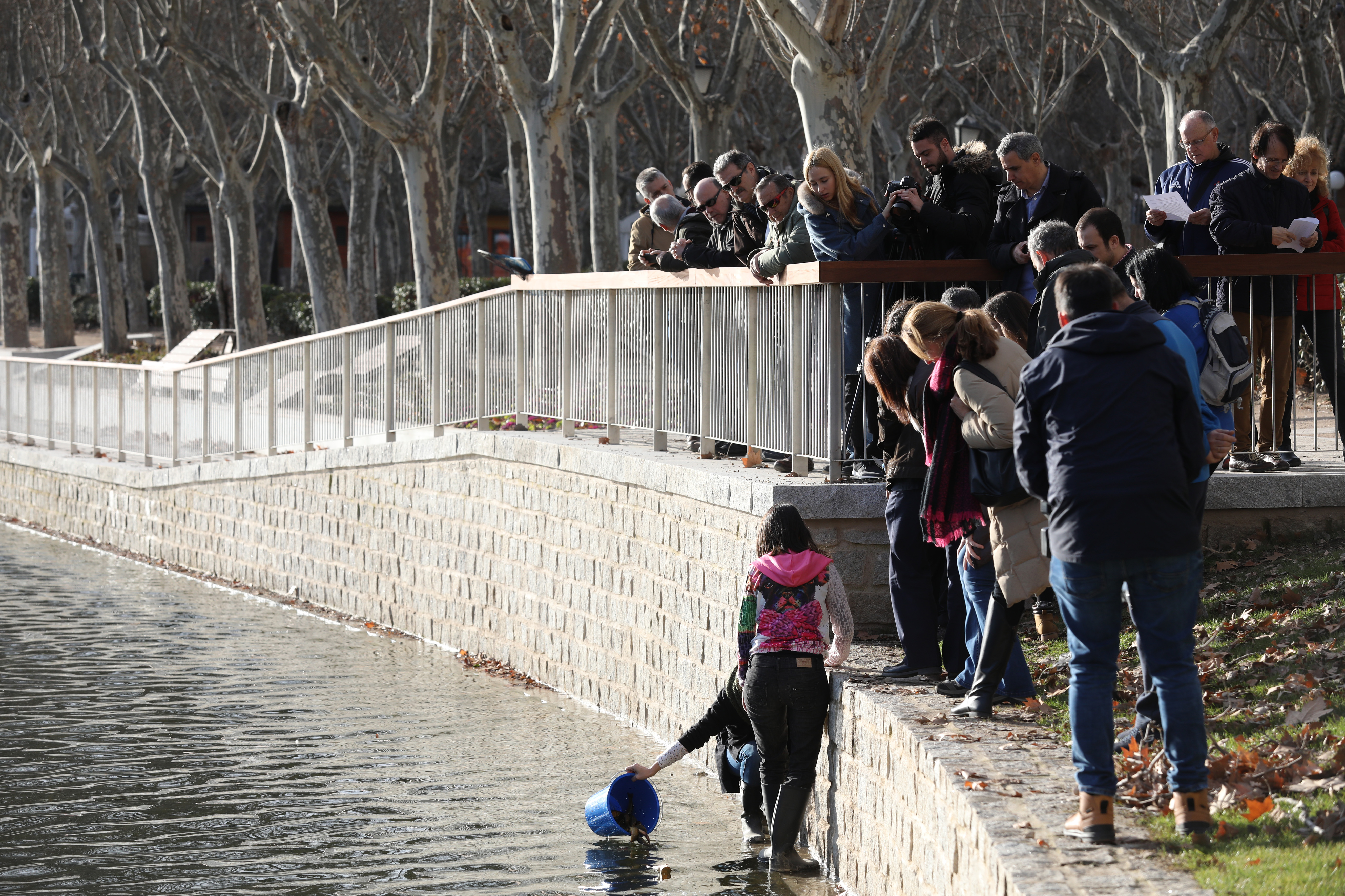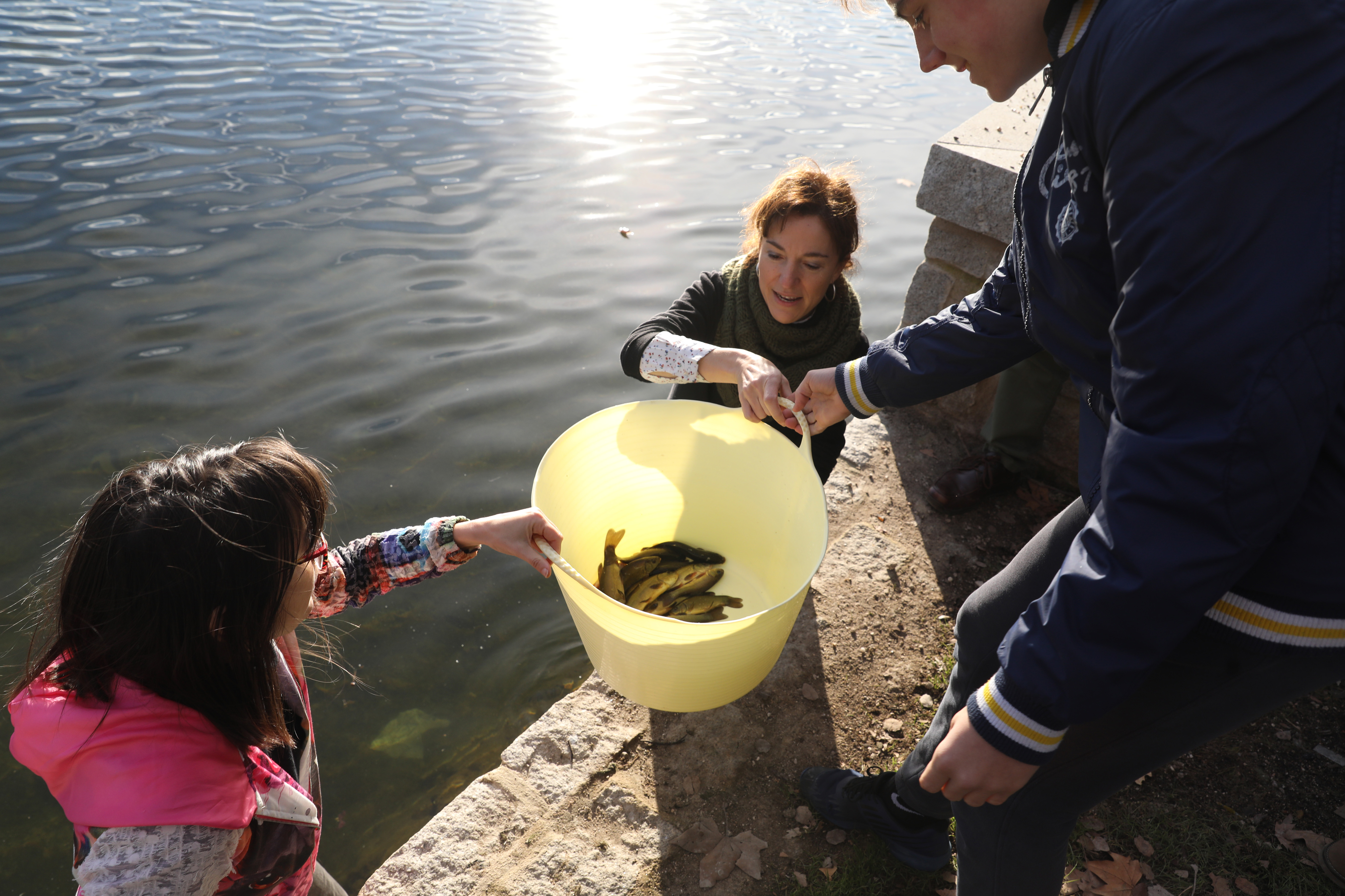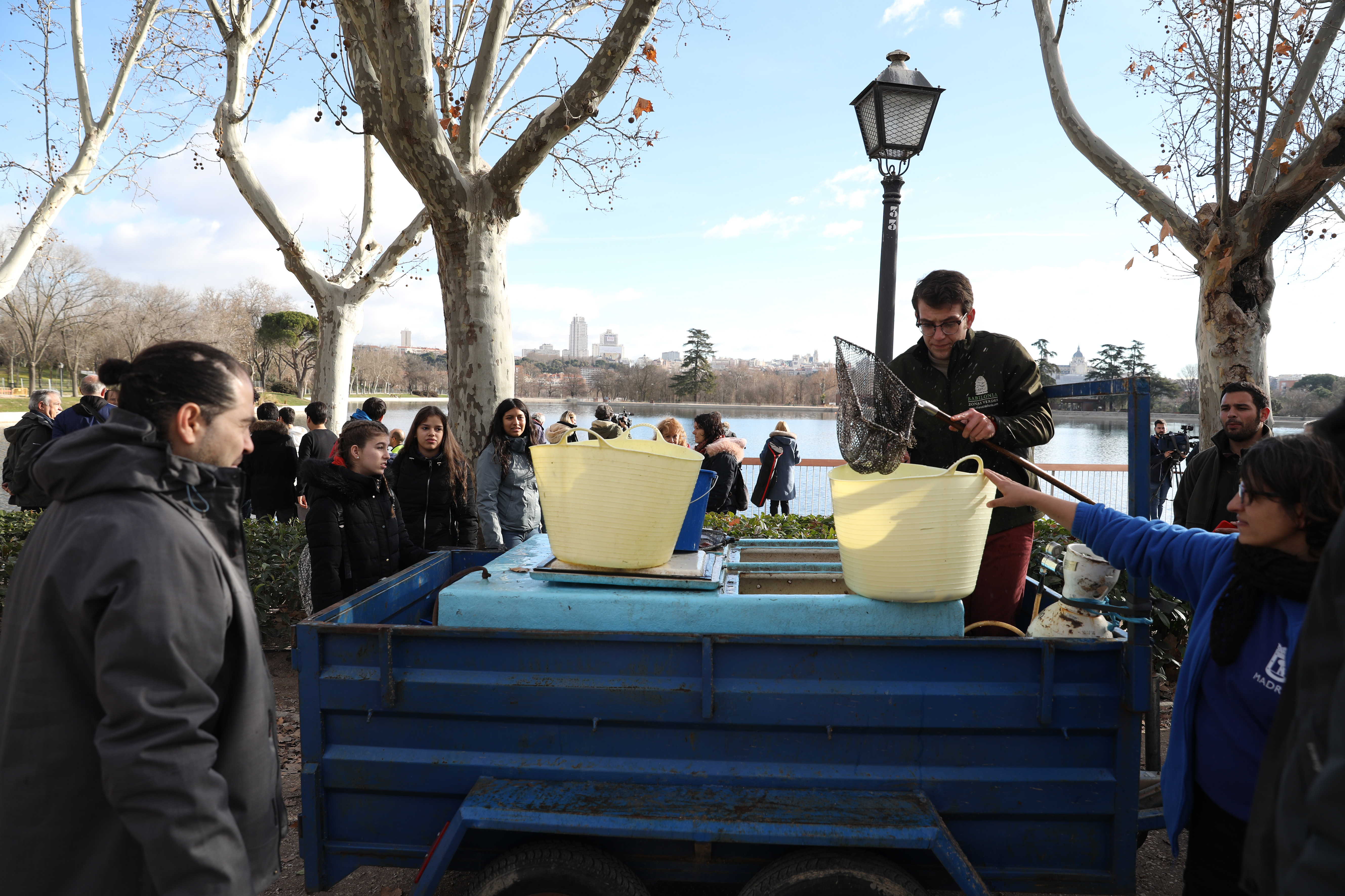 La directora general de Gestión del Agua y Zonas Verdes, Beatriz García San Gabino, ha participado hoy, jueves 24 de enero, en la suelta de 2.000 tencas en el lago de la Casa de Campo junto a un grupo de 15 estudiantes del Instituto de Educación Secundaria Blas de Otero, en el marco de una actividad organizada por el departamento de Educación Ambiental del Ayuntamiento de Madrid.