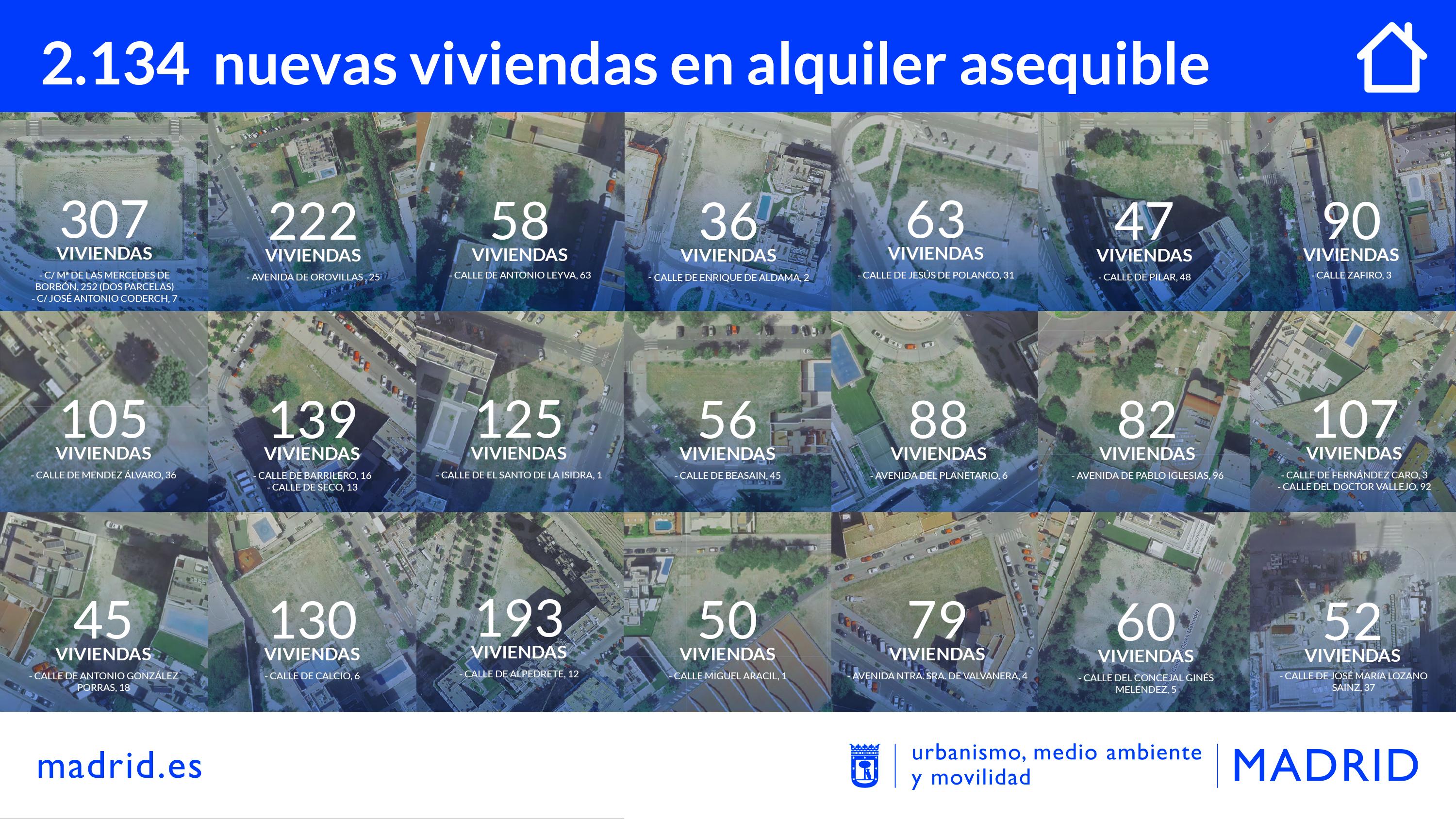 - Gracias a la cesión de 25 parcelas a tres promotoras con un plazo de 45 años, se construirán 2.134 viviendas en régimen de alquiler asequible, y otras 640 viviendas se construirán gracias a la venta de suelo a precio de alquiler reducido de otras 12 parcelas