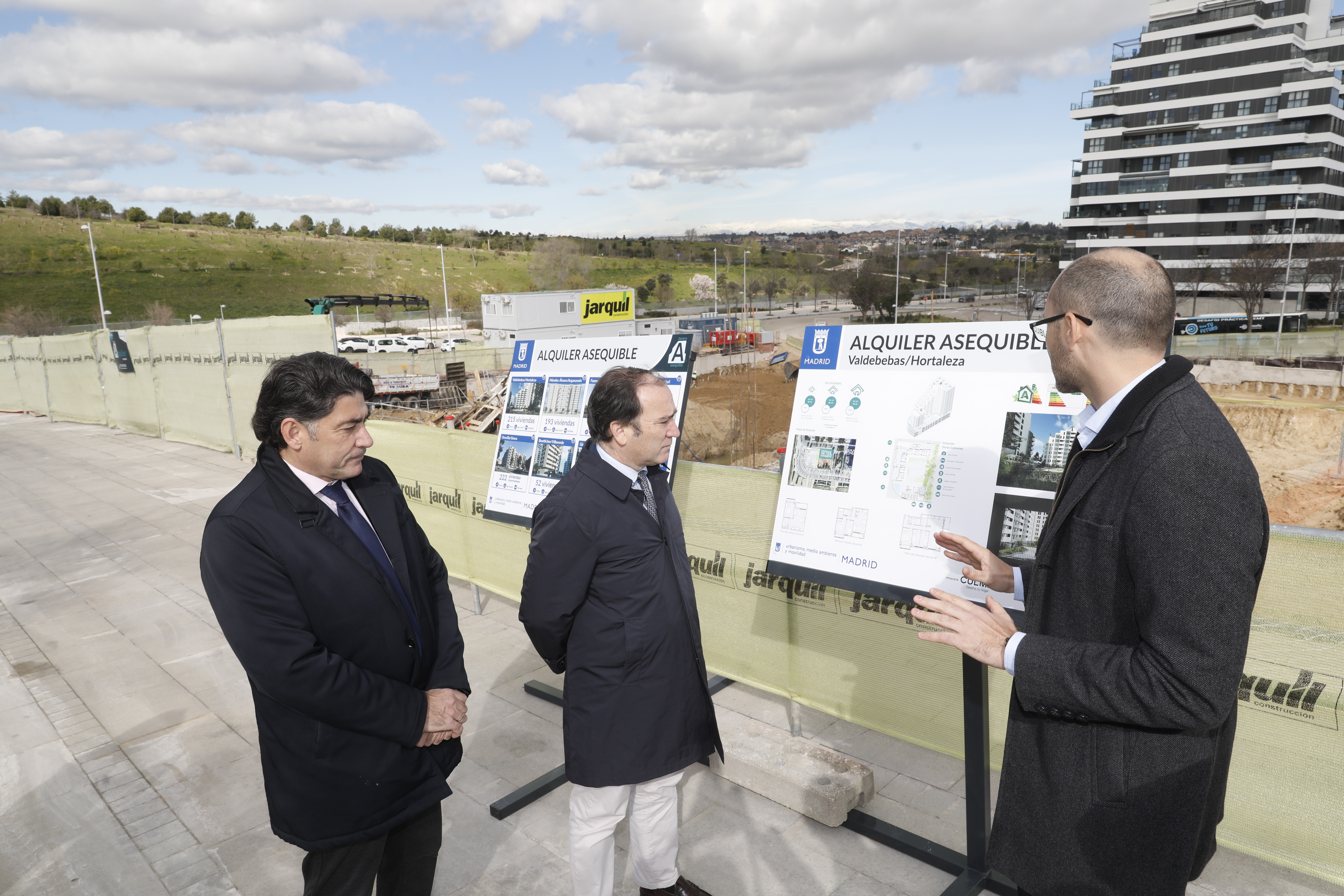 El delegado de Urbanismo, Medio Ambiente y Movilidad, Borja Carabante, ha visitado esta mañana una de las 25 parcelas que ha cedido el Ayuntamiento de Madrid para la construcción de viviendas en régimen de alquiler asequible. Acompañado por el concejal del distrito de Hortaleza, David Pérez, el responsable del ramo se ha desplazado hasta el 252 de la calle de María de las Mercedes de Borbón para comprobar el desarrollo de esta promoción, que es la que albergará un mayor número de viviendas y que está ejecutando la promotora Culmia sobre estos terrenos ubicados en el barrio de Valdebebas.