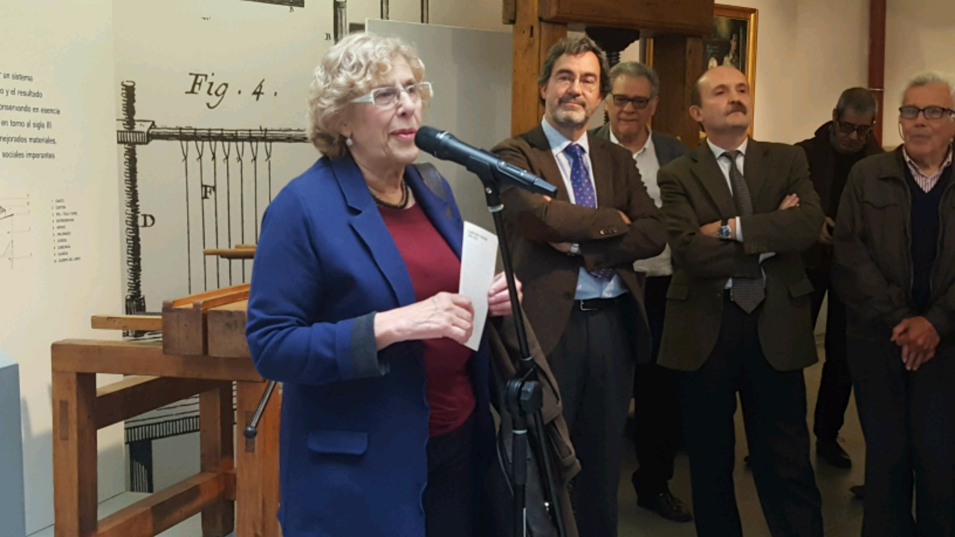 La alcaldesa de Madrid, Manuela Carmena, y la delegada del Área de Cultura y Deportes, Celia Mayer, durante la inauguración de la exposición “Letras clandestinas, 1939-1976” en la Imprenta Municipal-Artes del Libro