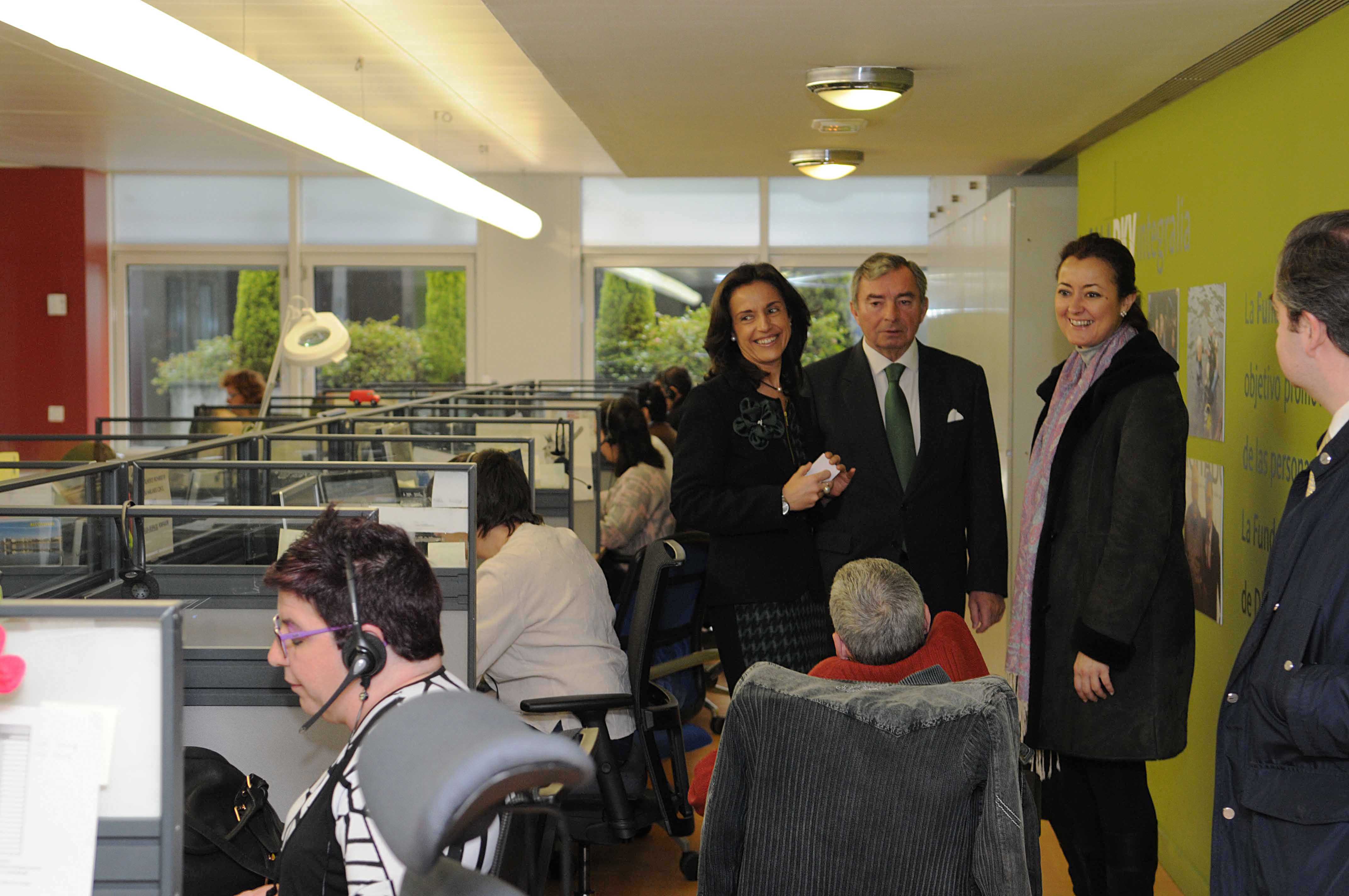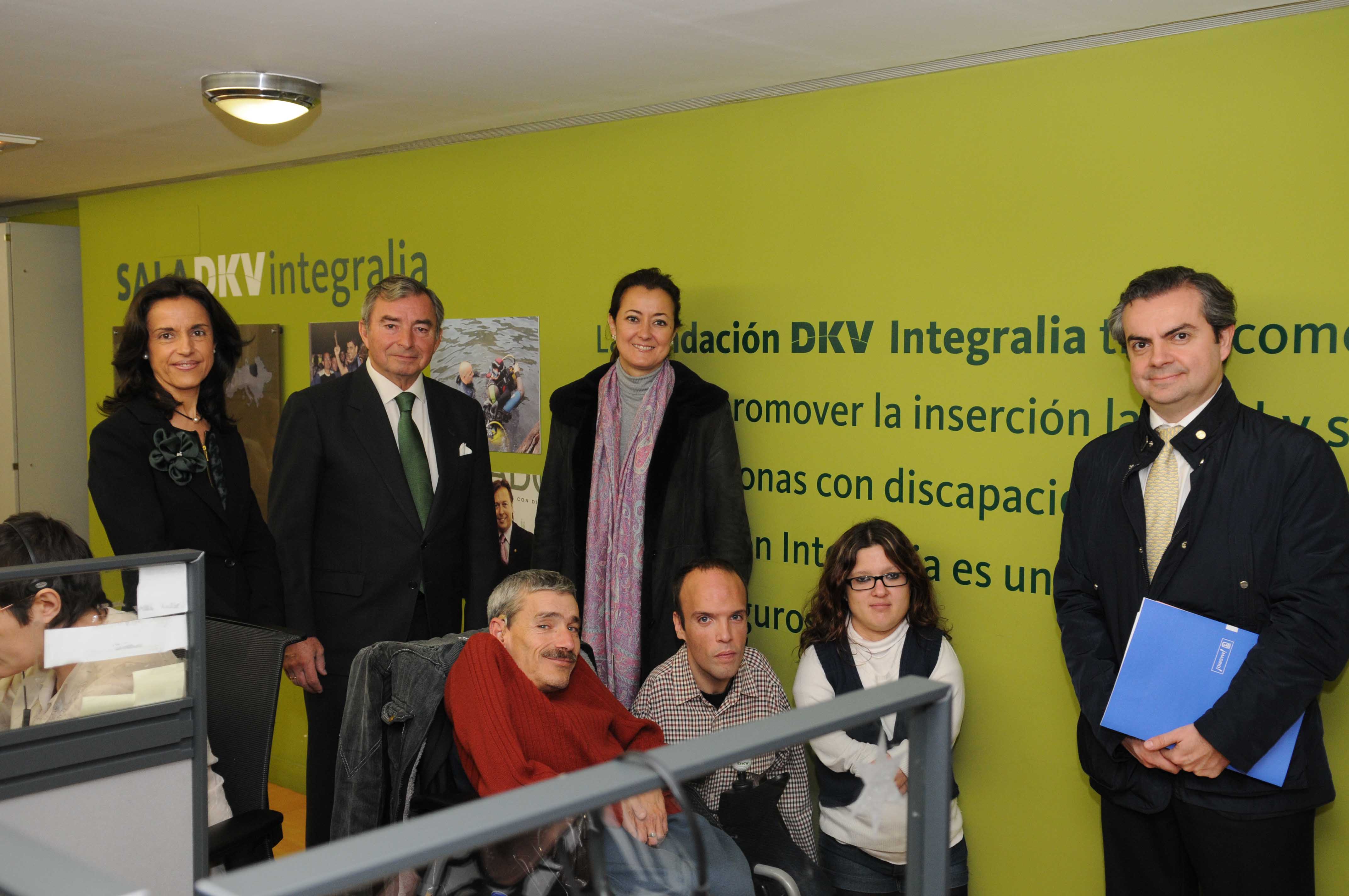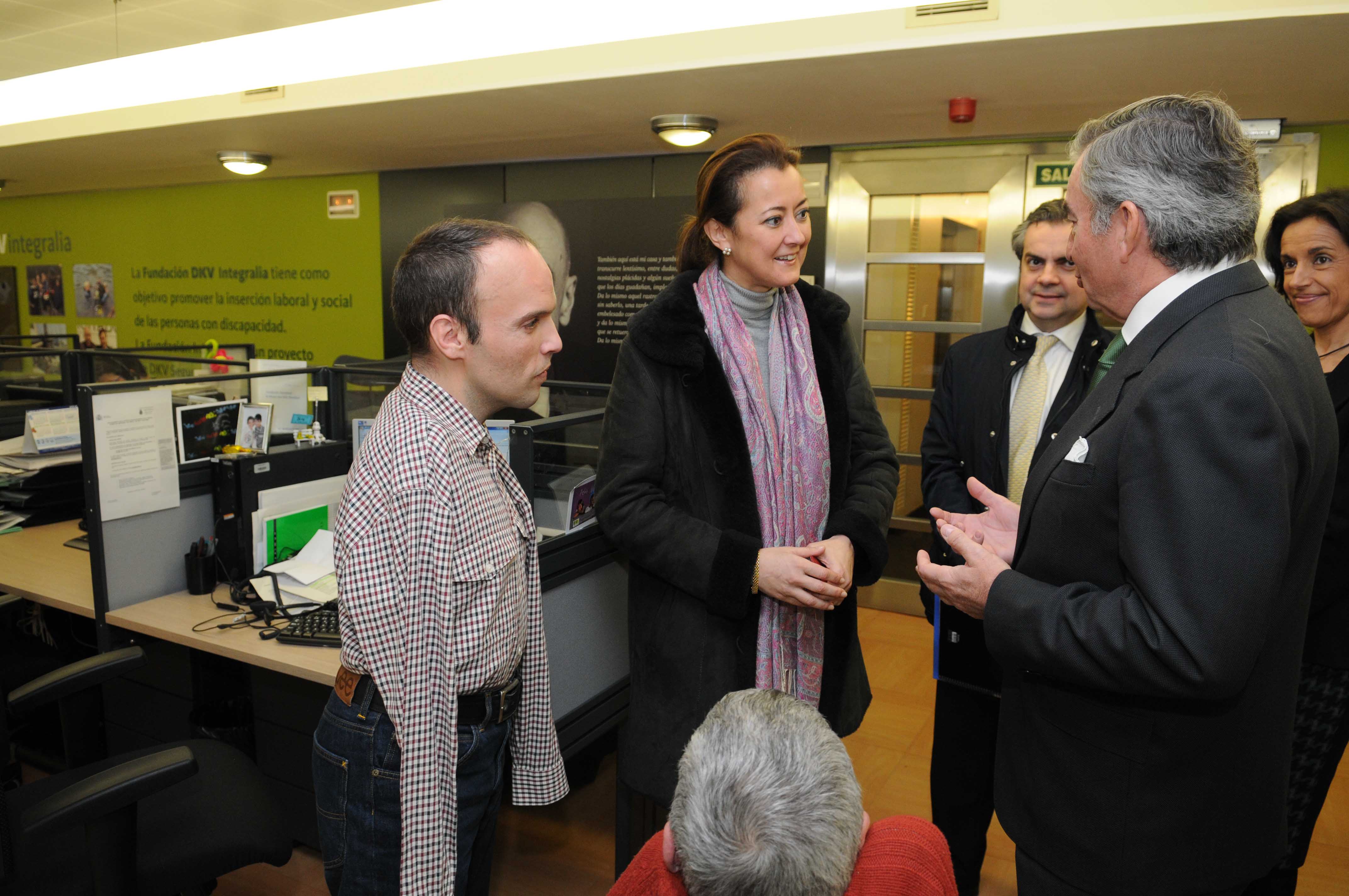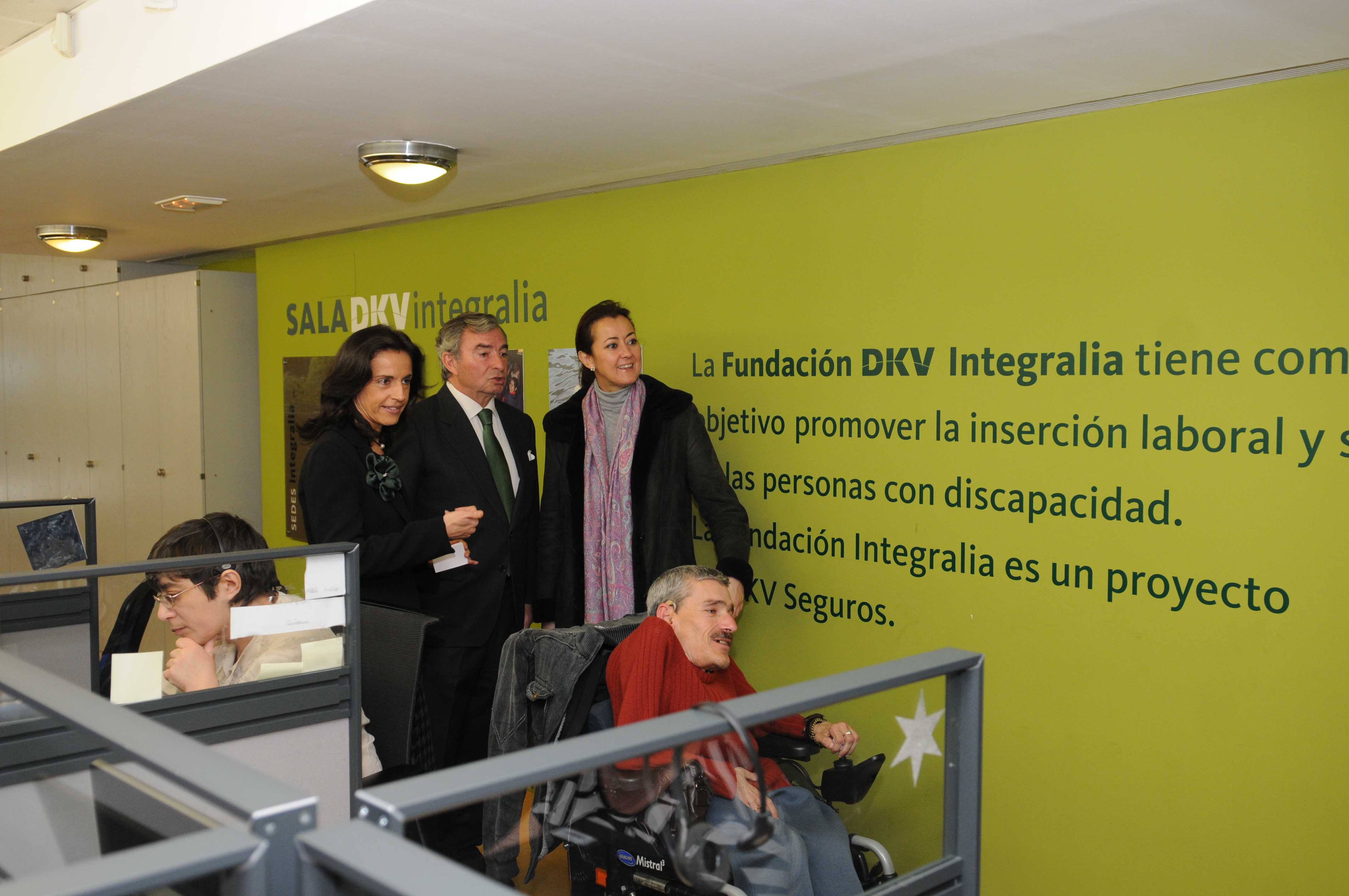 Lola Navarro, delegada de Familia, Servicios Sociales y Participación Ciudadana, ha recorrido hoy las instalaciones que la Fundación DKV Integralia, entidad sin ánimo de lucro nacida en el año 2000 fruto del compromiso de DKV Seguros con la responsabilidad social empresarial. Su objetivo era facilitar la integración social y laboral de las personas con discapacidad. Hoy cuenta con más de 213 empleados afectados por discapacidades físicas graves (lesiones medulares, paraplejias y tetraplejias) o por enfermedades degenerativas, como la esclerosis múltiple o la diabetes crónica. La Fundación DKV Integralia prevé aumentar su plantilla en los dos próximos años con 110 nuevas incorporaciones de personas con discapacidad, 50 personas integradas en empresas ordinarias y la apertura de un nuevo centro en Zaragoza y el desarrollo de los dos primeros proyectos internacionales, en Colombia y Perú. Acompañada por el presidente de DKV Seguros, Javier Vega de Seoane, y por la directora de la Fundación DKV Integralia, Cristina González Hipólito, la delegada ha conocido el funcionamiento del contact center, uno de los que la Fundación ha instalado en sus primeros doce años de andadura por la geografía española, siguiendo la estela del primero, el de El Prat de Llobregat (Barcelona), que marcó un nueva senda en Europa al contar con una plantilla integrada exclusivamente por personas con discapacidad./