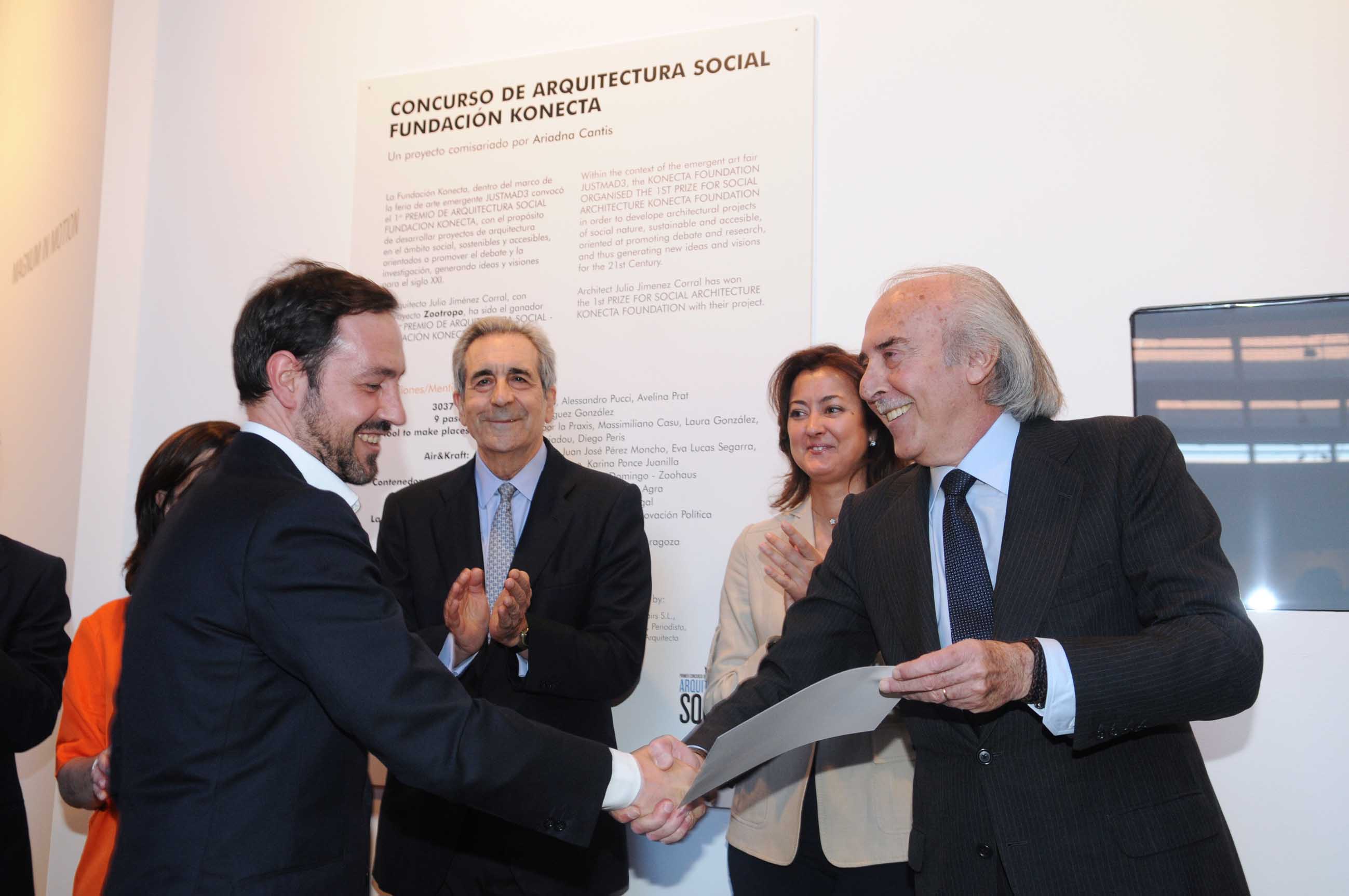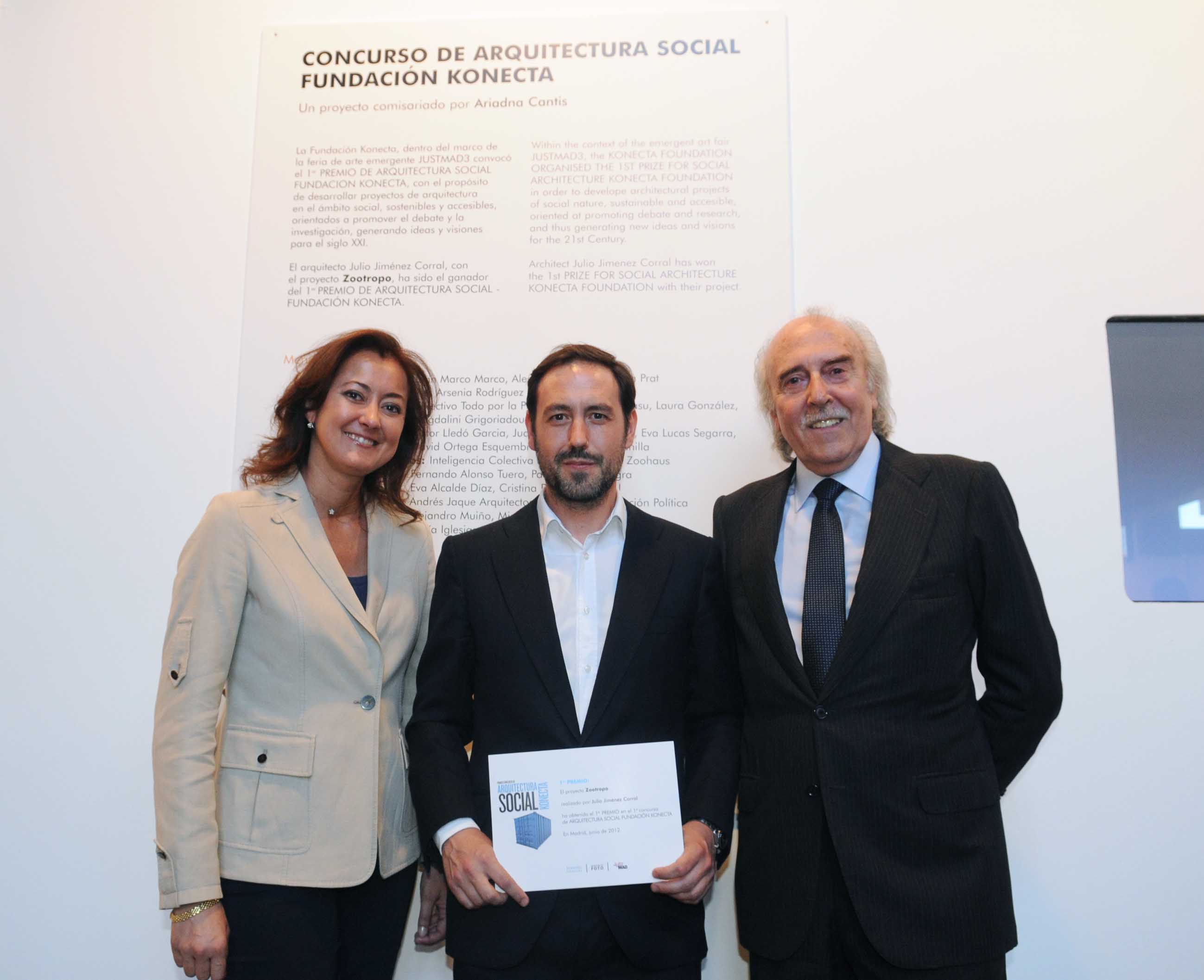 Zootropo es el proyecto que ha resultado ganador del Primer Premio de Arquitectura Social-Fundación Konecta. Su autor, el arquitecto Julio Jiménez Corral describe en su diseño el reflejo de una sociedad que asume responsabilidades y que está cada vez más implicada en los asuntos sociales de su comunidad. La delegada de Familia y Servicios Sociales, Lola Navarro encargada de entregar esta tarde el Premio, ha destacado la importancia de la sociedad actual “porque hemos asumido como valores propios la responsabilidad social, la sostenibilidad y la accesibilidad que hacen nuestra convivencia más abierta, más plural y más fuerte porque una sociedad que es abierta no puede tener limitaciones para las personas con algún tipo de discapacidad”. Al concurso, convocado por Konecta, grupo dedicado a la labor y al compromiso social, se presentaron 50 proyectos. Además del premio, dotado con 10.000 euros, se entregaron diez menciones especiales por su interés social. Los once proyectos mejor calificados están exhibiéndose en la Feria de Fotografía, MadridFoto 2012, que se celebra hasta el próximo domingo en Matadero Madrid.