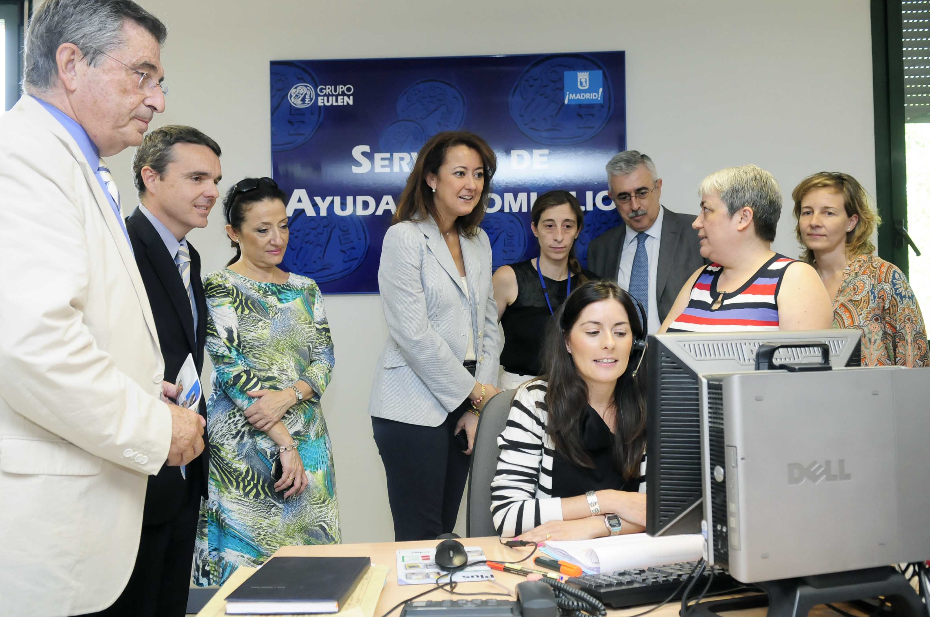 La delegada de Familia y Servicios Sociales, Lola Navarro, ha visitado hoy las instalaciones de EULEN Servicios Sociosanitarios acompañada de la directora general de Mayores y Atención Social, Carmen González. Durante su visita la delegada ha conocido, de primera mano, las labores que realiza esta empresa en el servicio de ayuda a domicilio así como la alta preparación técnica del personal con el que cuenta. El doctor Juan Ramón Pérez, Geriatra y director de Relaciones Institucionales de EULEN Servicios Sociosanitarios, ha mostrado a Navarro las instalaciones, el servicio de coordinación y las aulas de formación./
