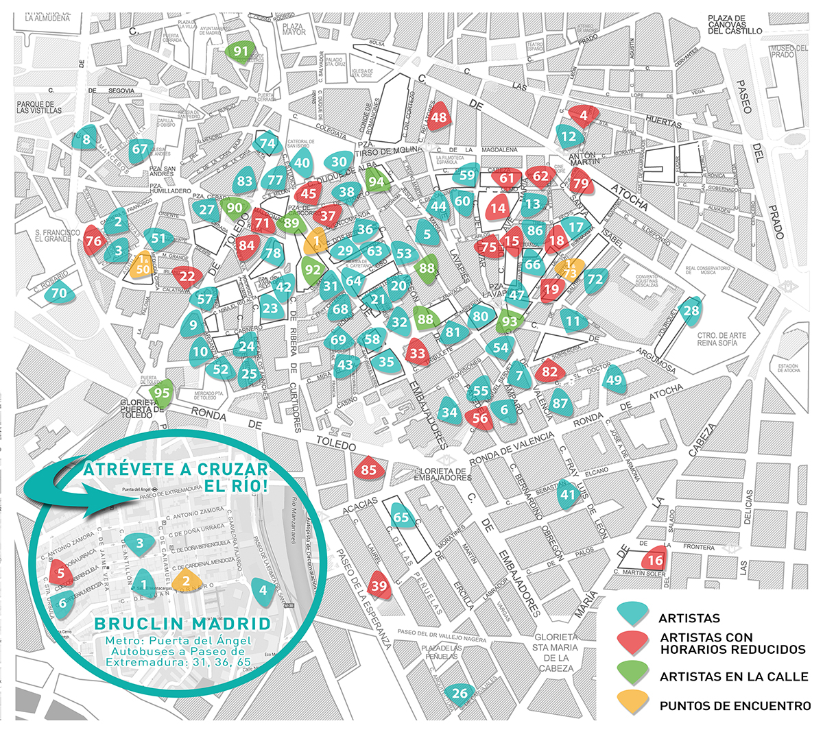 Para conocer la ubicación de los talleres los interesados deberán dirigirse a uno de los cuatro puntos de encuentro (Café Pavón, c/ Embajadores 9; La Noche Boca Arriba, c/ Salitre 30; Espacio Mediodía, c/ Mediodía Chica 10; y Moratón Mendoza, c/ Cardenal Mendoza 15) en los que podrán adquirir por 5€ un kit compuesto por un mapa, un catálogo con información de cada artista participante y una chapa para ser reconocido como público.