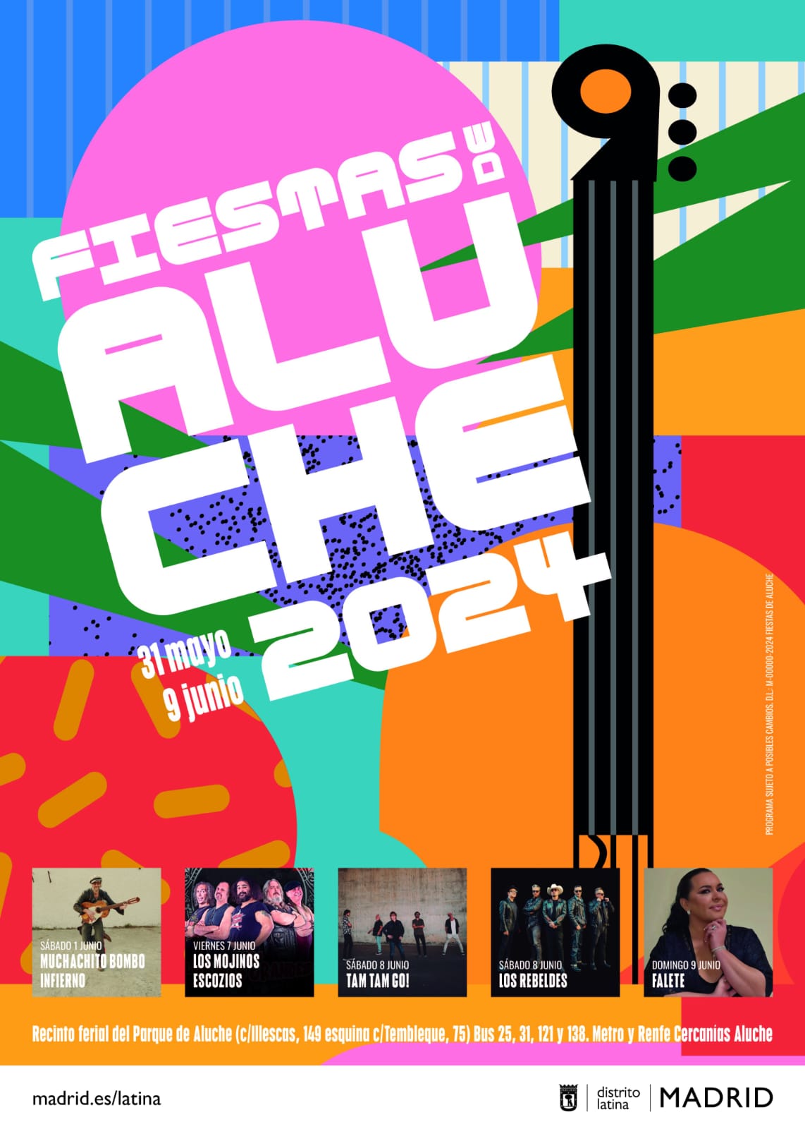 Las fiestas de Aluche llegan al recinto ferial del parque de Aluche del 31 de mayo al 9 de junio con un extenso cartel musical y las actuaciones estelares de Los Rebeldes, Tam Tam Go, Los Mojinos Escozíos, Muchachito Bombo Infierno y, como actuación de cierre, Falete. La Junta Municipal de Latina ha contado con asociaciones y entidades locales en el diseño de los festejos populares del distrito, que incluyen diez días de conciertos, entretenimiento intergeneracional, el ambiente de barrio de las casetas y los tradicionales fuegos artificiales. Este año, será la escuela de música tradicional La Dulzaina de Aluche, con gran arraigo vecinal, la encargada del pregón inaugural, el viernes 31 a las 22:30 h. Las gaitas de la banda celta Lume de Biqueira animarán el ambiente desde las 20:45 h como antesala al pregón, tras el que se dará paso al pop-rock de la orquesta Slabon.