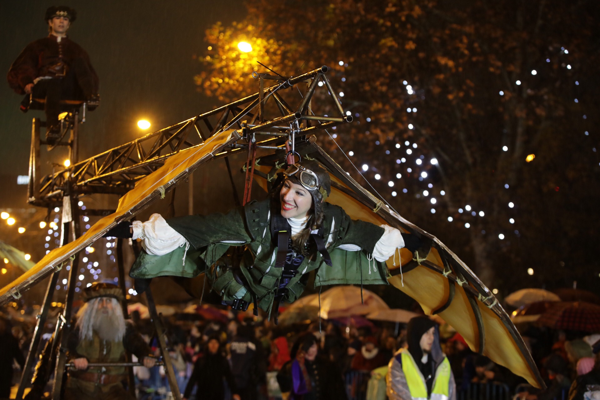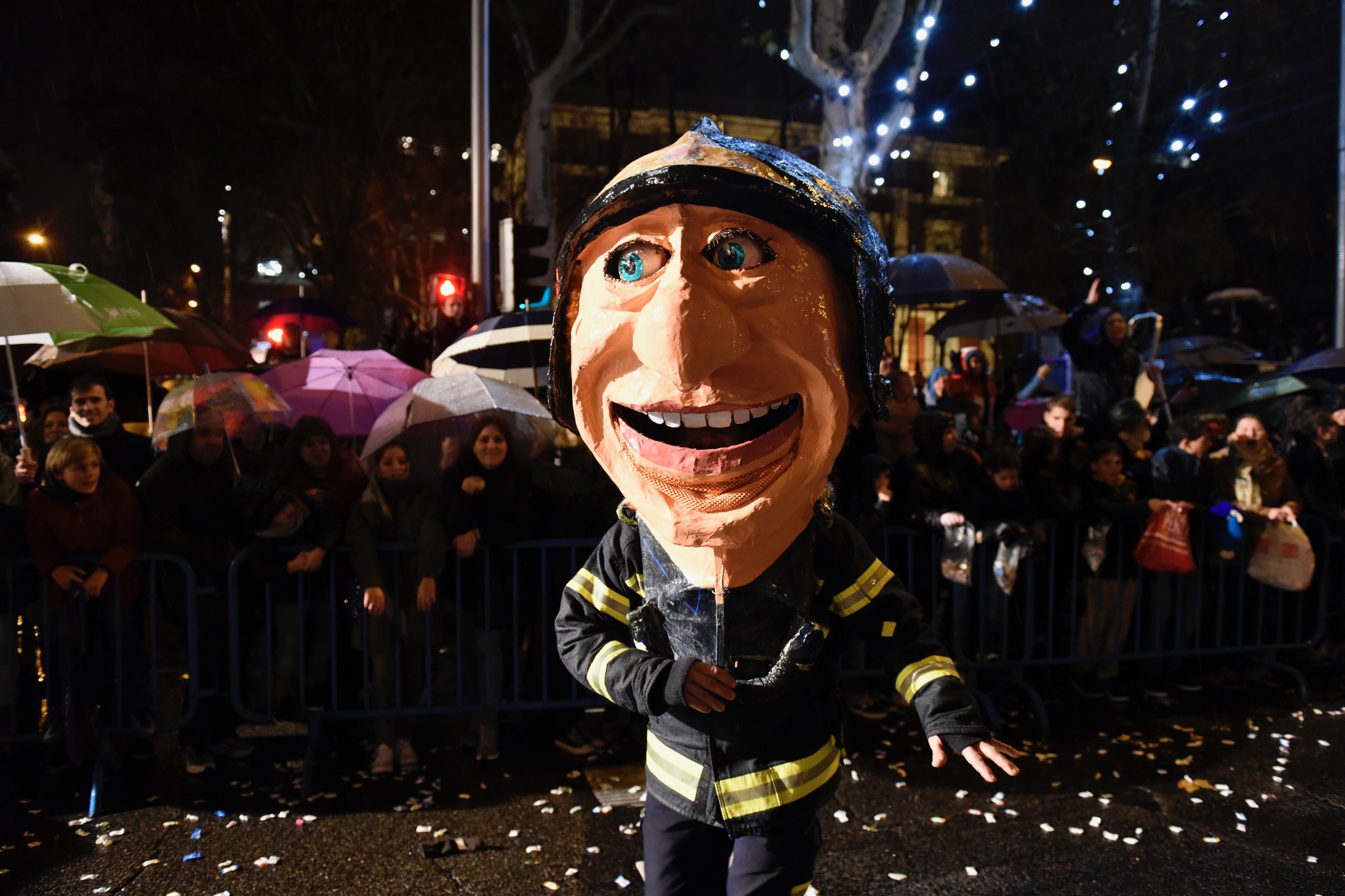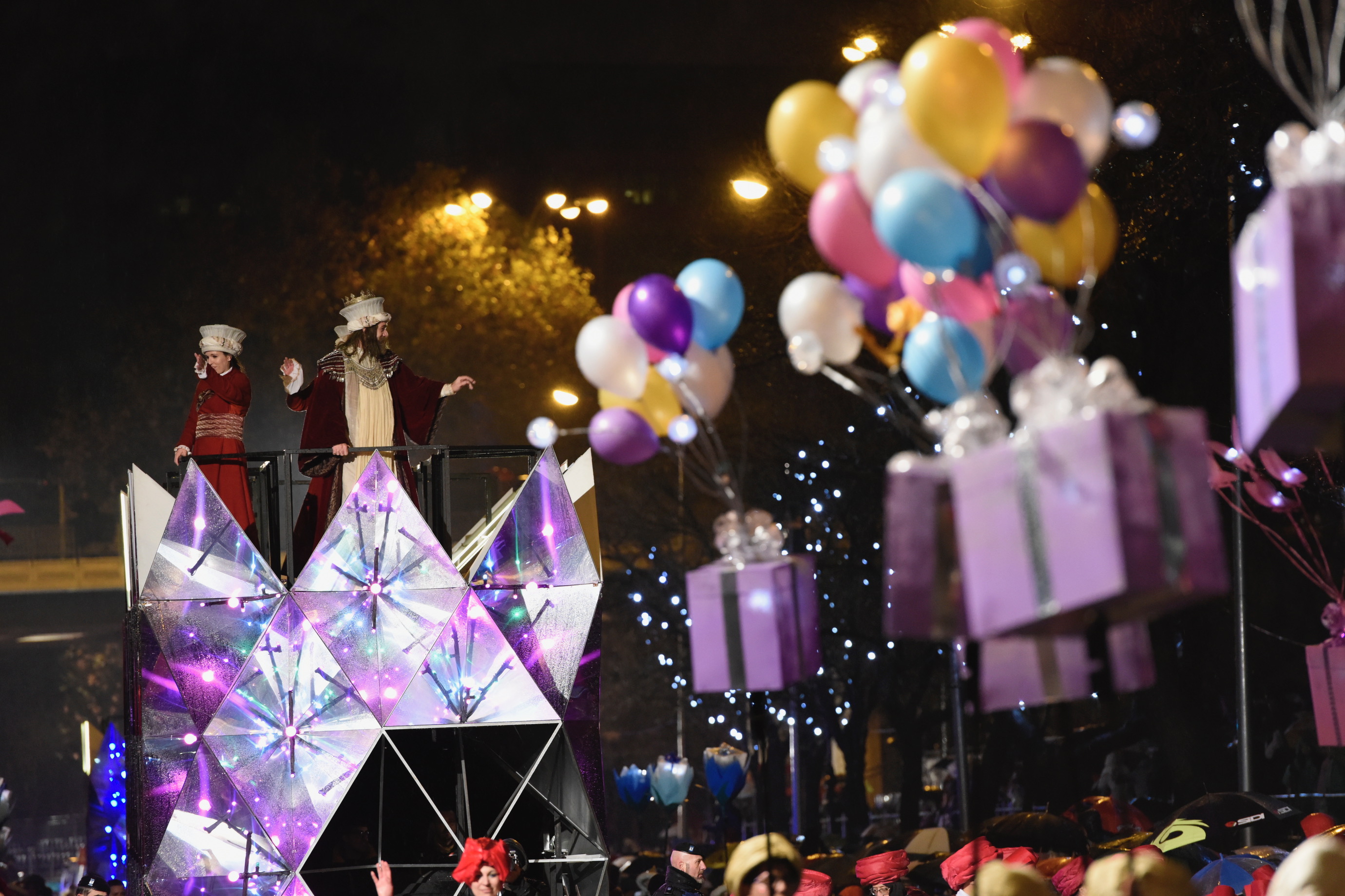 Cerca de 2.000 personas, 14 carrozas, 30 posiciones, nueve compañías de artes escénicas, marionetas gigantes, artefactos voladores, bailarines, hinchables iluminados y más de 100 actores, han contribuido a construir un relato durante el transcurso de la Cabalgata de Reyes, que a pesar de la lluvia ha transcurrido con normalidad.