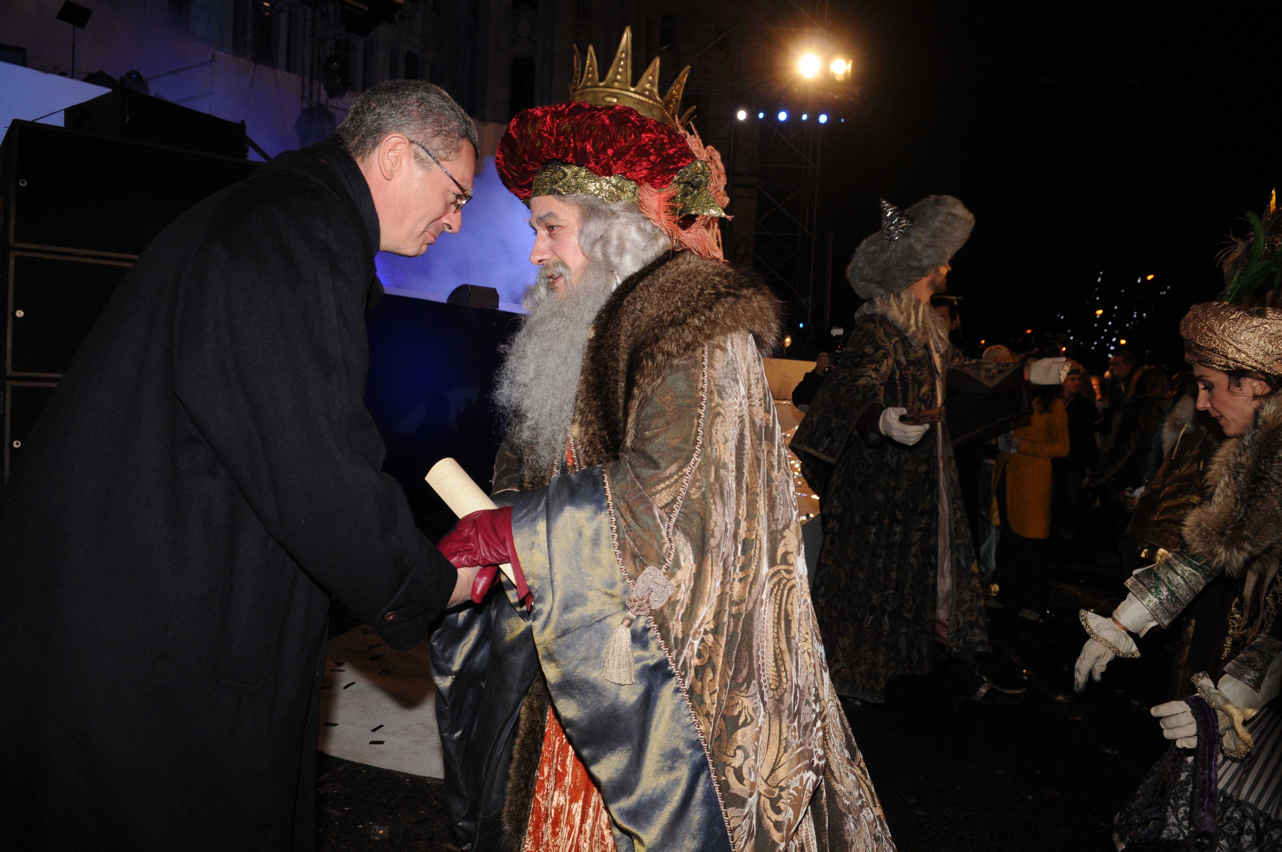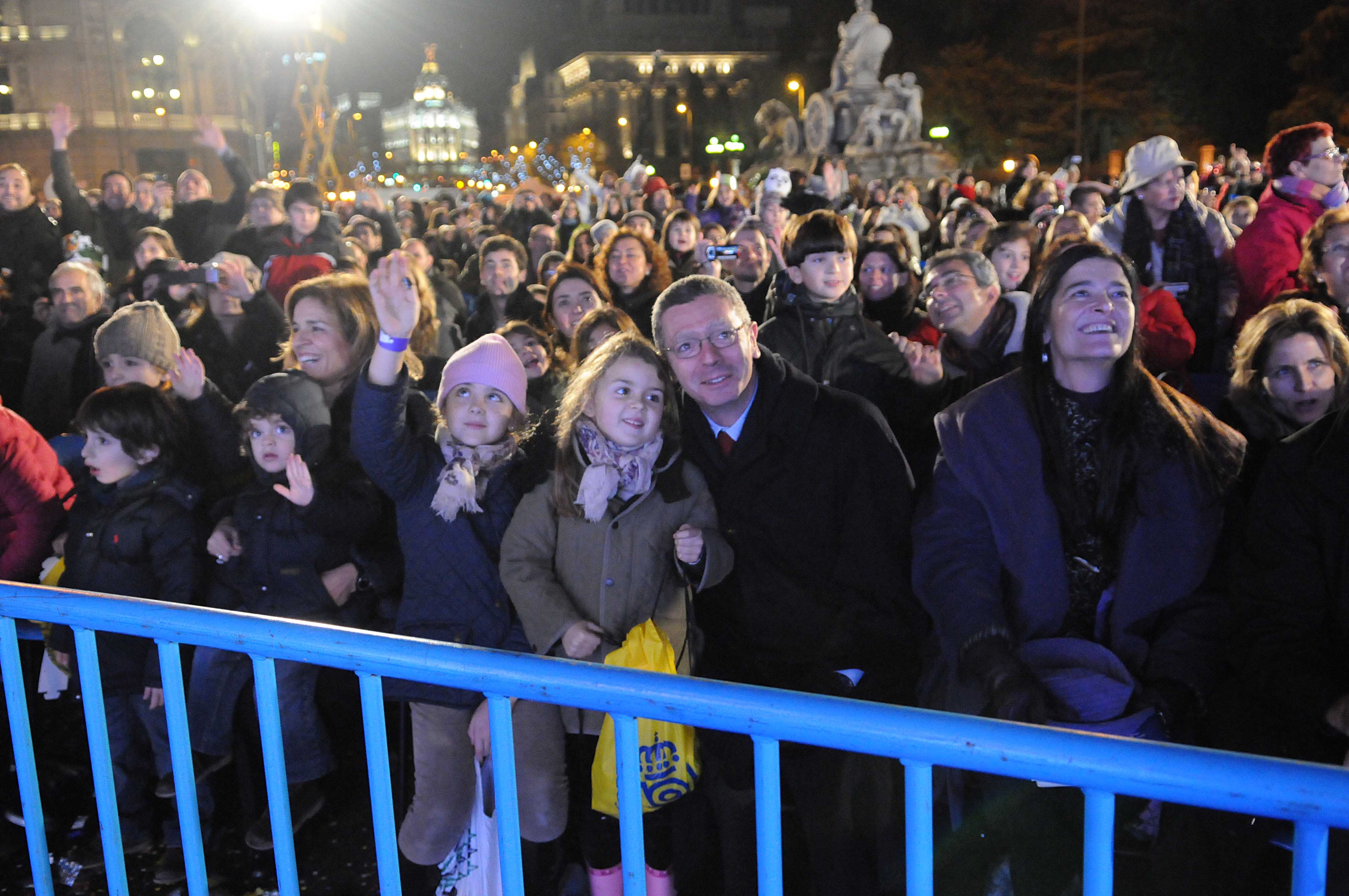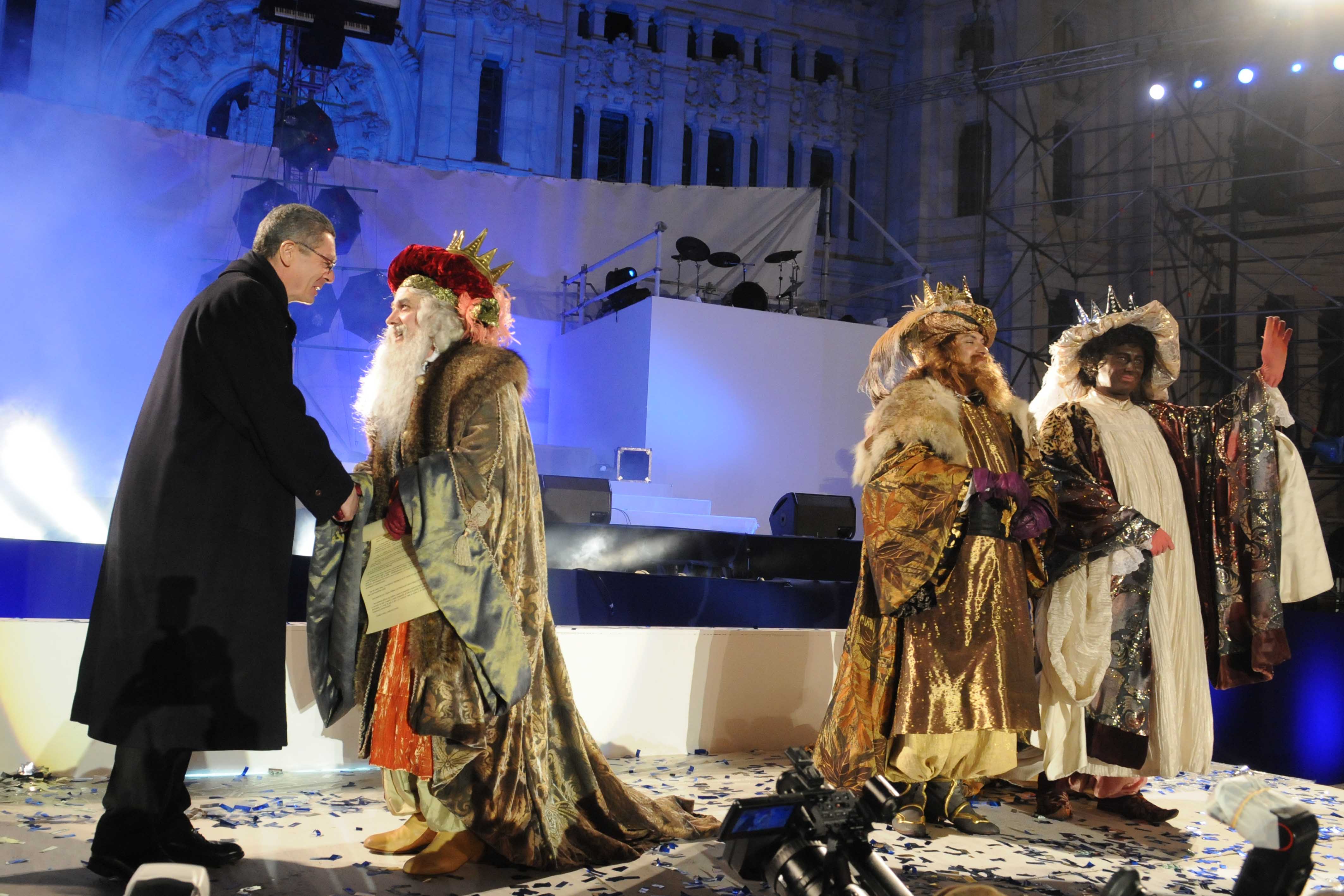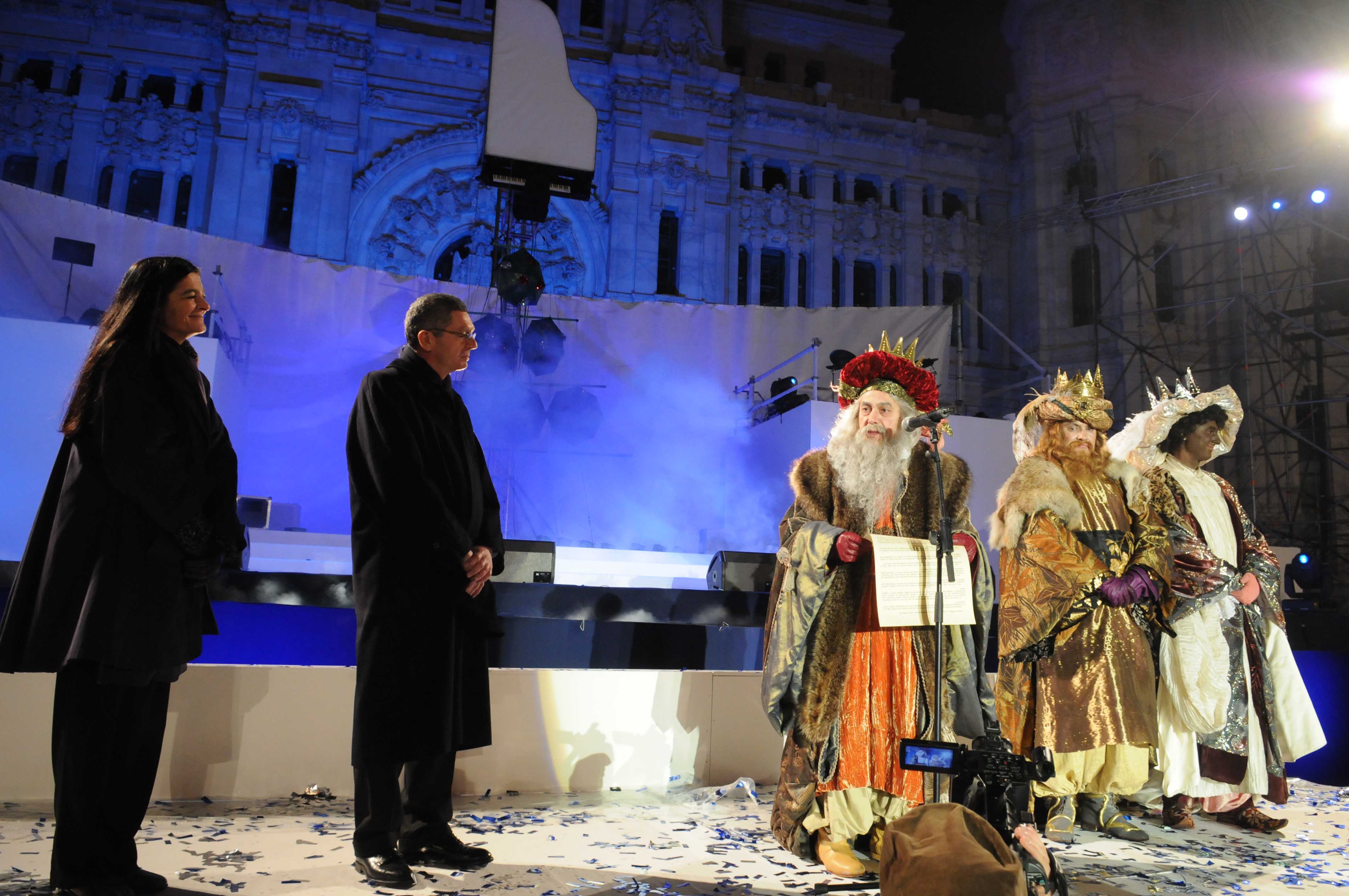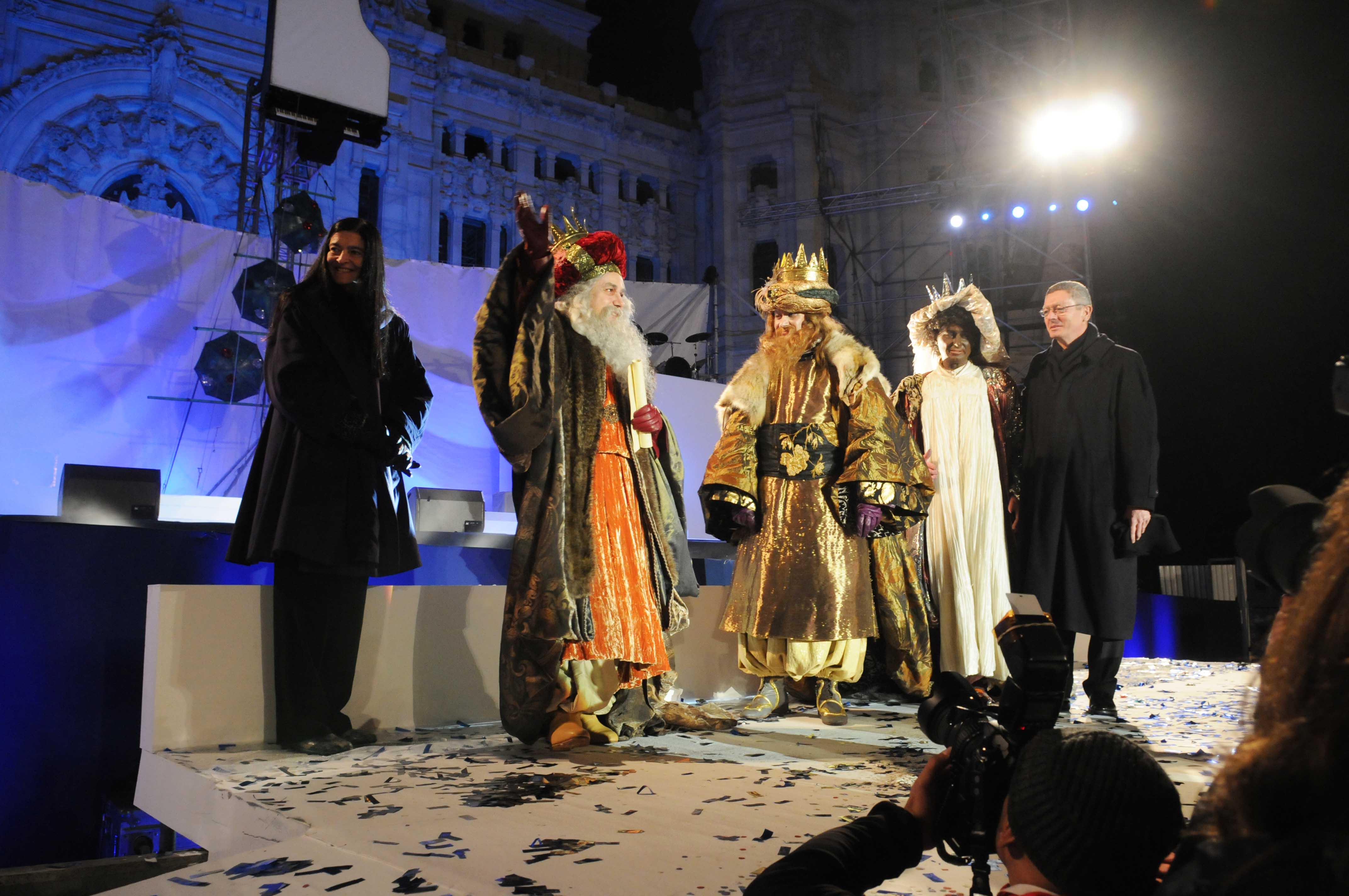 La Cabalgata de Melchor, Gaspar y Baltasar, desfiló esta tarde-noche por las calles de Madrid ante la atenta y emocionada mirada de miles de niños madrileños. En la Plaza de Cibeles, los Reyes Magos fueron recibidos por el alcalde, Alberto Ruiz-Gallardón. En las imágenes, los Reyes y el alcalde en el momento del real recibimiento. Este año la Cabalgata estaba dedicada a los mayores a quienes el Rey Melchor recordó en sus palabras.