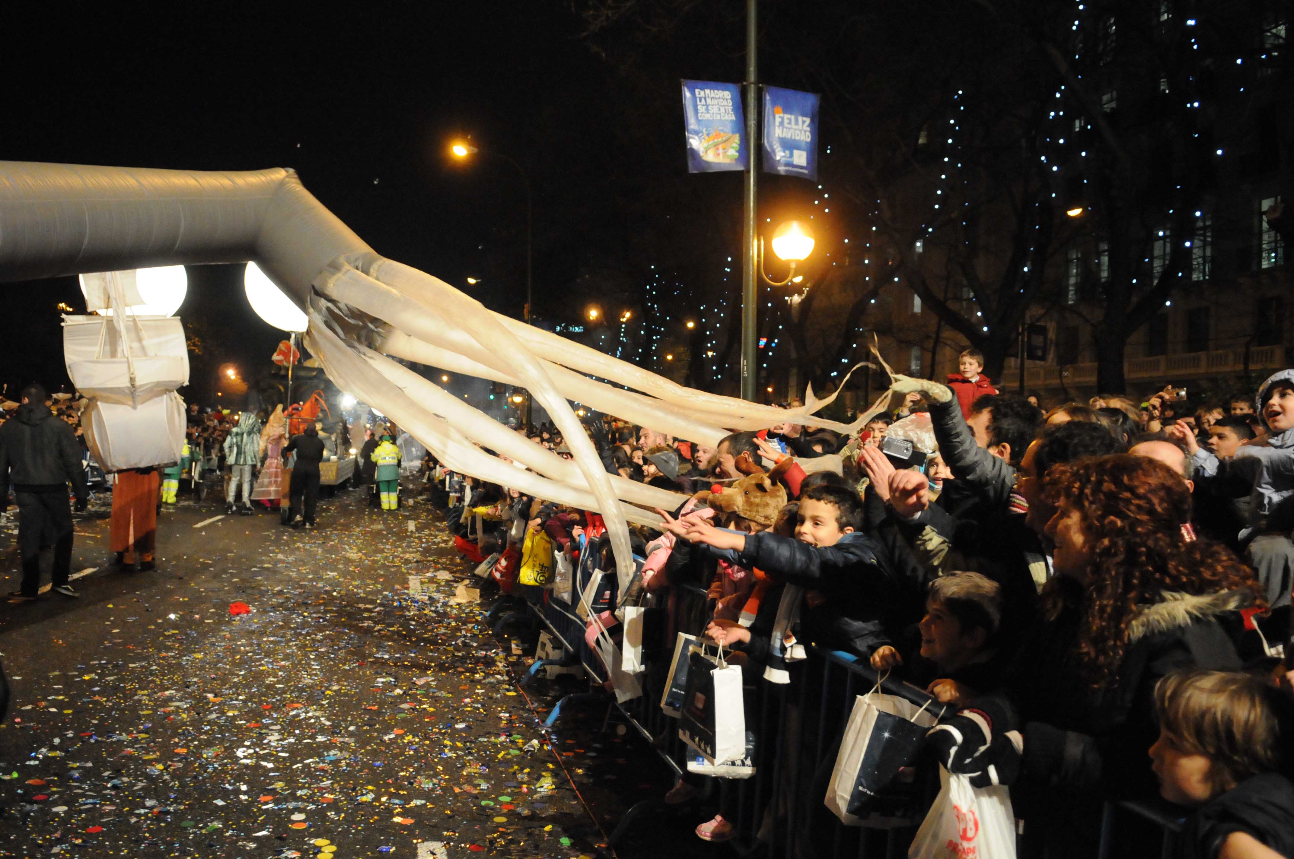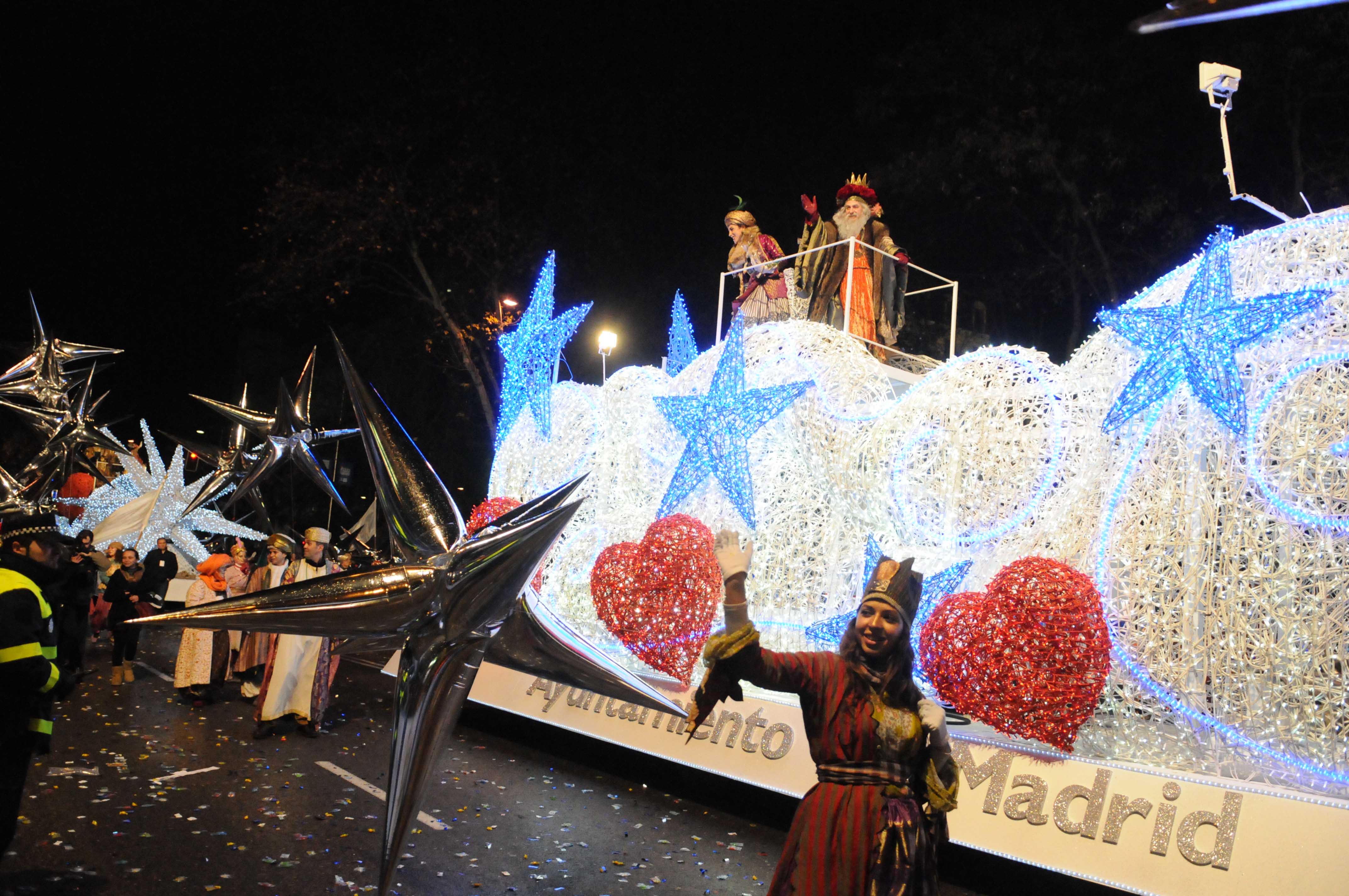 Miles de niños aguardaban esta tarde la llegada de los Reyes Magos que, procedentes del lejano Oriente, hacían su entrada en Madrid por el Paseo de la Castellana. Melchor, Gaspar y Baltasar, -representados por los concejales Miguel Ángel Villanueva (PP), Óscar Iglesias (PSOE) y Ángel Lara (IU)- precedidos por sus respectivos pajes con sendas carrozas abarrotadas de regalos para todos fueron recibidos en la Plaza de Cibeles por el alcalde, Alberto Ruiz-Gallardón, que les dio la bienvenida en nombre de los niños madrileños y les agradeció su presencia un año más en la capital. "Este día -aseguró el alcalde- es uno de los más bonitos del año y el recibimiento a los Reyes Magos, es como siempre, el acontecimiento que mayor número de madrileños reúne en la capital". El rey Melchor, que actuó como portavoz ya que es el más veterano de los tres, saludó a todos y recomendó a los más pequeños honrar a los padres y a los abuelos "que tanto se sacrifican por nosotros y a los que tanto debemos". De hecho, este año la Cabalgata ha querido rendir homenaje a los mayores. También les recordó que "lo más importante no viene dentro de una caja, lo verdaderamente importante es el mensaje de paz y de amor que renovamos juntos cada año". Melchor se despidió de los niños animándolos "a unirse y a caminar al unísono en estos tiempos difíciles. Que la inocencia y el entusiasmo de los pequeños -añadió- y la sabiduría y la lucidez de los mayores se unan avanzando, aprendiendo y creciendo juntos".