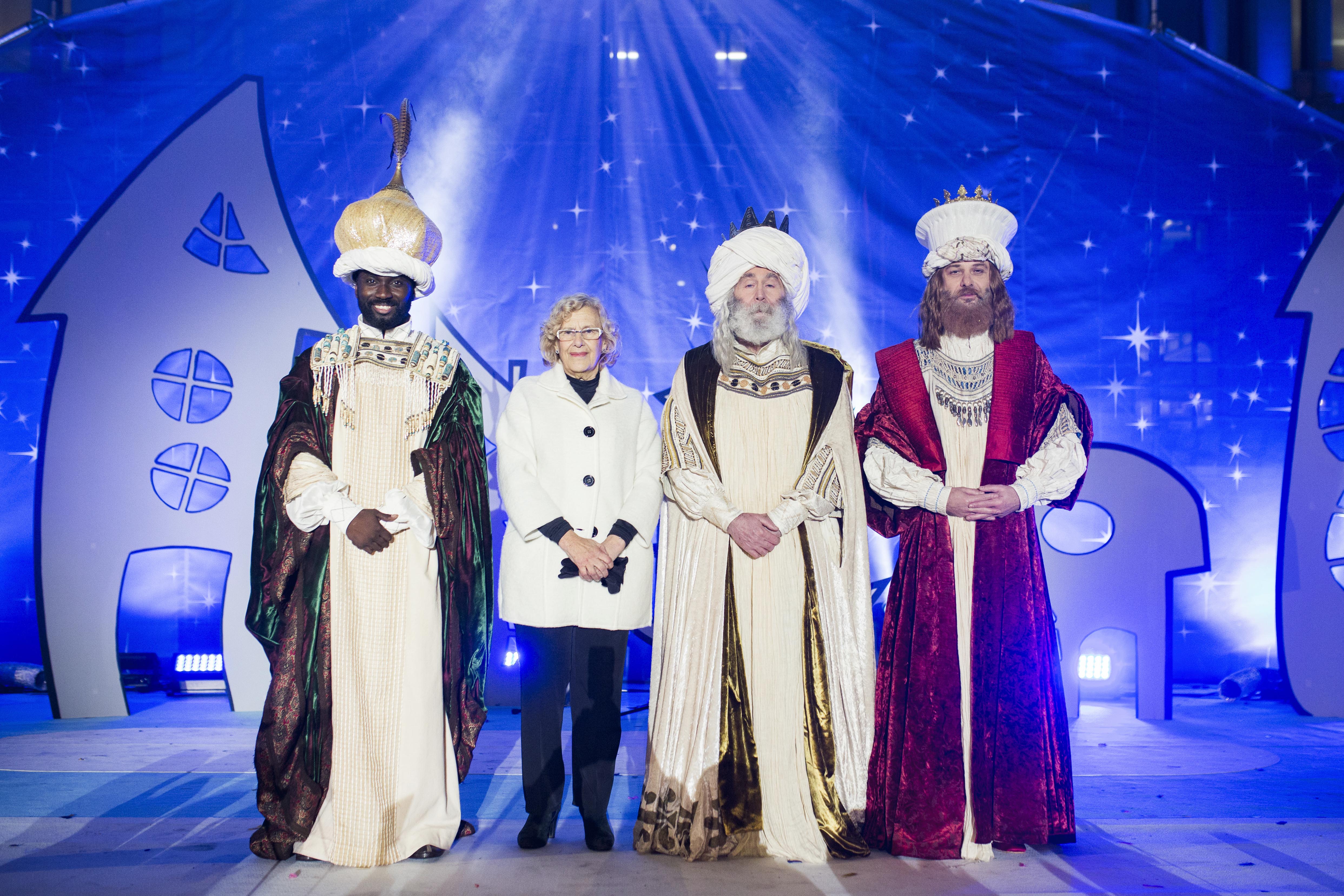 Dos mil personas, doce carrozas, siete espectáculos de compañías de arte de calle y 6 desfiles a pie, han sido algunos de los 30 espectáculos con los que ha contado la Cabalgata que ha acompañado a Sus Majestades por el centro de la ciudad. La alcaldesa de Madrid, Manuela Carmena, ha dado la bienvenida con “alegría” a los Reyes Magos a su llegada a la plaza de Cibeles. Carmena quería preguntarles detalles sobre su largo viaje “todas las cosas tan bonitas que habéis vivido, queremos saber muchas cosas de vosotros, pero sobretodo queremos que sepáis que todos los niños de Madrid están felices porque ya estáis aquí.”