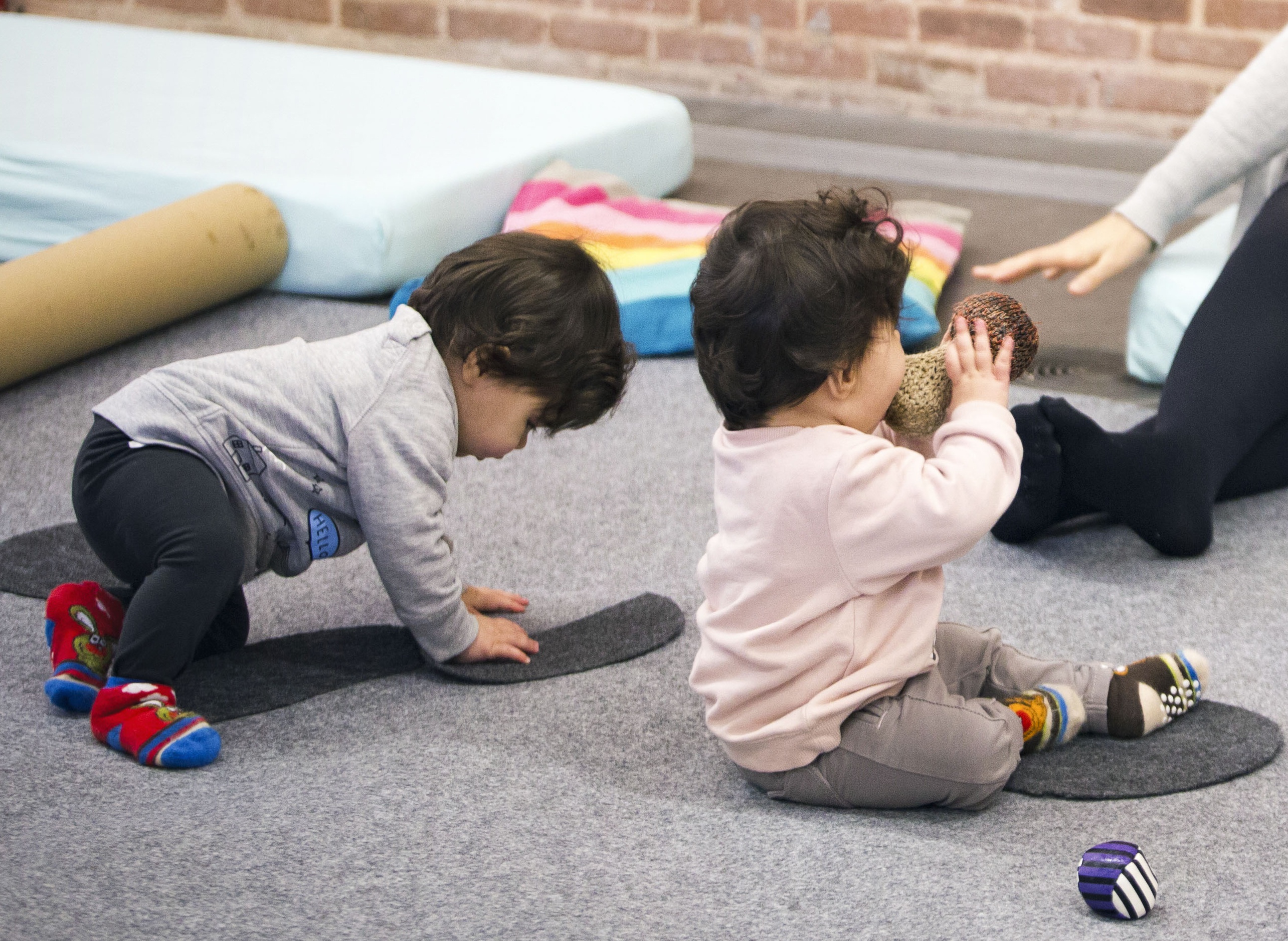 - El espacio está dispuesto para que los bebés puedan jugar, pintar y moverse descalzos entre colchonetas, rampas y telas de colores