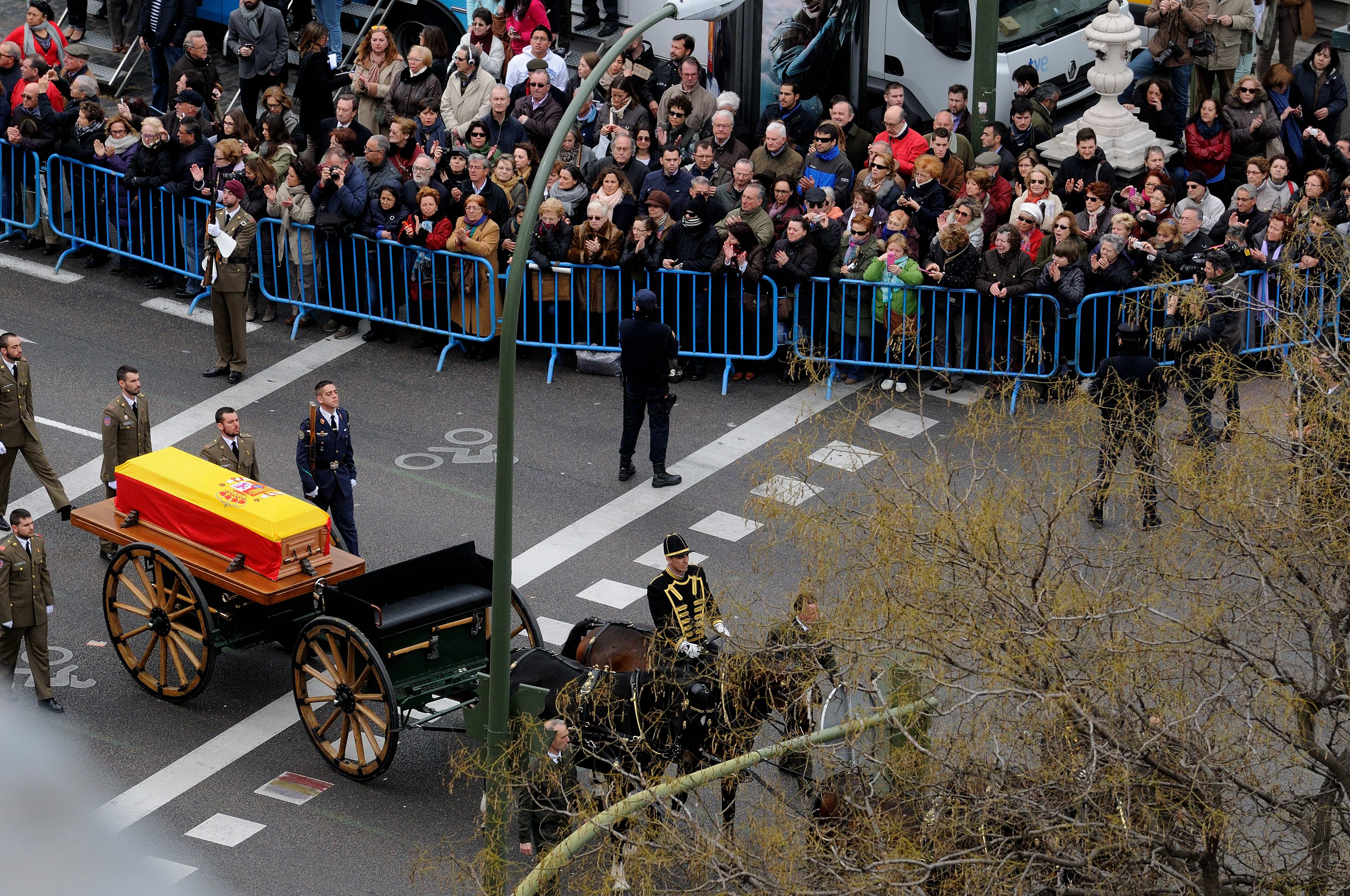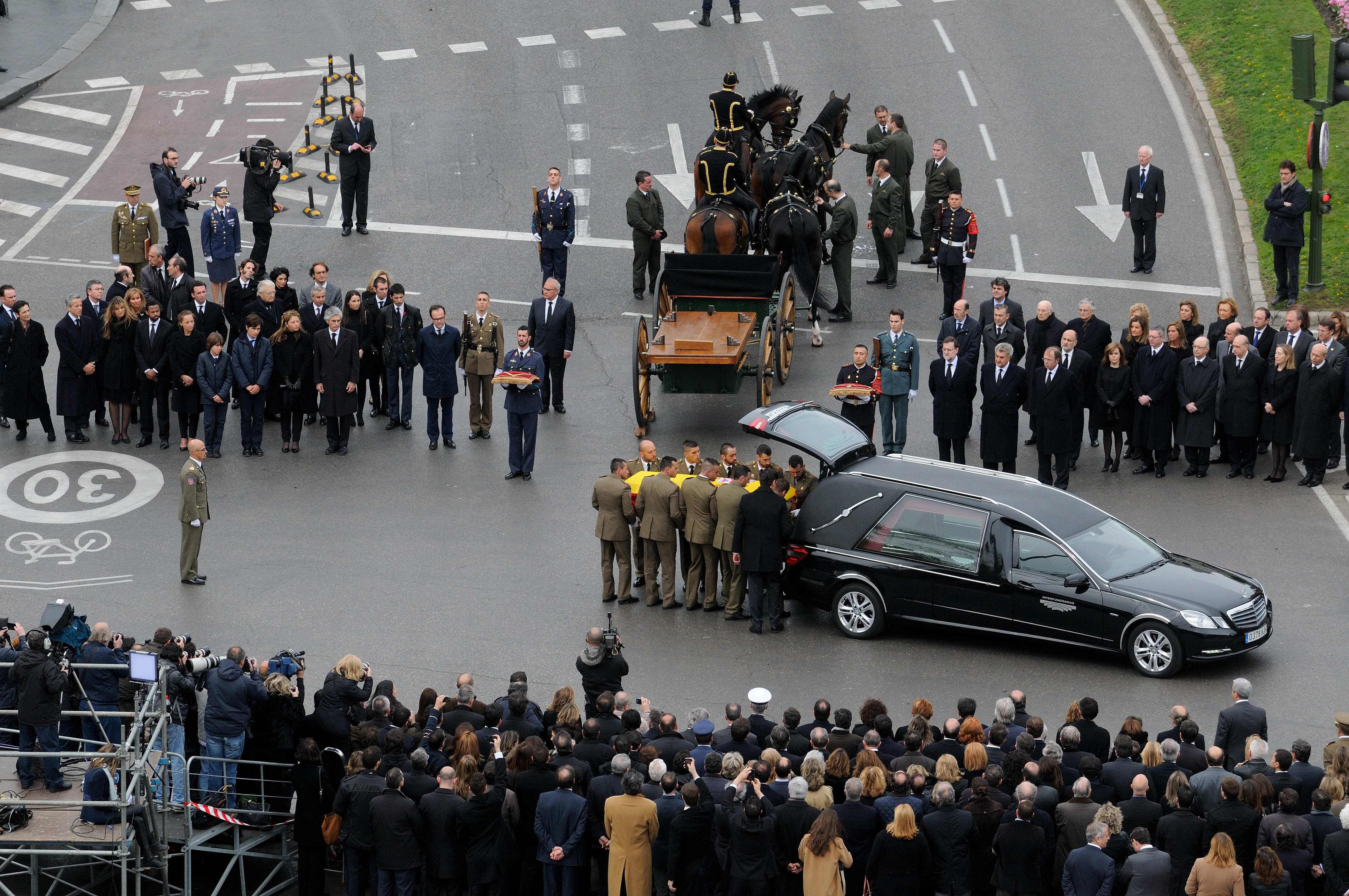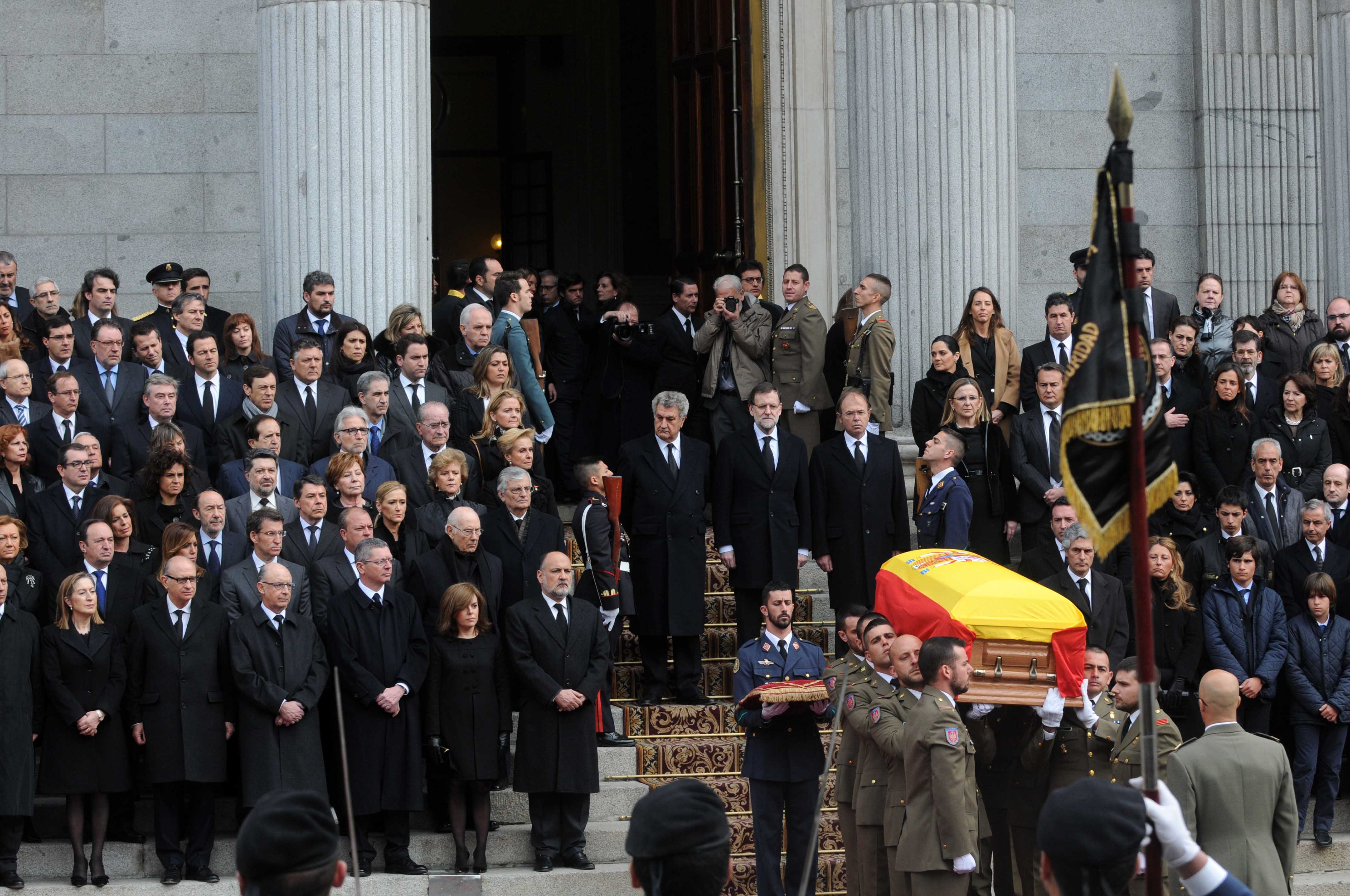 El coche fúnebre y el cortejo con la familia en otros vehículos han sido despedidos entre los aplausos de los ciudadanos y de las autoridades, entre las que hay que destacar al presidente del Gobierno, Mariano Rajoy; los presidentes del Congreso y del Senado, Jesús Posada y Pío García Escudero, respectivamente, la práctica totalidad de los ministros y numerosos presidentes autonómicos.