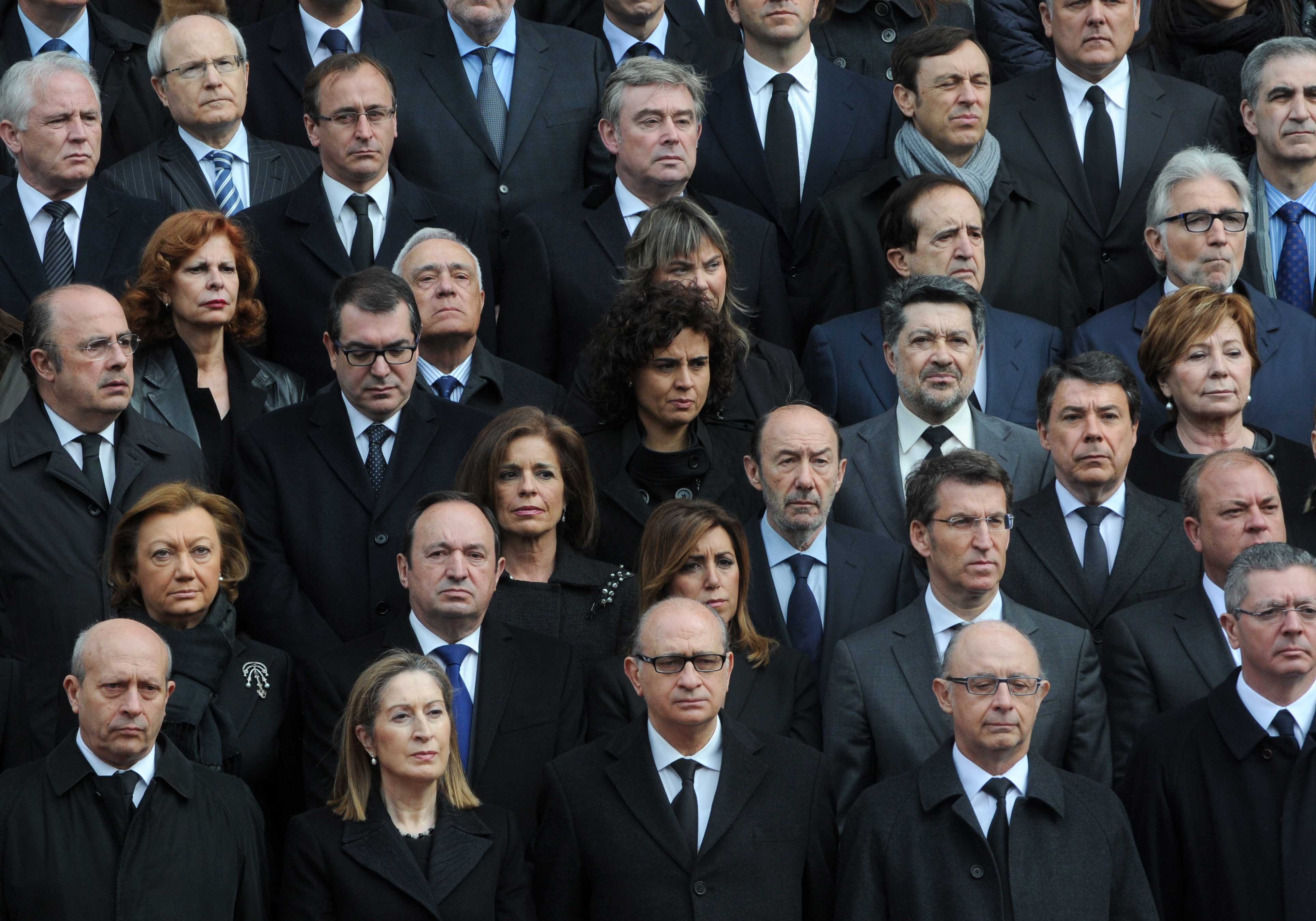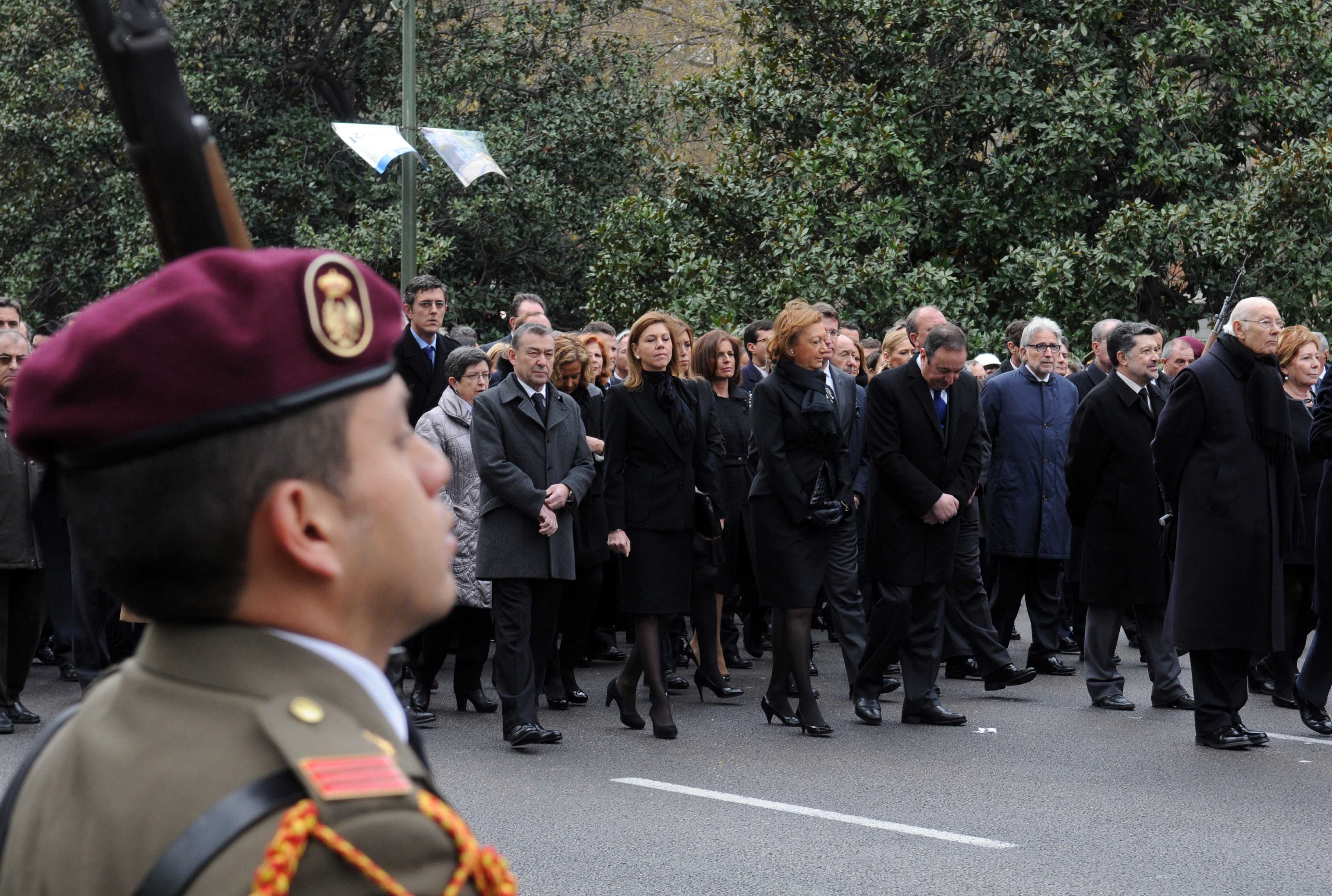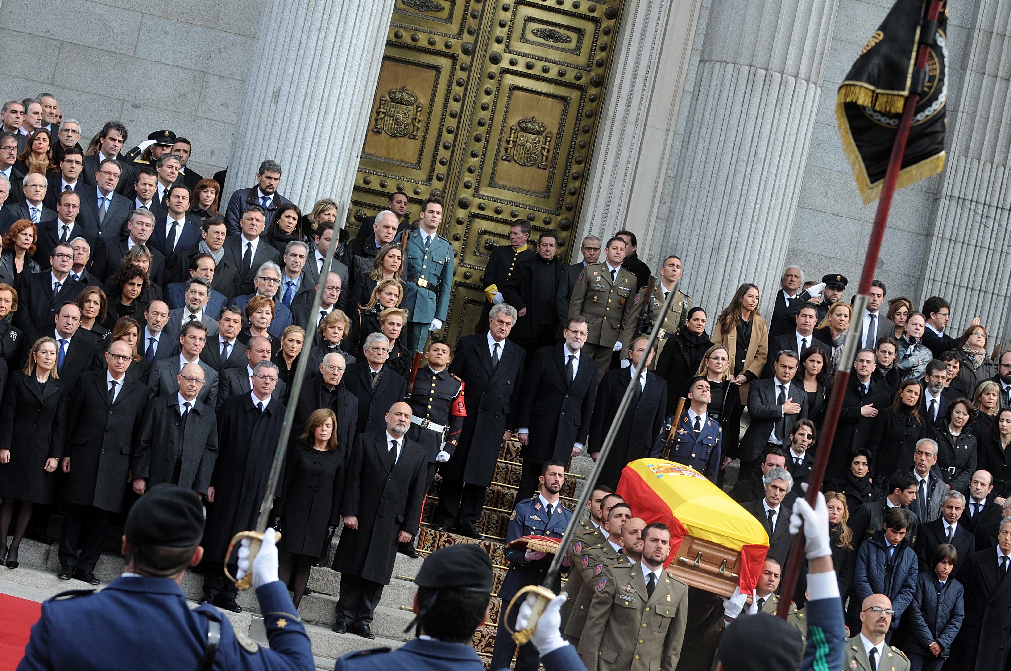 El coche fúnebre y el cortejo con la familia en otros vehículos han sido despedidos entre los aplausos de los ciudadanos y de las autoridades, entre las que hay que destacar al presidente del Gobierno, Mariano Rajoy; los presidentes del Congreso y del Senado, Jesús Posada y Pío García Escudero, respectivamente, la práctica totalidad de los ministros y numerosos presidentes autonómicos.