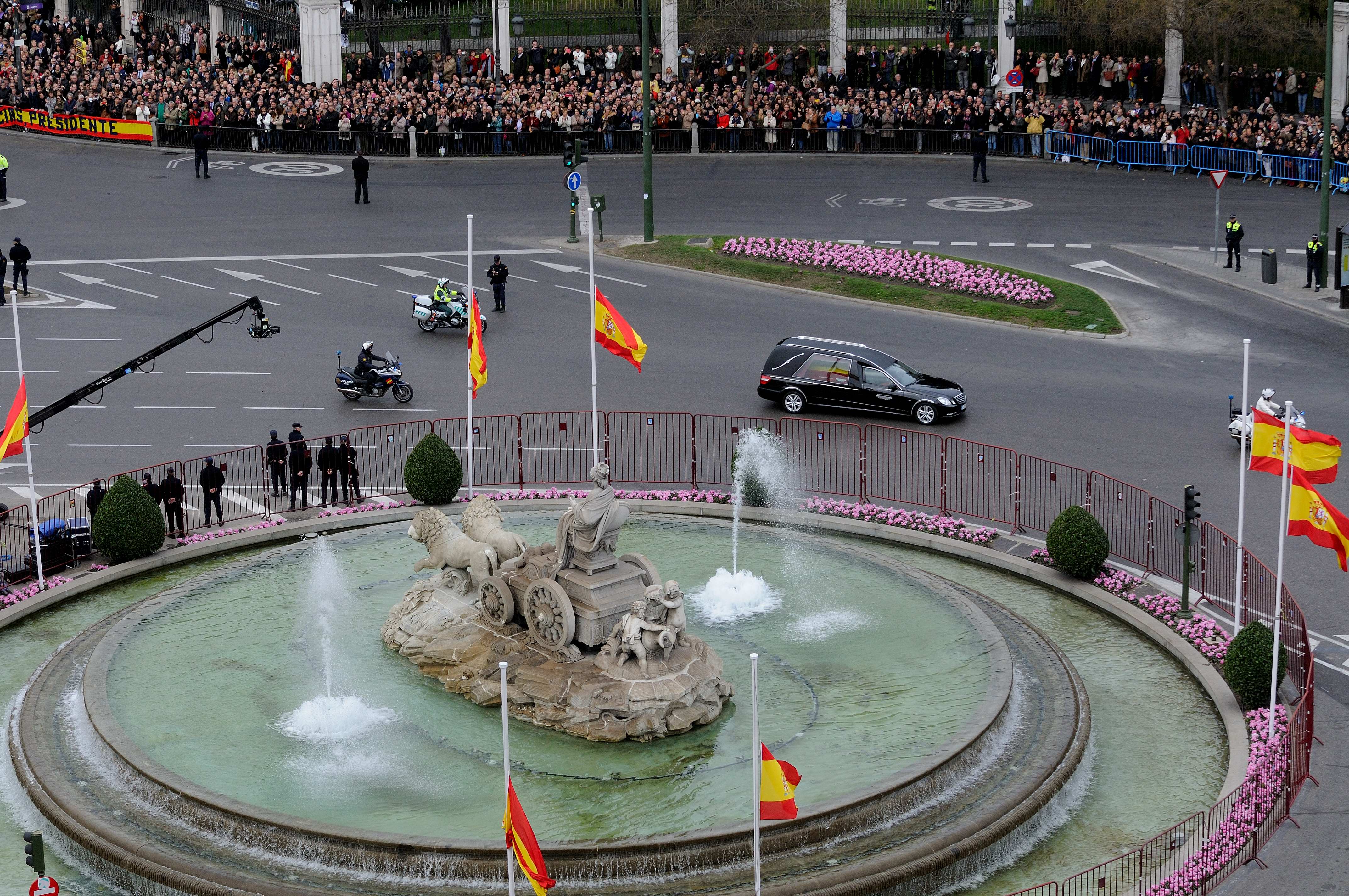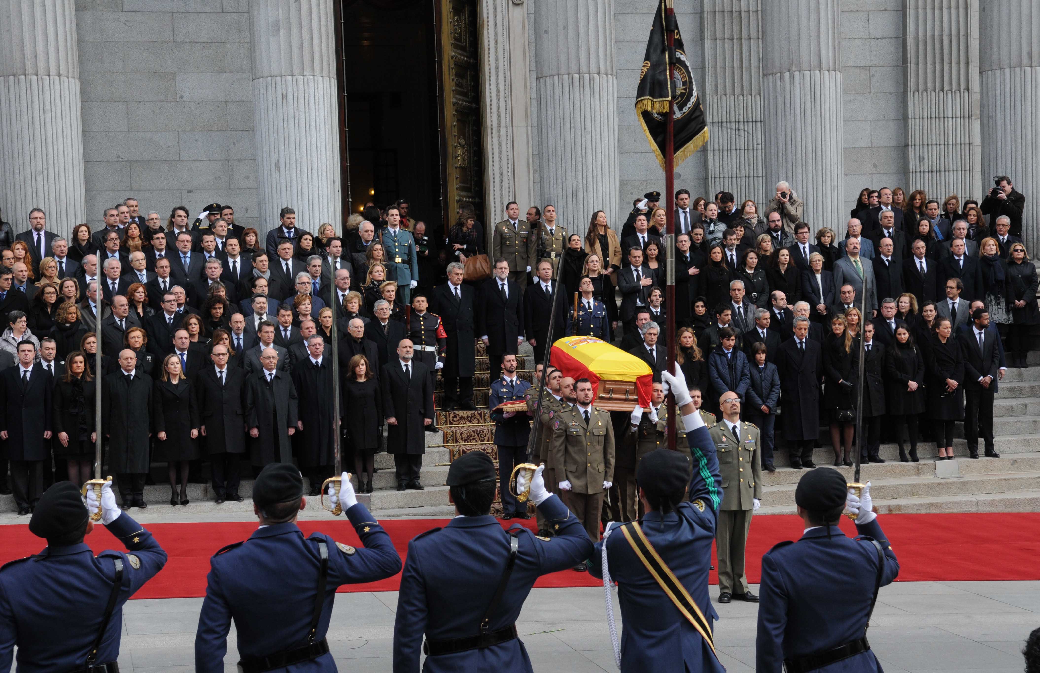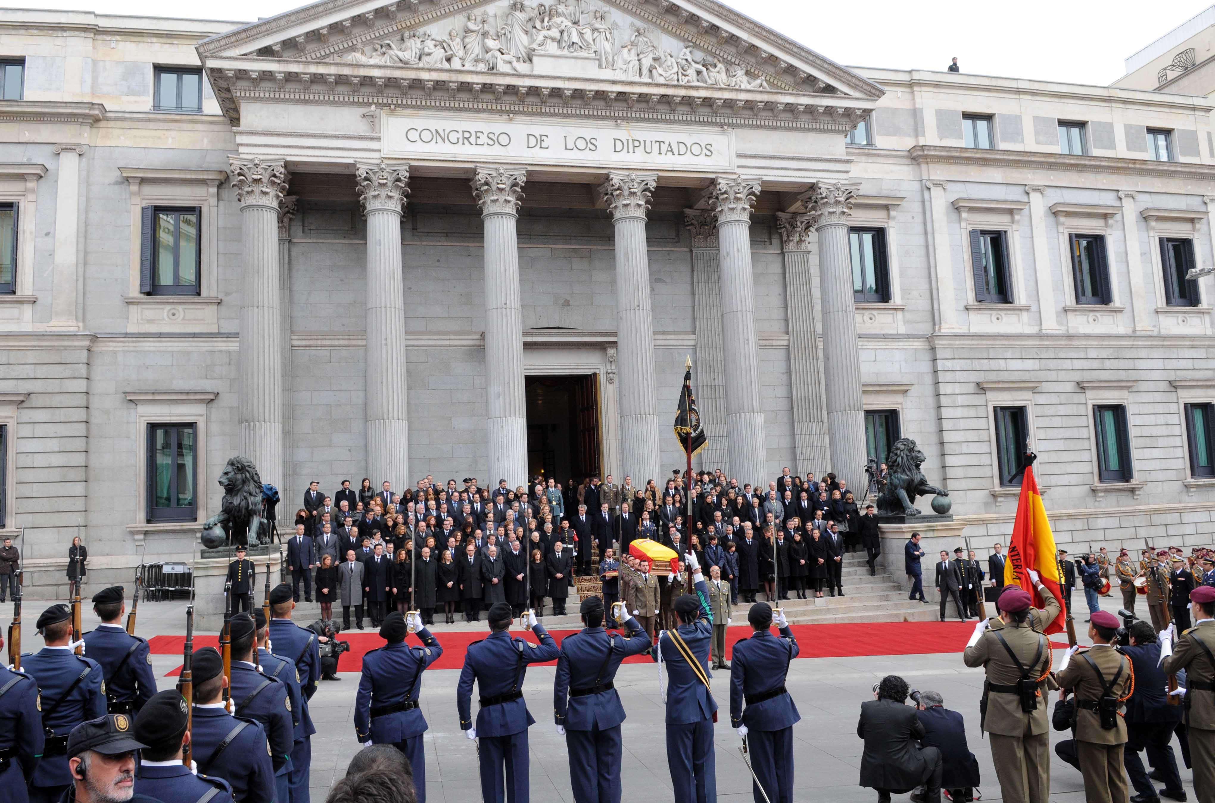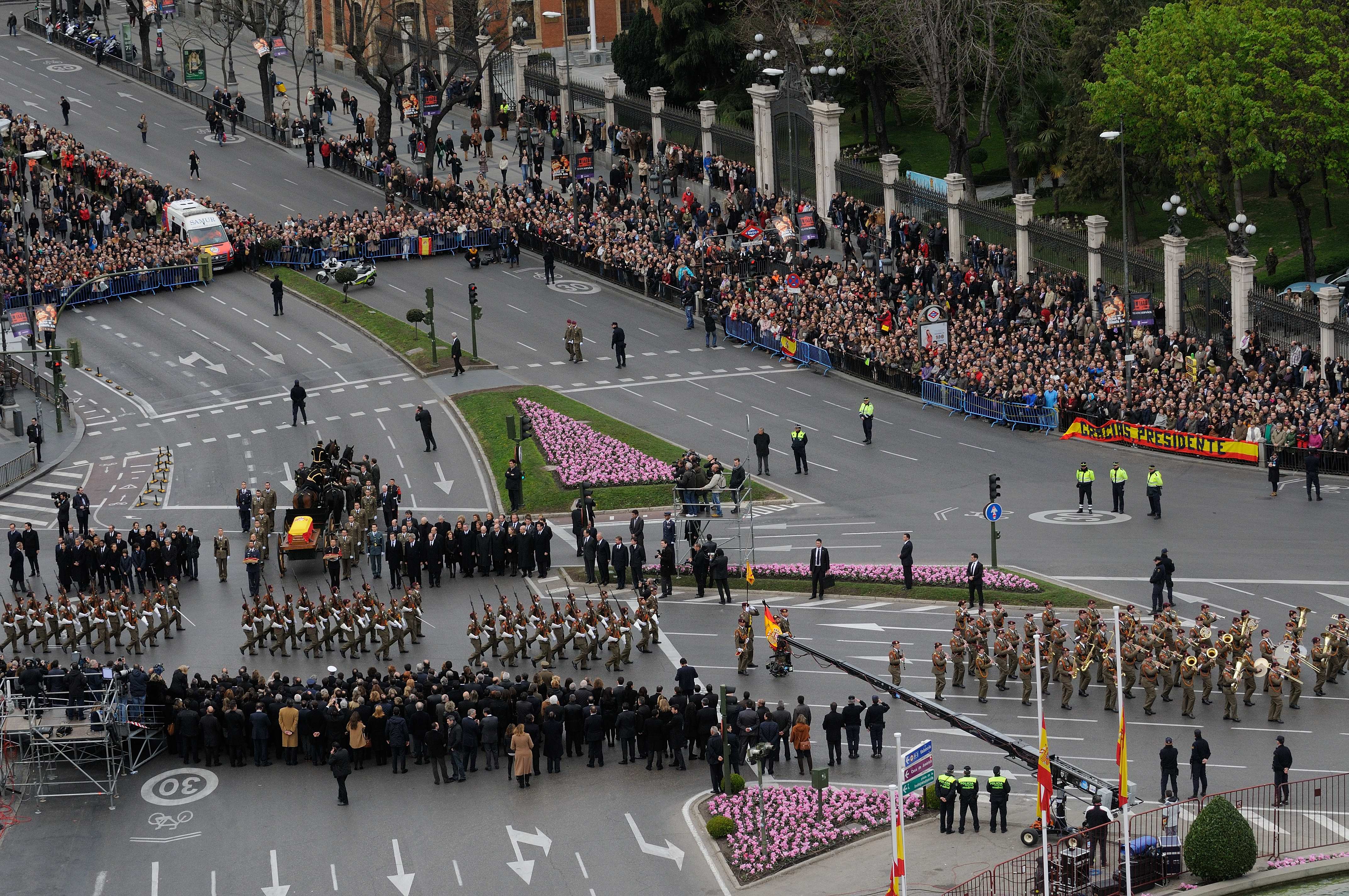 El cortejo fúnebre ha llegado a la plaza desde el Congreso de los Diputados, donde su cuerpo ha sido velado durante 24 horas y por donde han pasado decenas de miles de personas para rendir homenaje y despedirse del primer presidente de la actual Democracia española.