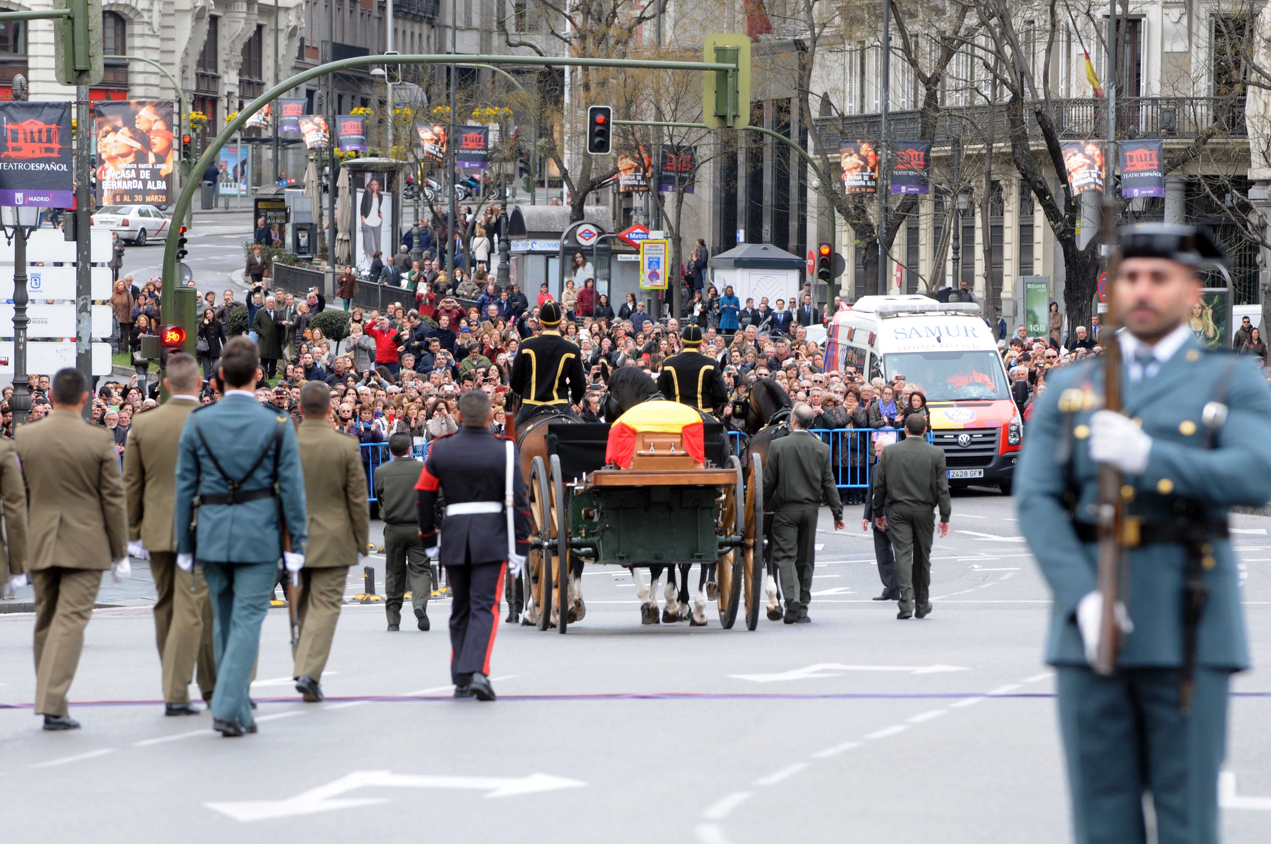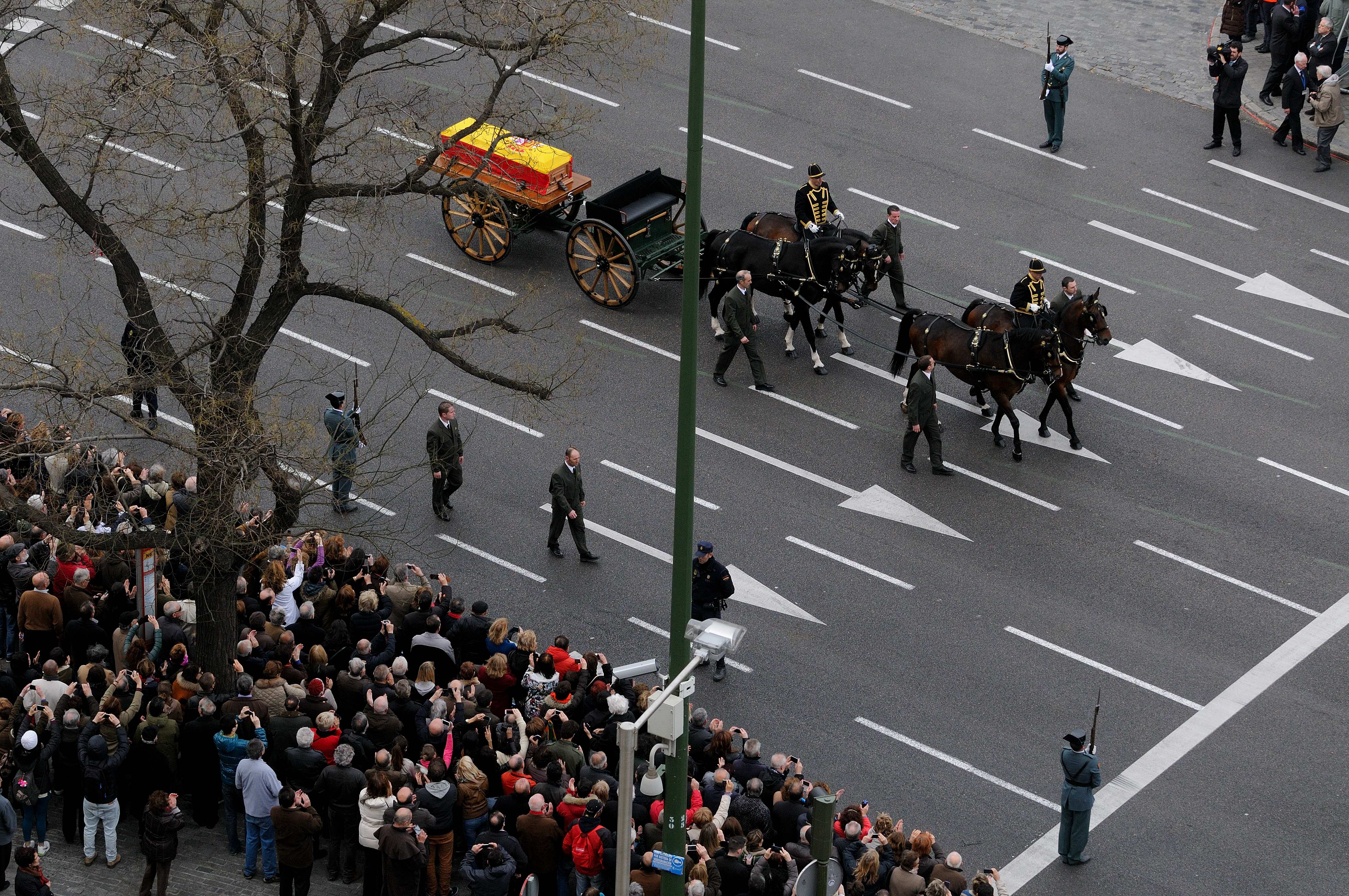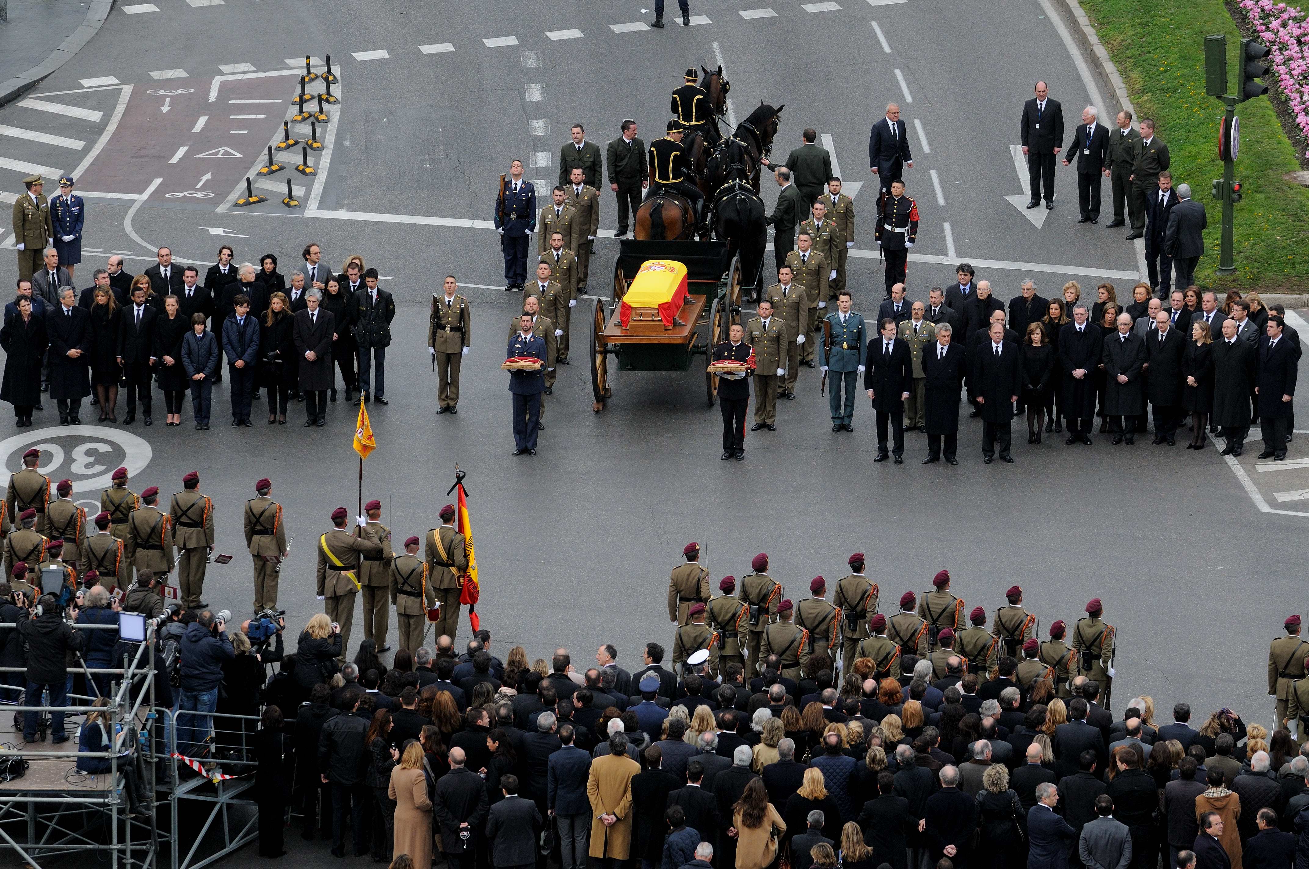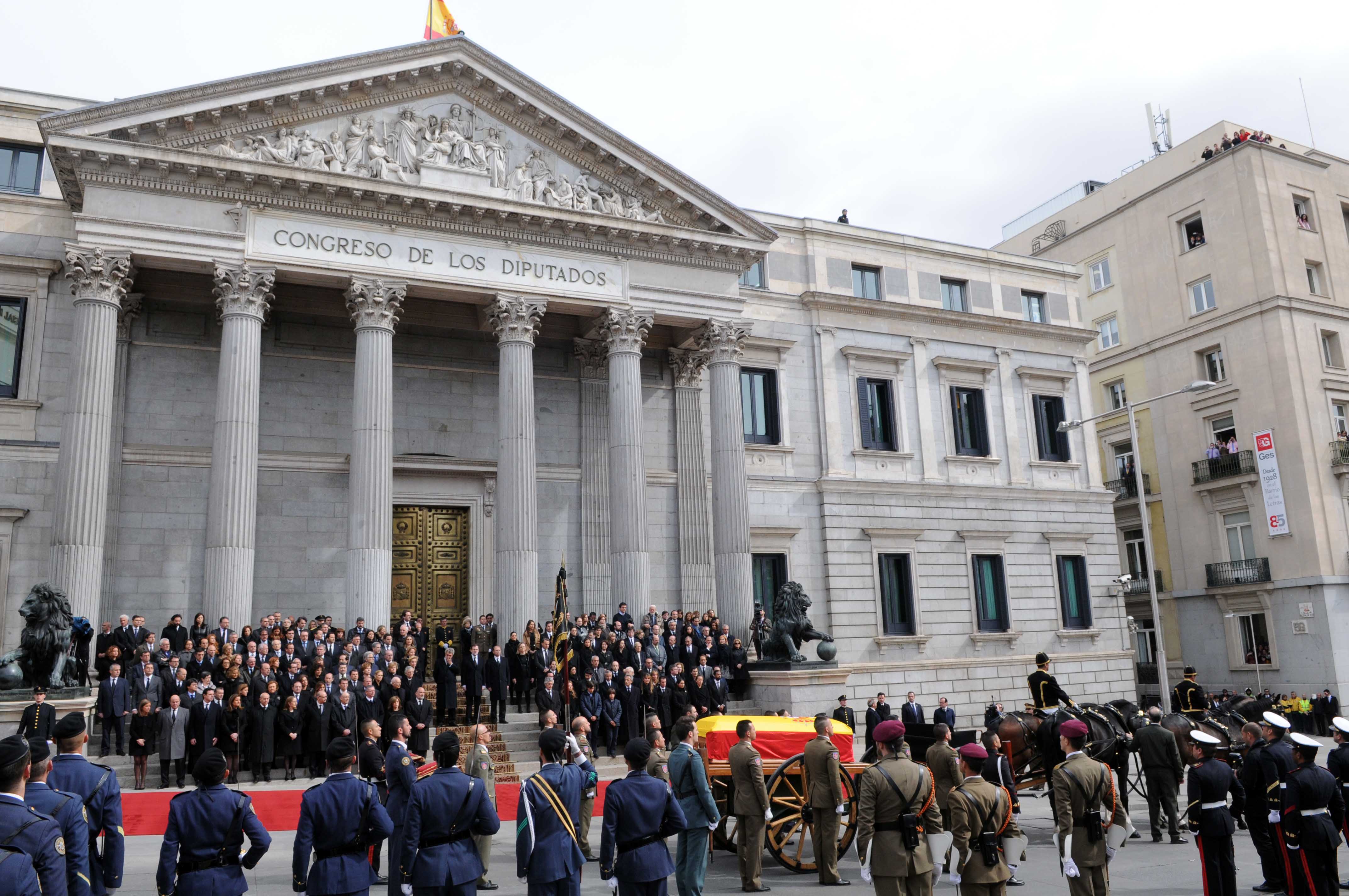 El cortejo fúnebre ha llegado a la plaza desde el Congreso de los Diputados, donde su cuerpo ha sido velado durante 24 horas y por donde han pasado decenas de miles de personas para rendir homenaje y despedirse del primer presidente de la actual Democracia española.