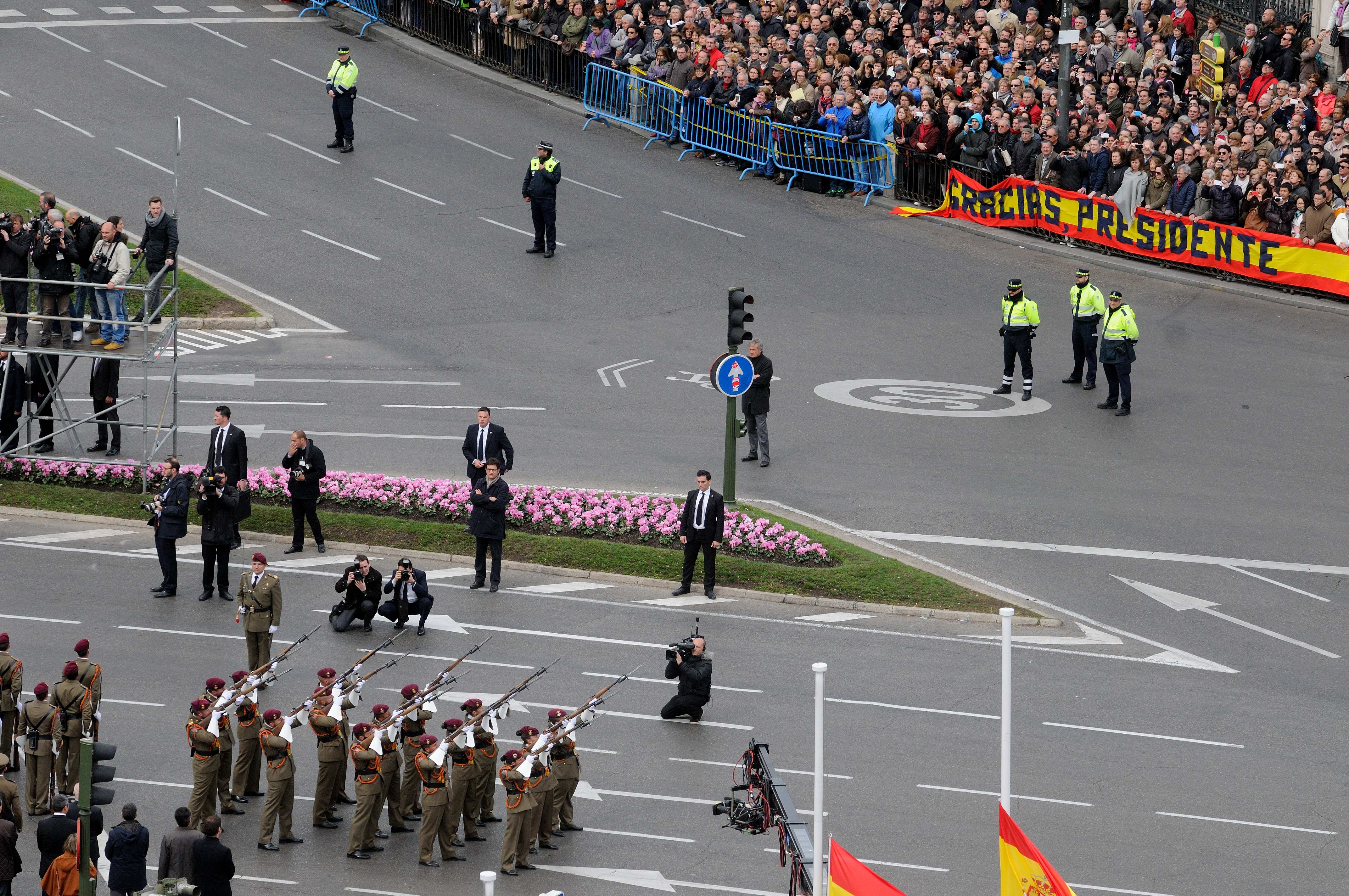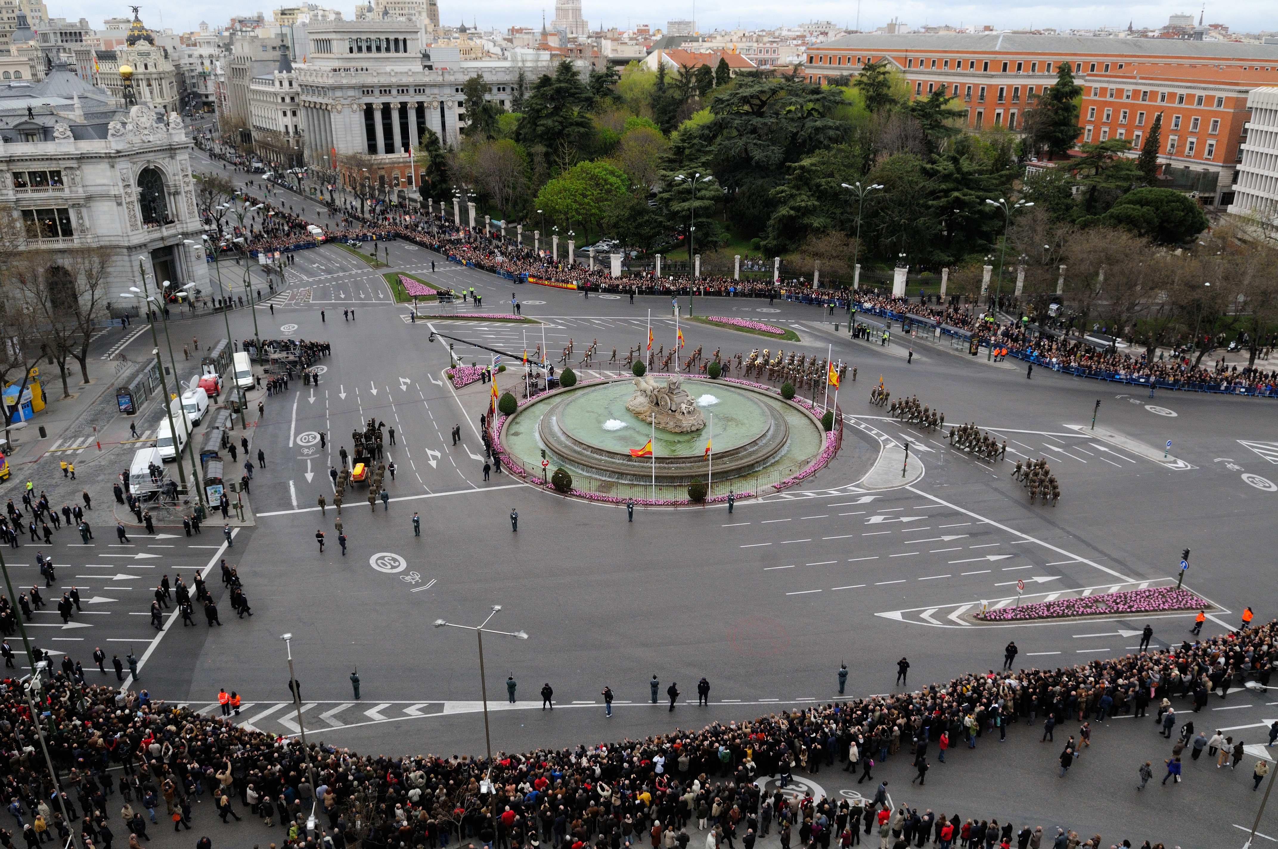 En Cibeles, el armón de artillería con el féretro ha quedado acompañado, a un lado, por la familia Suárez, y a otro por las principales autoridades presentes. La compañía que escolta el cortejo, del Ejército de Tierra, ha dado un toque de oración y la descarga de fusilería en honor del expresidente. A continuación, al son de música militar, ha desfilado por última vez ante el féretro.